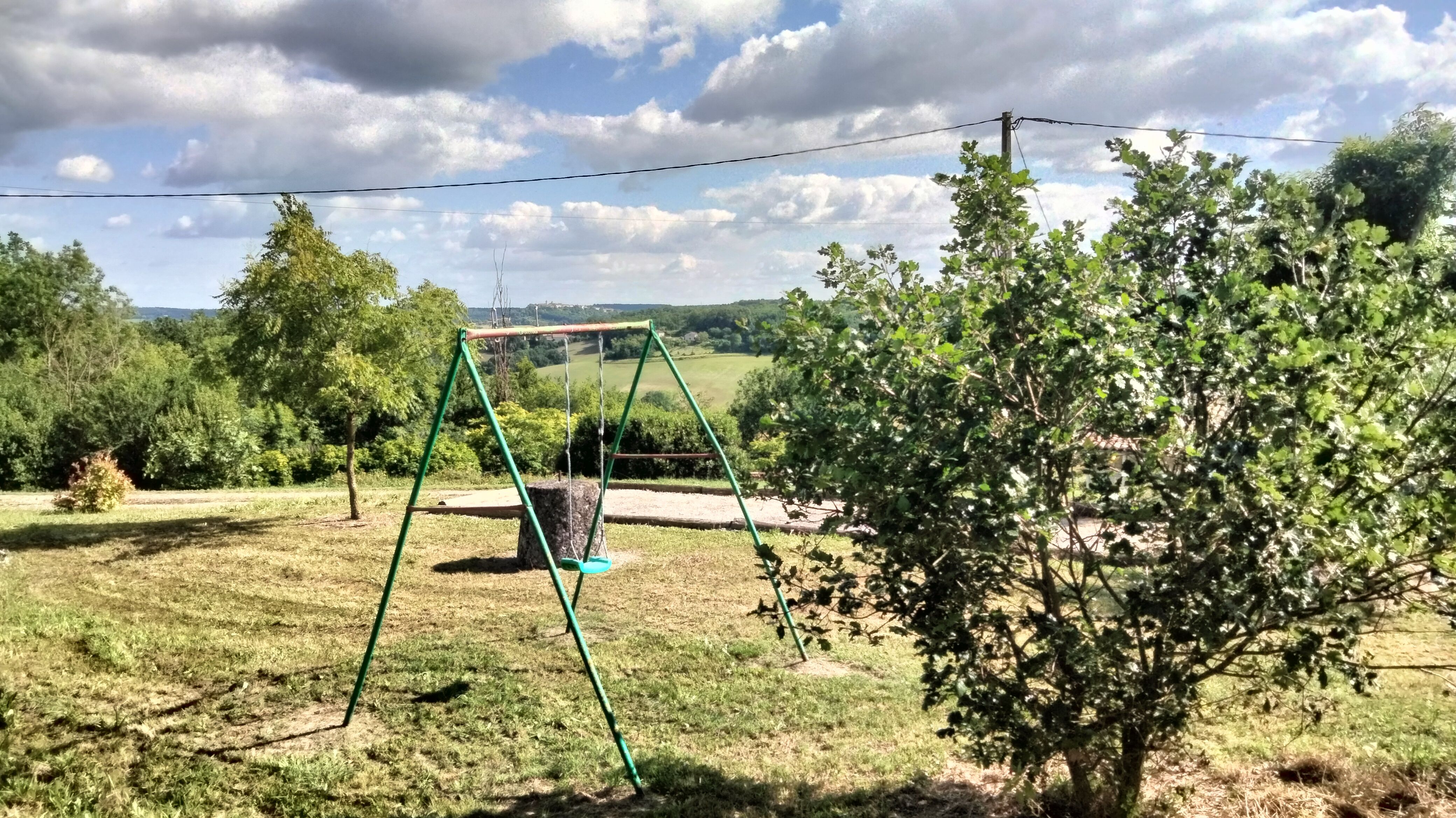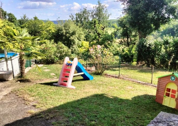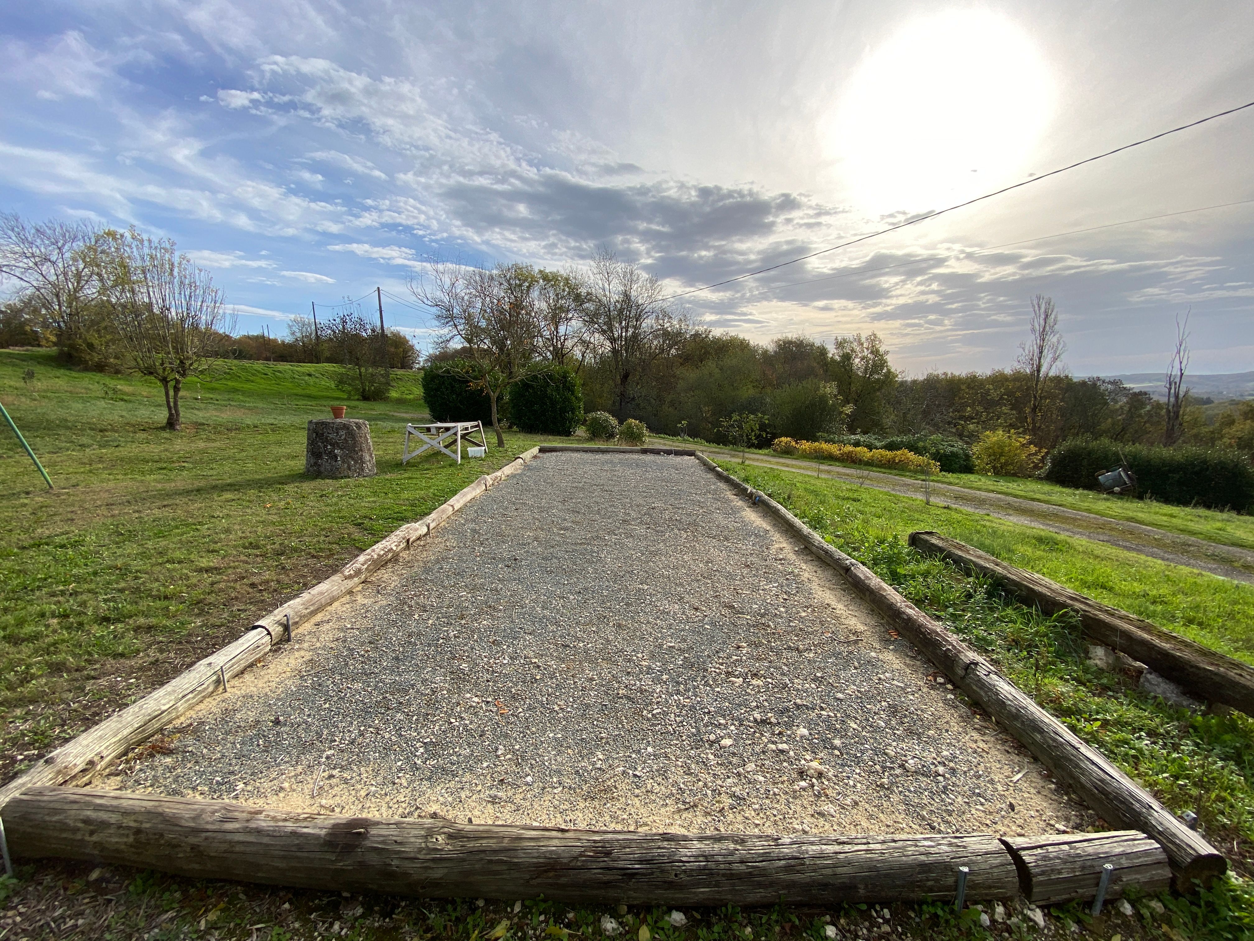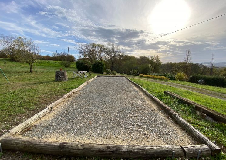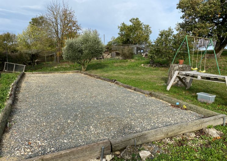 Grand espace vert privé contigu au chemin d’arrivée avec boulodrome et portique.