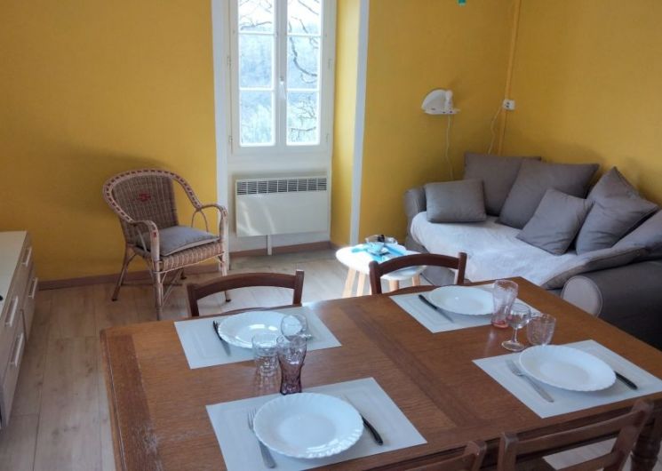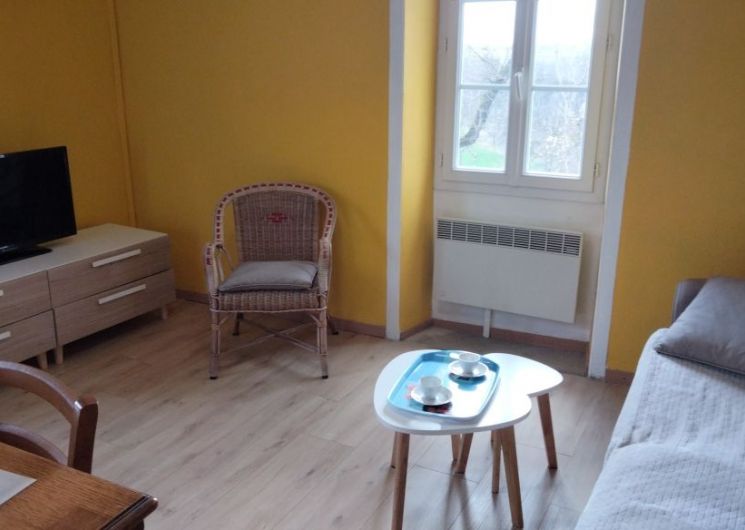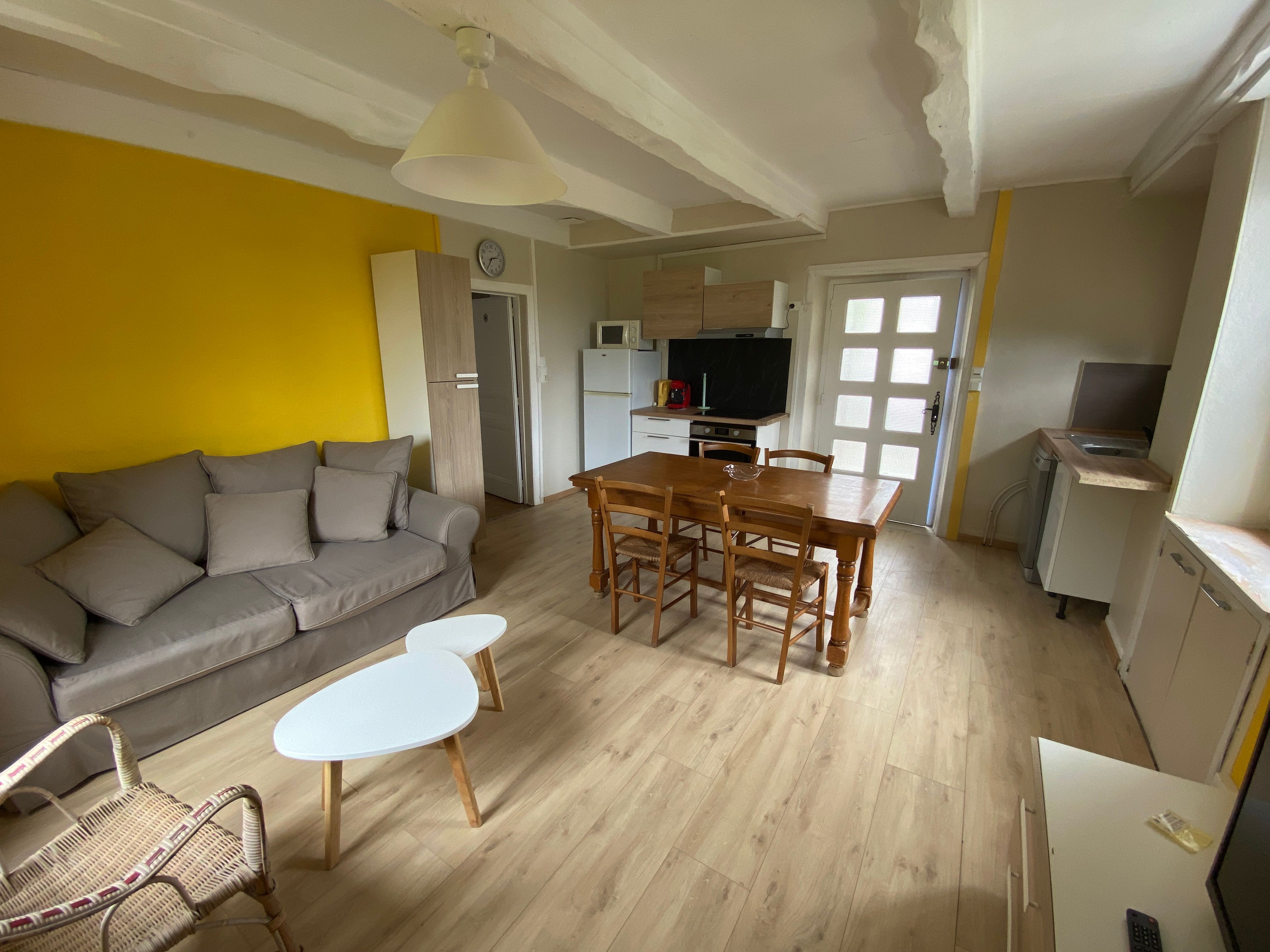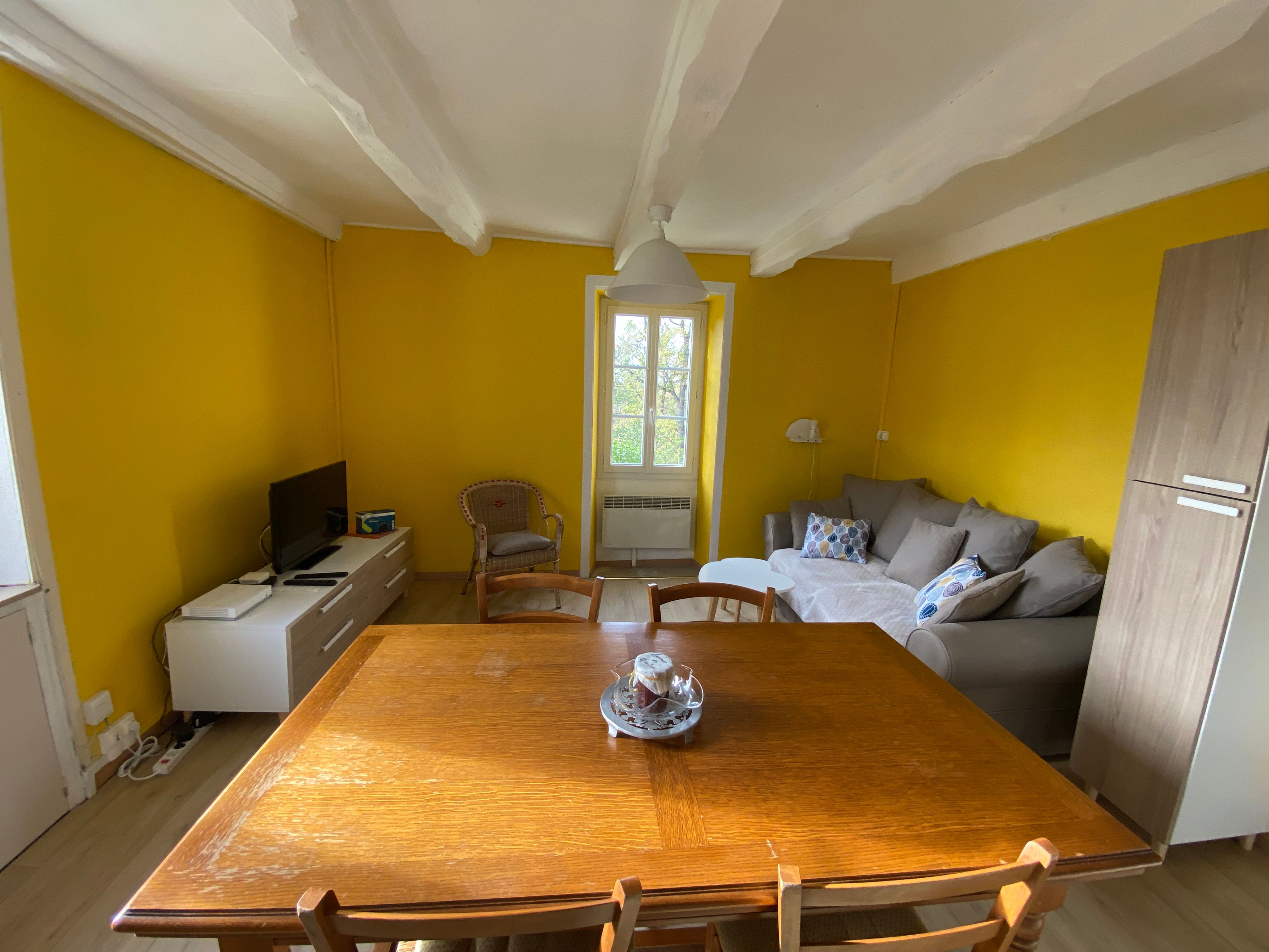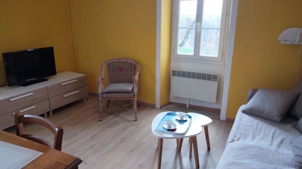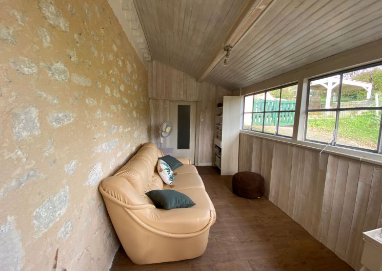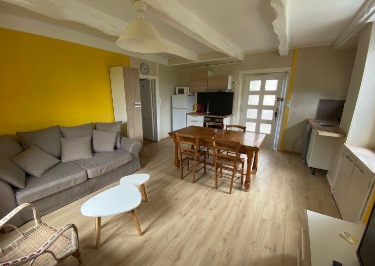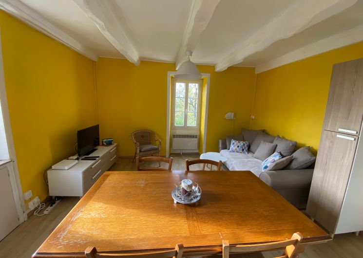 Le logement entièrement en rez-de-chaussée se compose d’une pièce à vivre au ton ensoleillé avec :