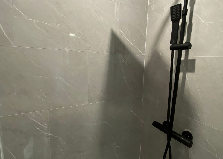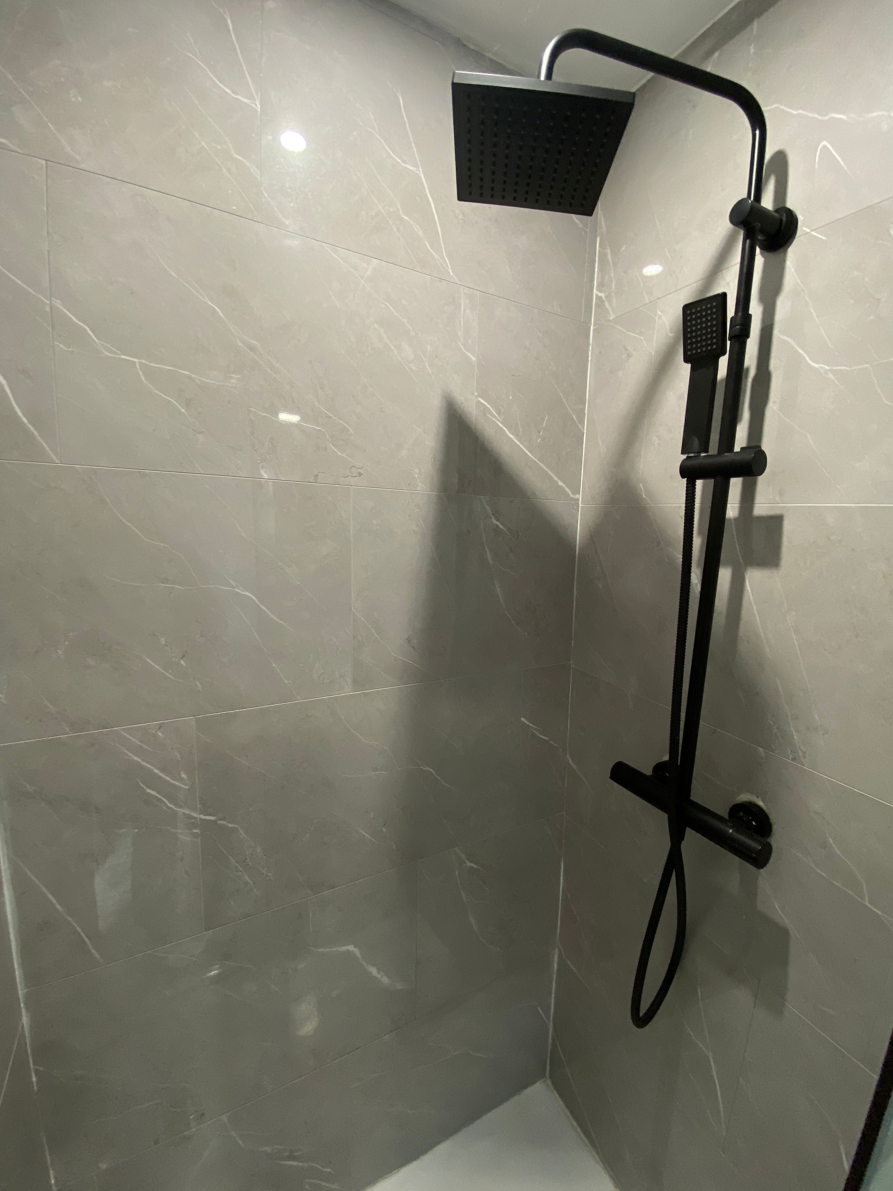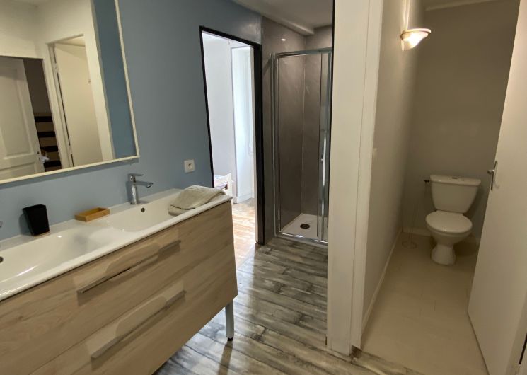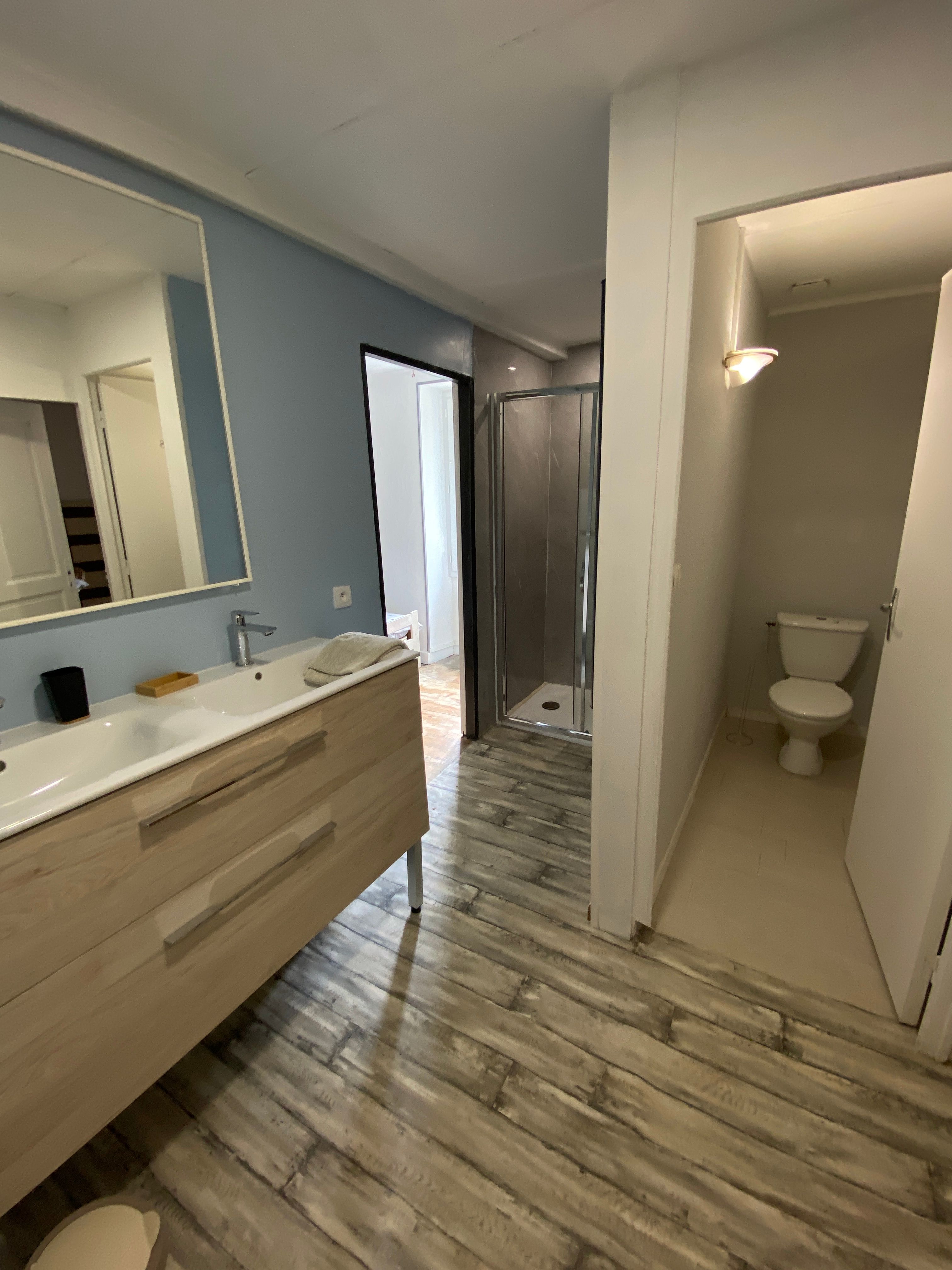 Une salle d’eau communicante aux deux chambres avec douche et deux vasques. Un wc dans la salle d’eau mais séparés.