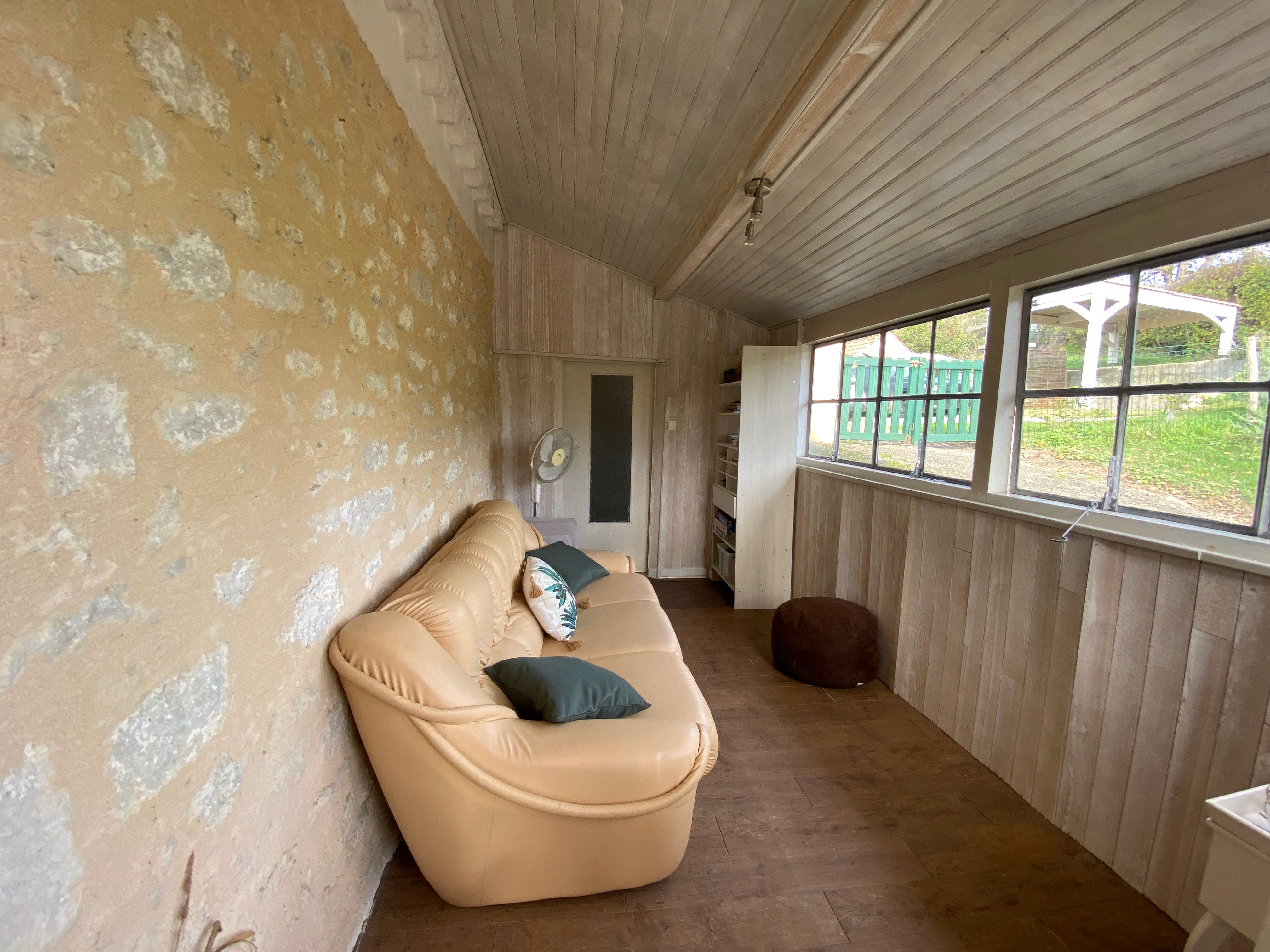 Véranda fermée avec canapé ; livres et jeux pour enfants.