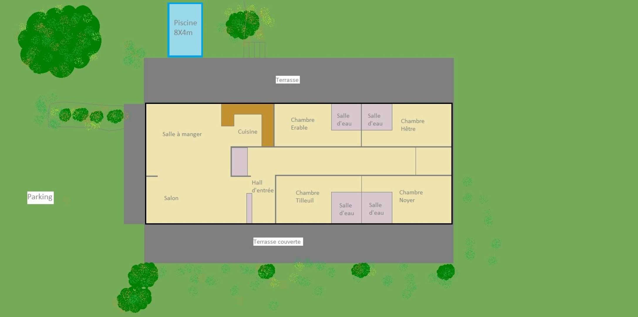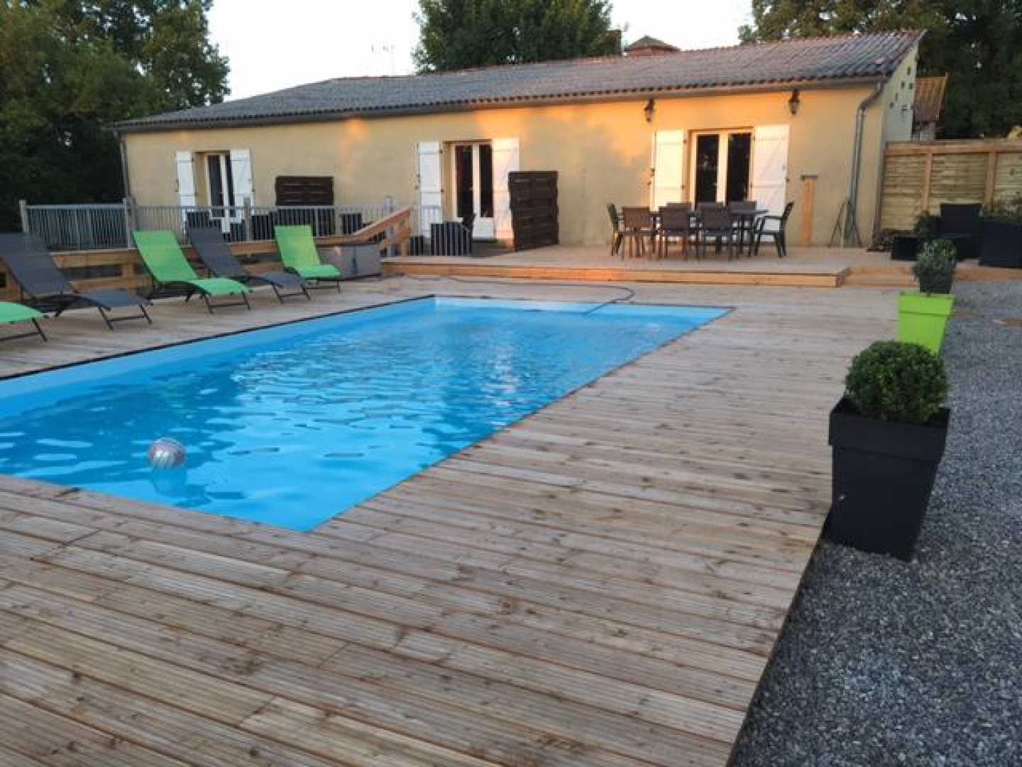 A l’extérieur : deux grandes terrasses, l’une est couverte à l’avant de la maison et donne sur le jardin. L’autre terrasse à l’arrière, côté cuisine, donne sur la piscine privative. Grand espace clos avec terrain de pétanque, salon de jardin, barbecue et plancha. Piscine 8×4, ouverte toute l’année, elle est chauffée de fin mai à fin septembre selon météo.