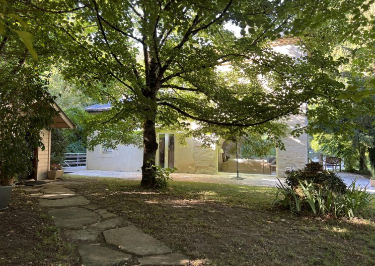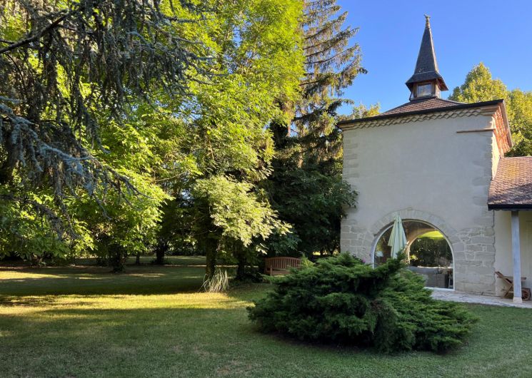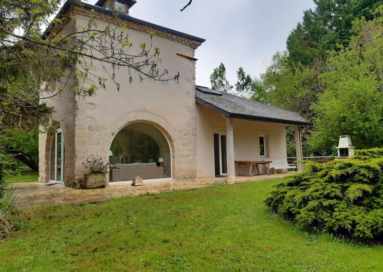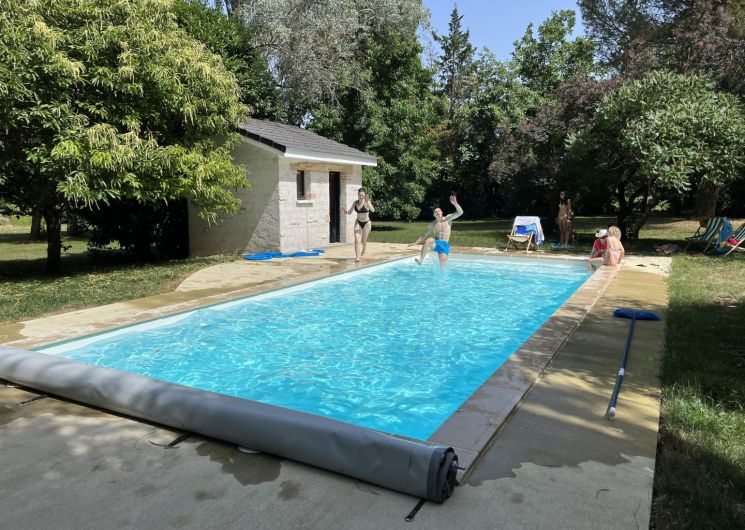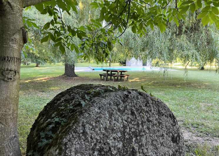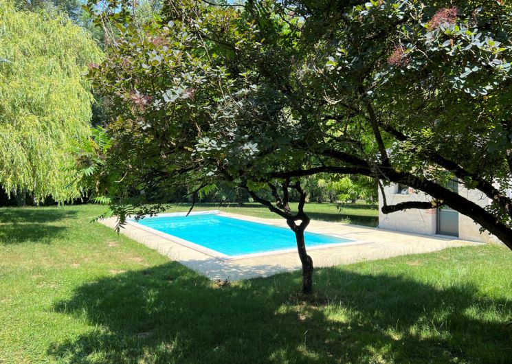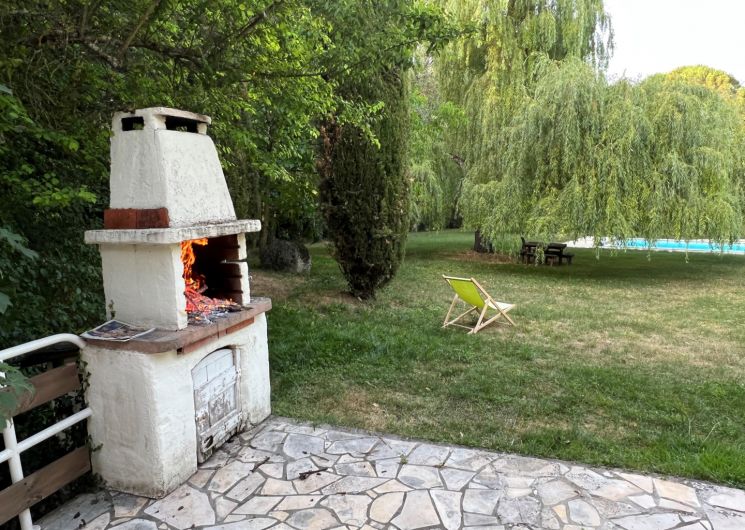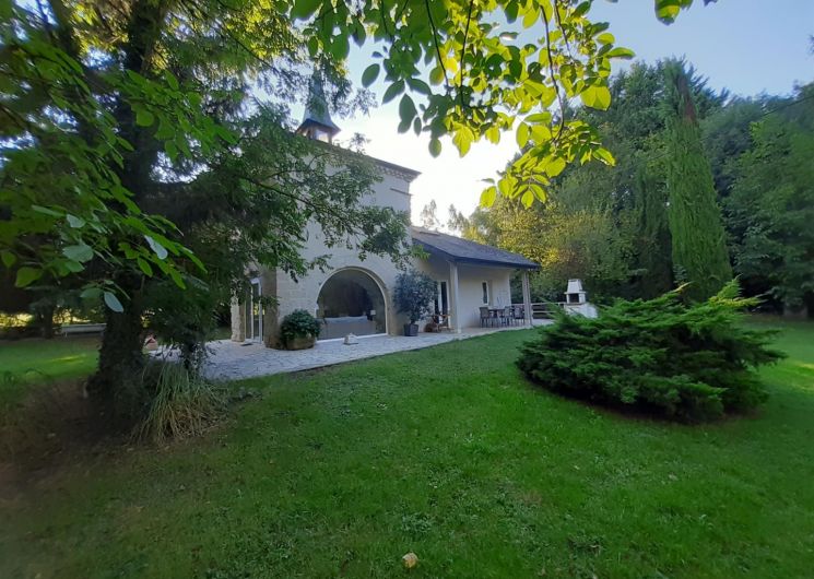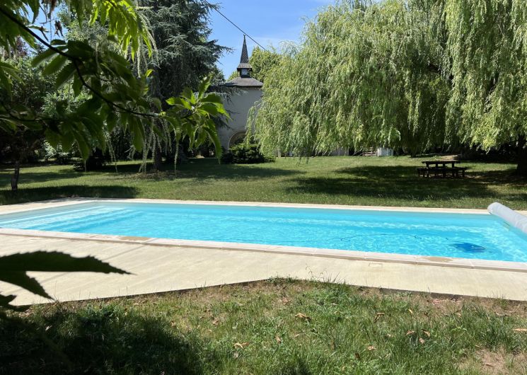 Grand parc arboré, terrasses tout autour du pigeonnier, boulodrome éclairé pour le soir, salon de jardin, barbecue. La piscine est sécurisée par une bâche à barres et traitée avec un produit non agressif : hypochlorite de calcium.