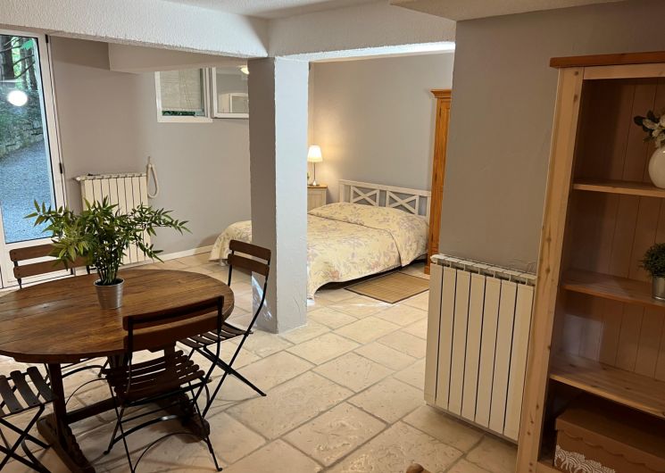On accède à la partie inférieure par l’extérieur ou par un escalier meunier depuis l’entrée. Là, on trouve un studio (50m²) avec 4 couchages (un lit double en 140 et une chambre placard avec deux lits simples en 90 superposés), un coin cuisine, fauteuil, TV, une salle d’eau (deux douches et double vasque), WC.