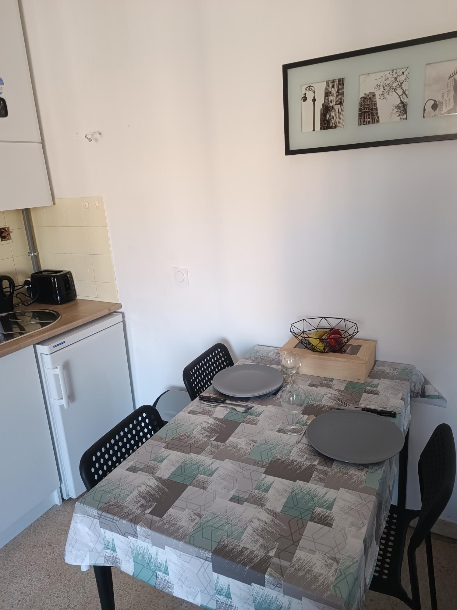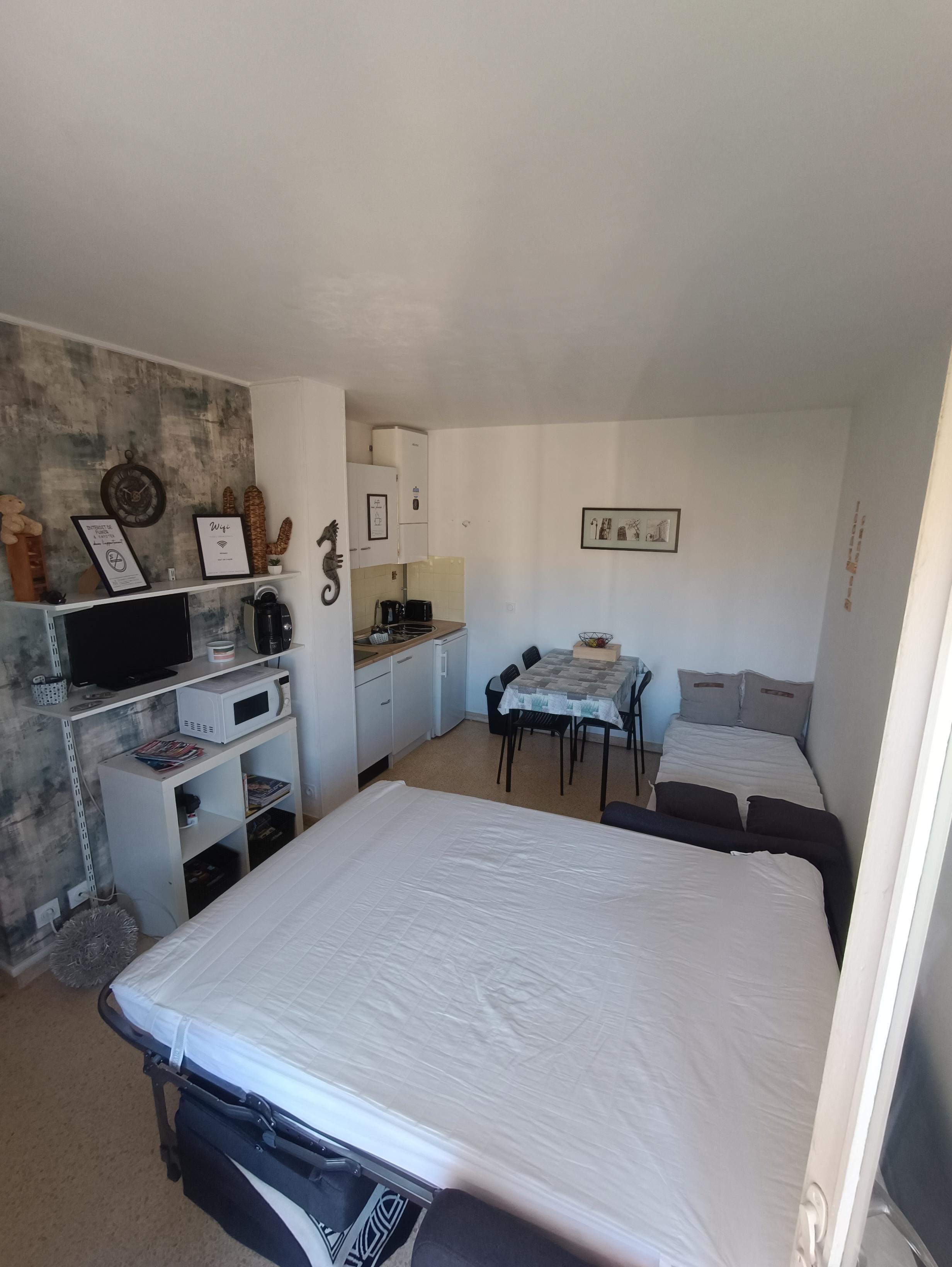 Studio en centre-ville, avec vue dégagée, situé à 100 m de la plage. Il peut accueillir jusqu’à 2 adultes et dispose de couchages adaptés pour enfants et bébé