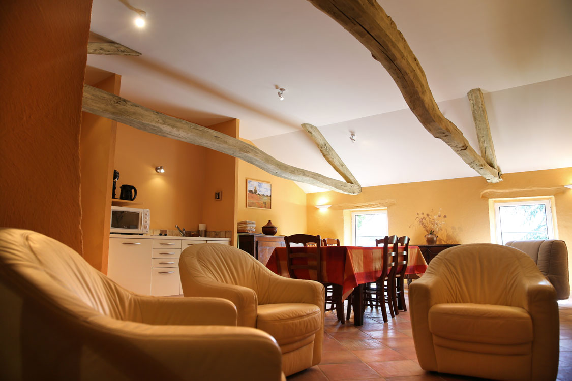 – 1 chambre (1 lit 1,60m) avec salle d’eau, – 1 chambre (1lit 1,40m) avec salle de bain et coin salon transformable en chambre familiale (lit d’appoint clic-clac 2 places), – 1 chambre (1 lit 1,60m) avec salle d’eau, – 1 chambre (1 lit 1,60m) avec salle de bain. Wc indépendant et privatif pour chaque chambre? – Coin cuisine / séjour / salon privatif et commun aux hôtes.