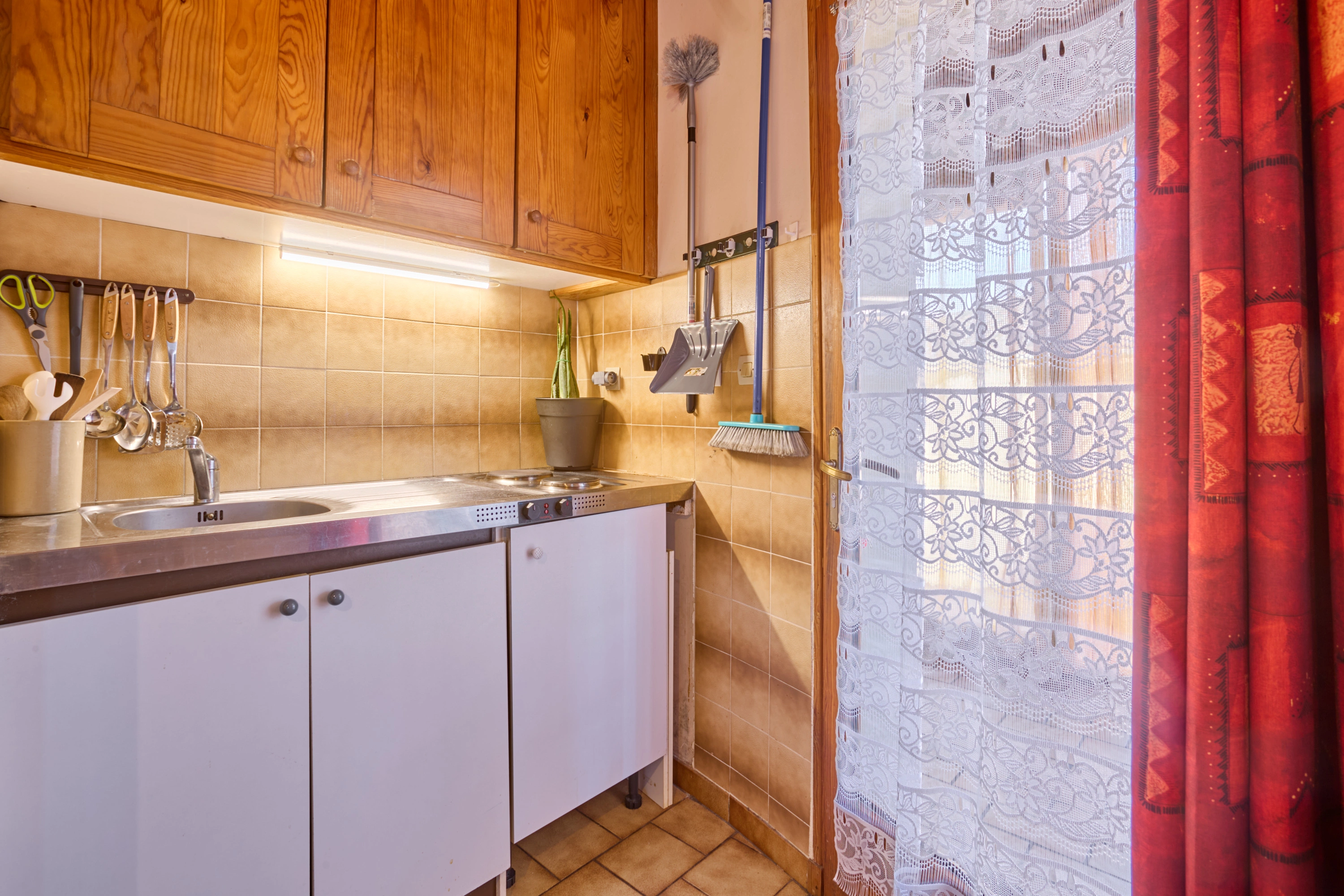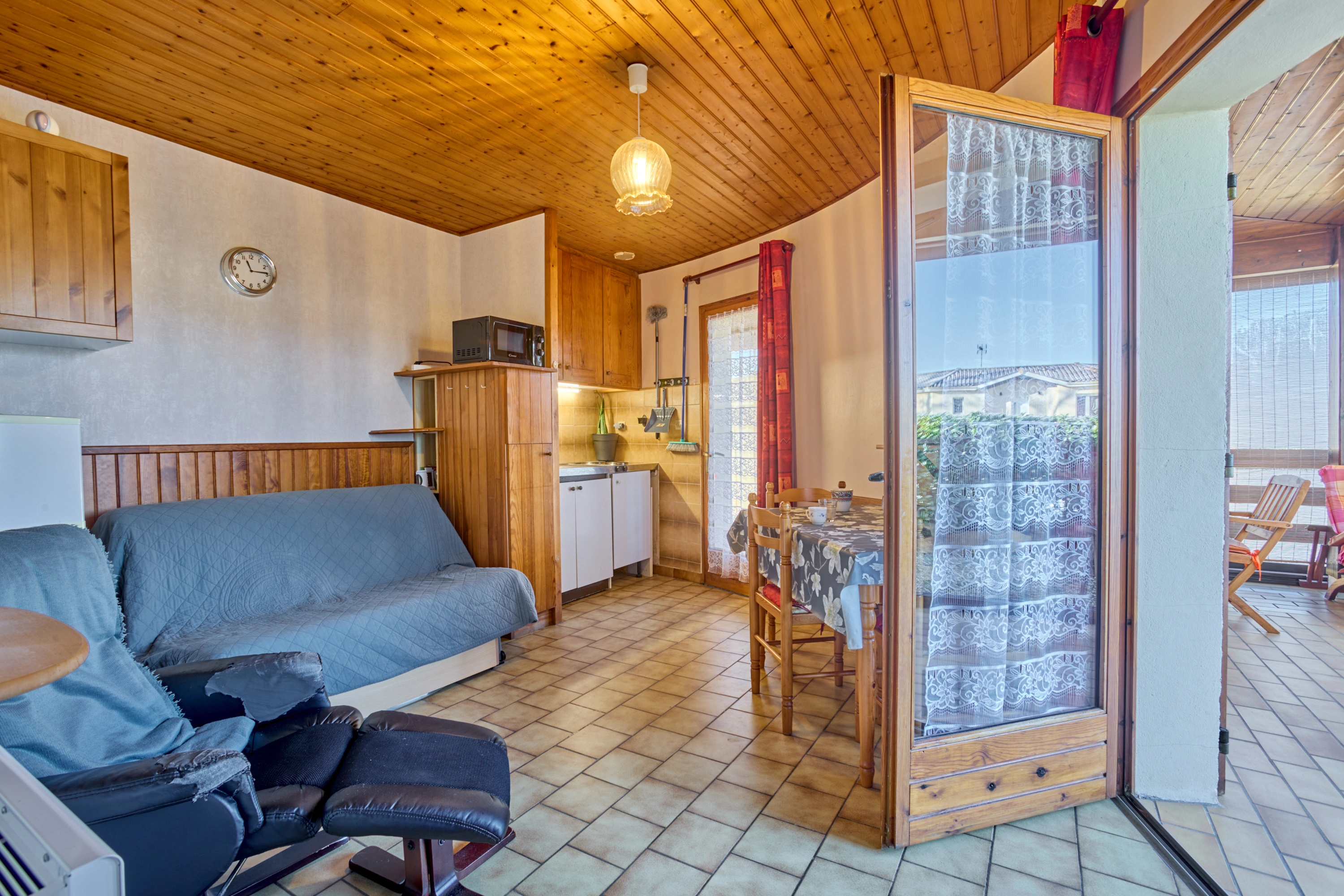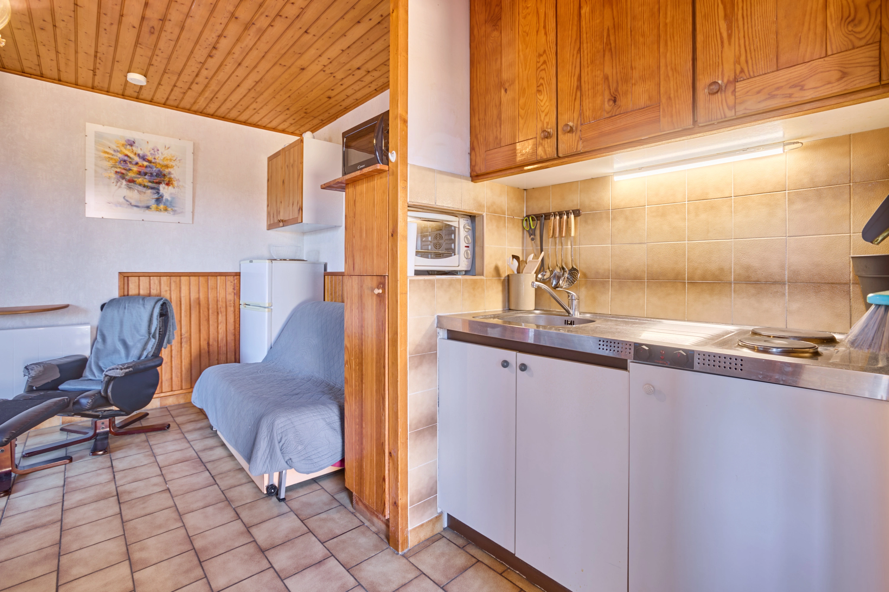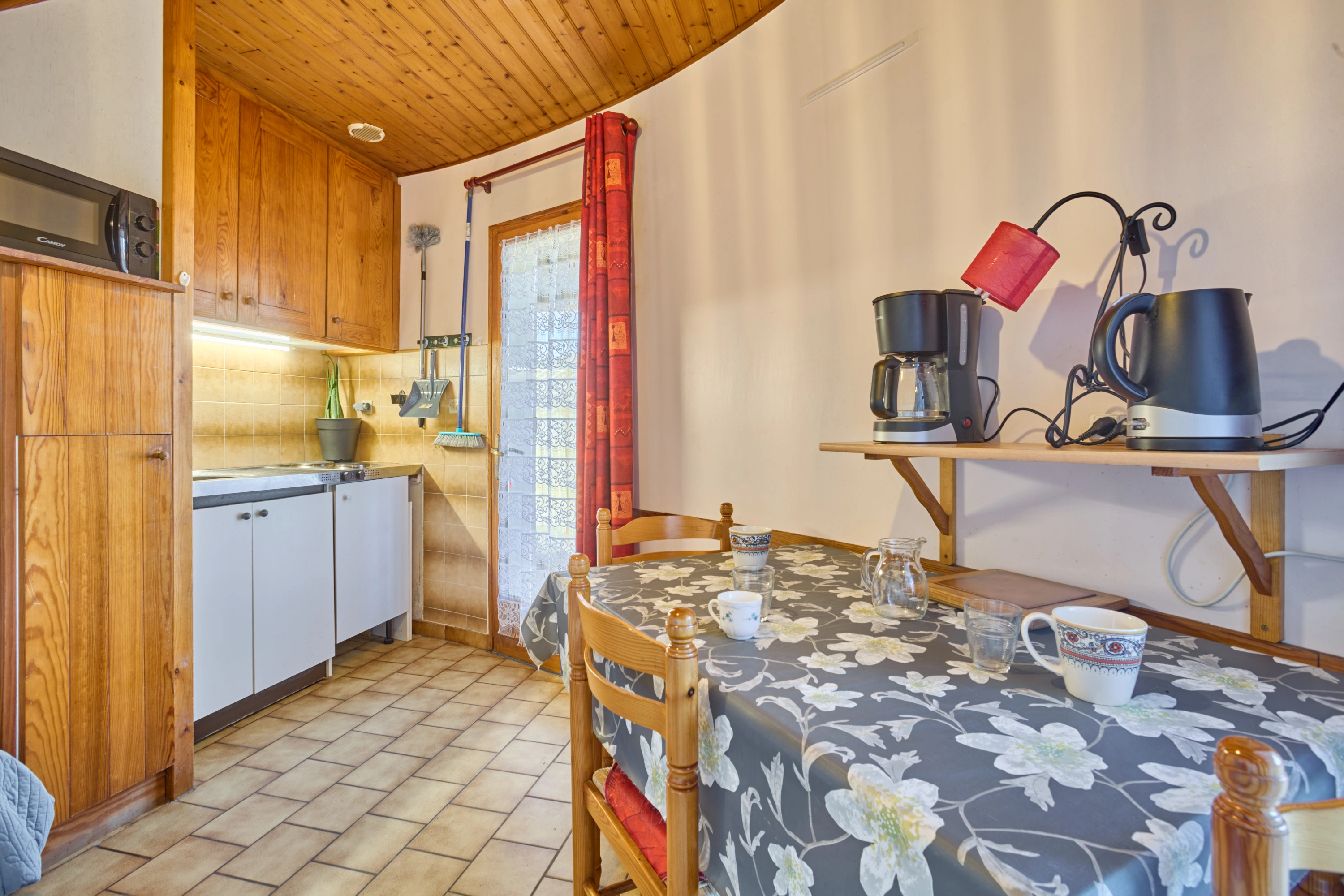 Sa pièce principale de 17m² vous accueille avec une kitchenette équipée de deux plaques électriques, d’un réfrigérateur/congélateur, un mini-four, un micro-onde, De plus vous y trouverez une banquette clic-clac, un fauteuil et son repose pieds, une TV, un table et quatre chaises.