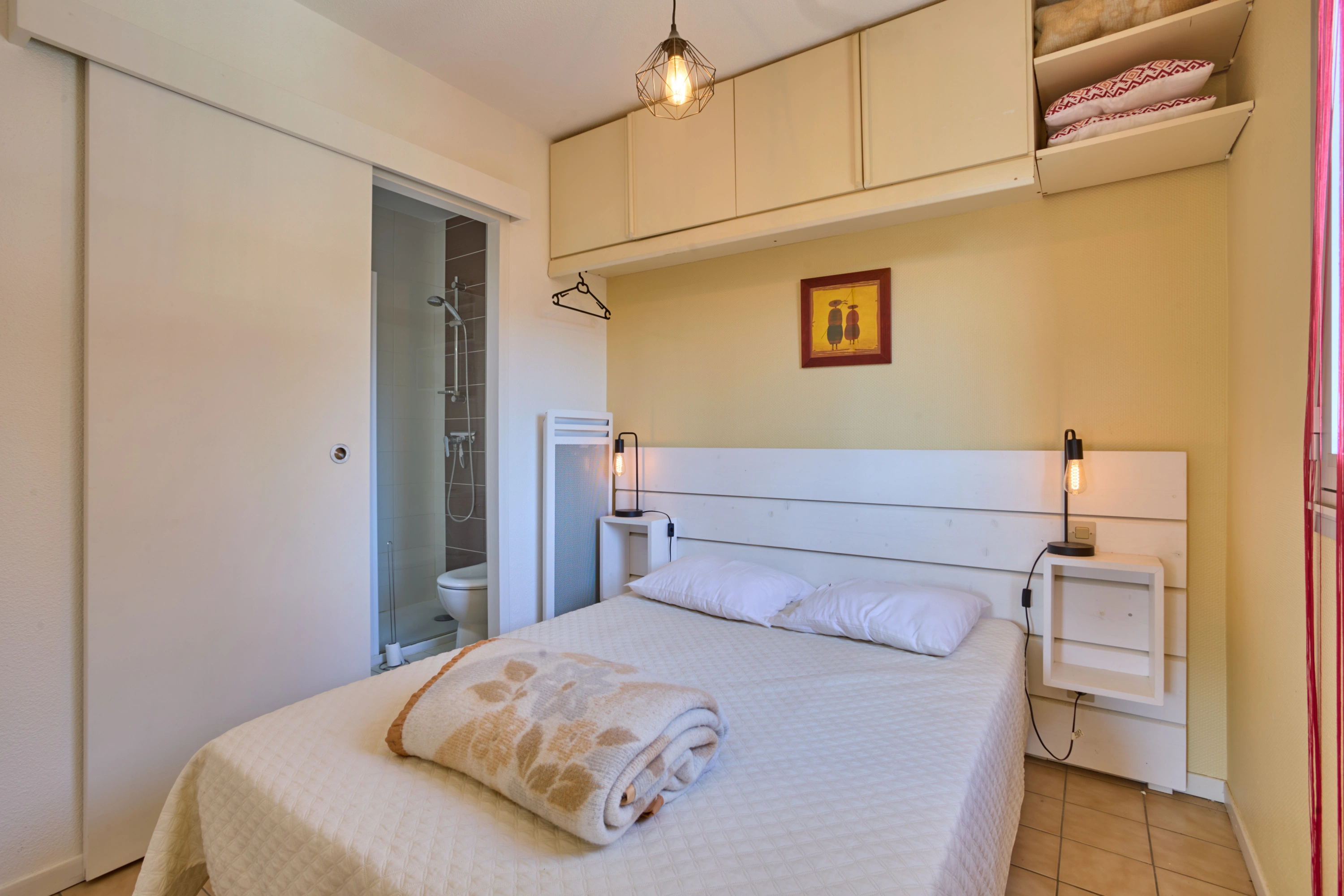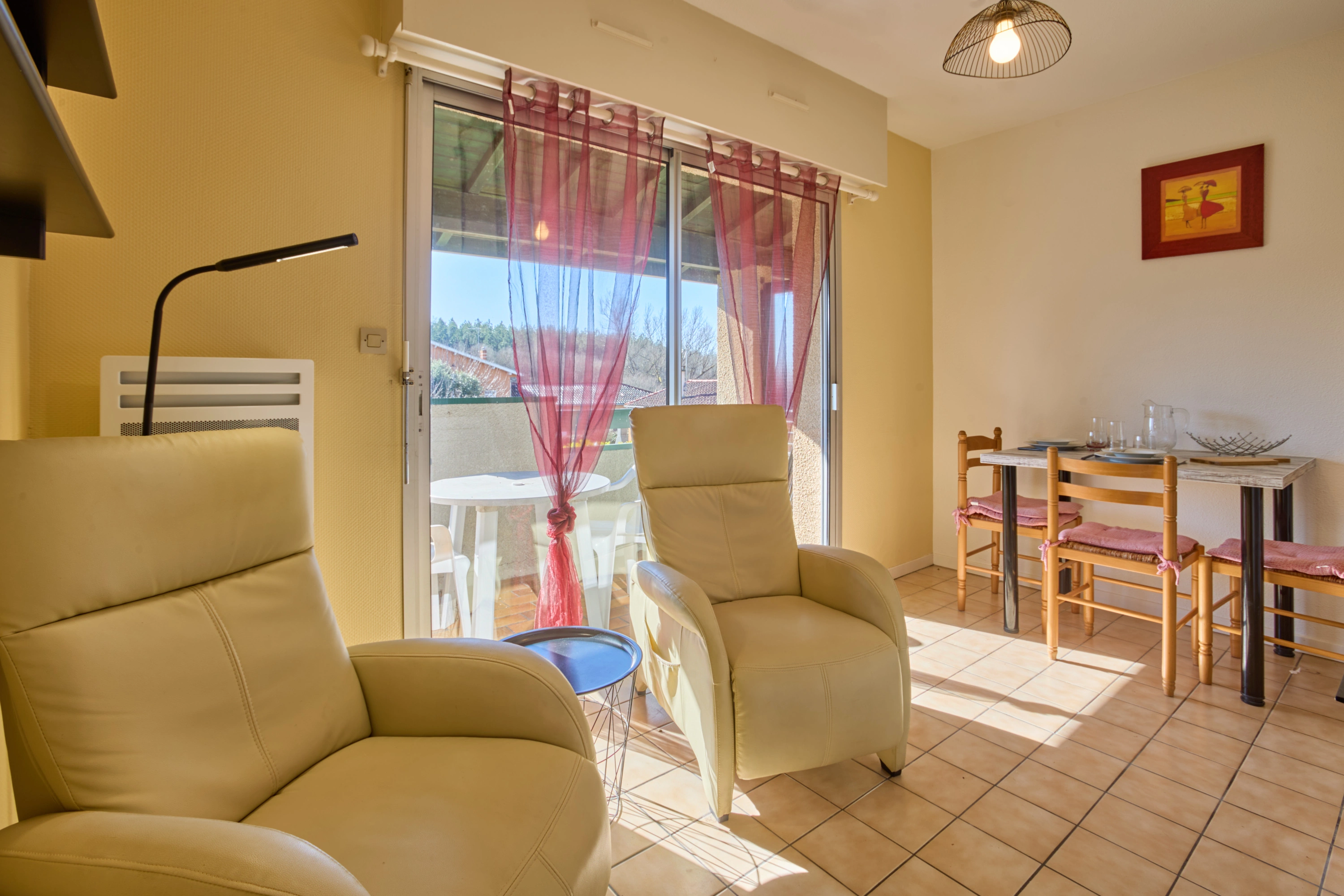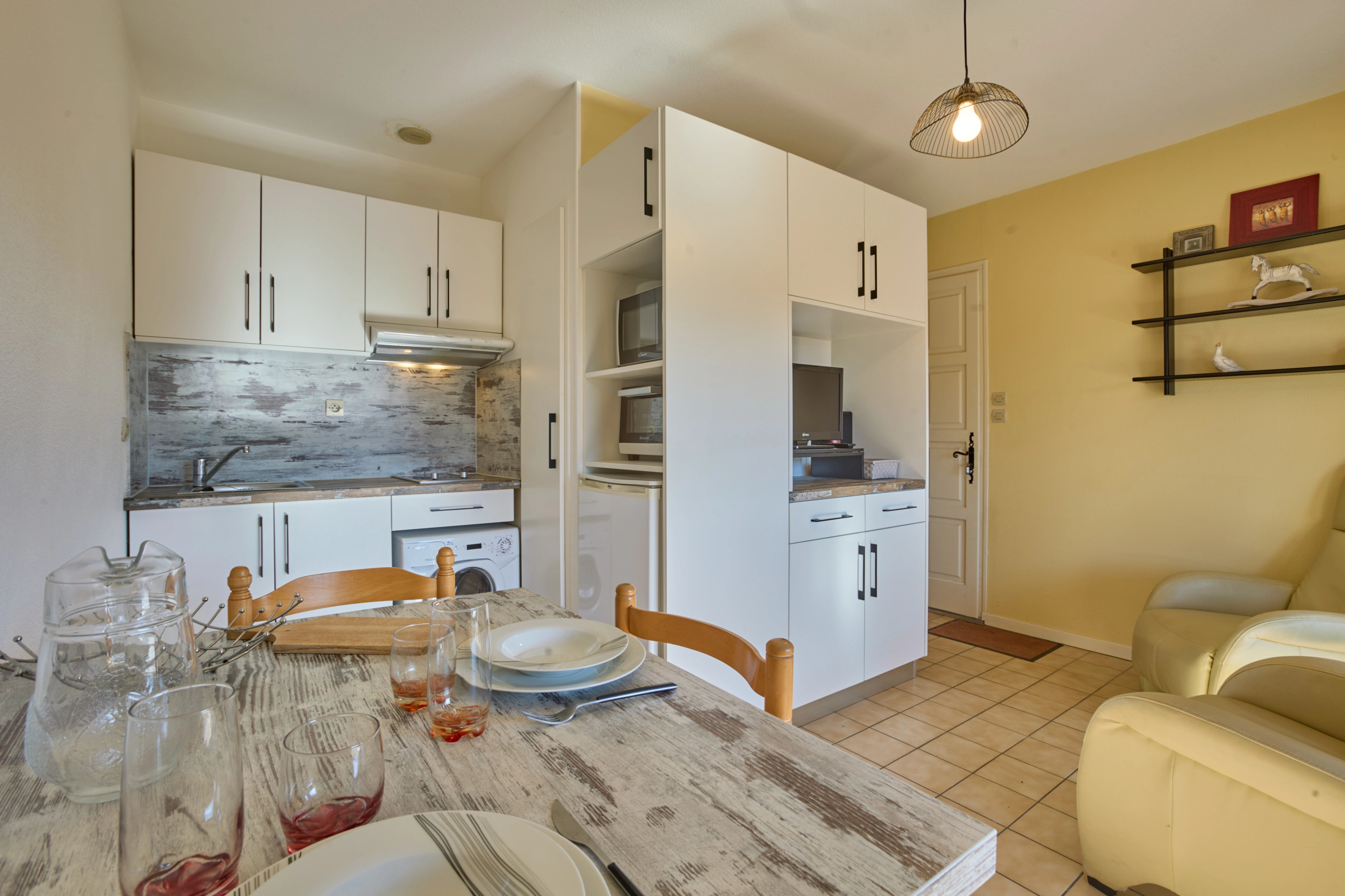 Ce T1 bis de 29,3 m² possède les avantages d’un T2 grâce à un coin nuit séparé avec fenêtre à l’est et salle d’eau privée. L’espace jour comprend un coin repas, deux fauteuils, une TV et une kitchenette équipée (réfrigérateur, micro-ondes, mini-four, lave-linge). Une grande baie vitrée donne sur un large balcon sud-est, idéal pour profiter d’une vue dégagée depuis un salon de jardin pour deux.