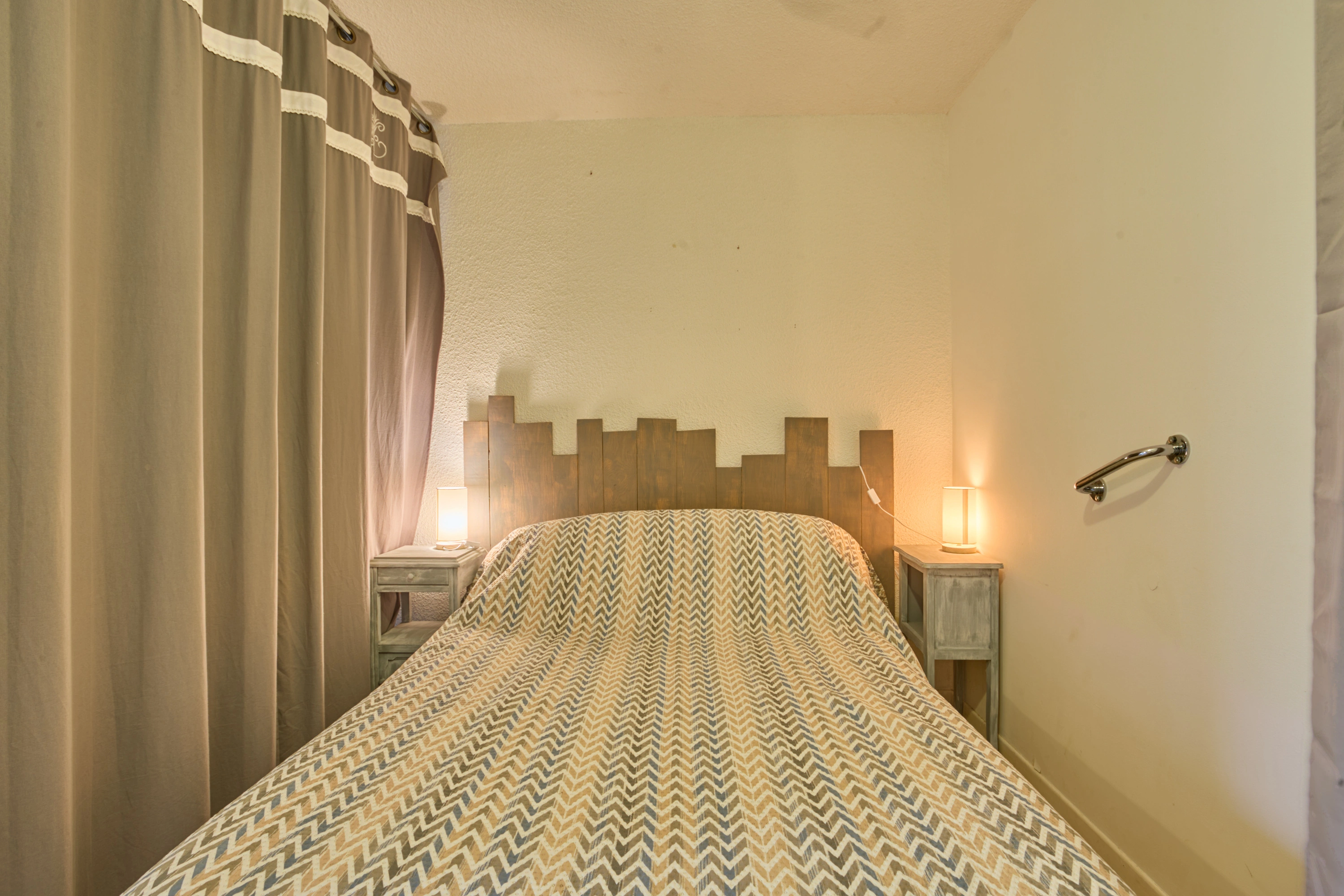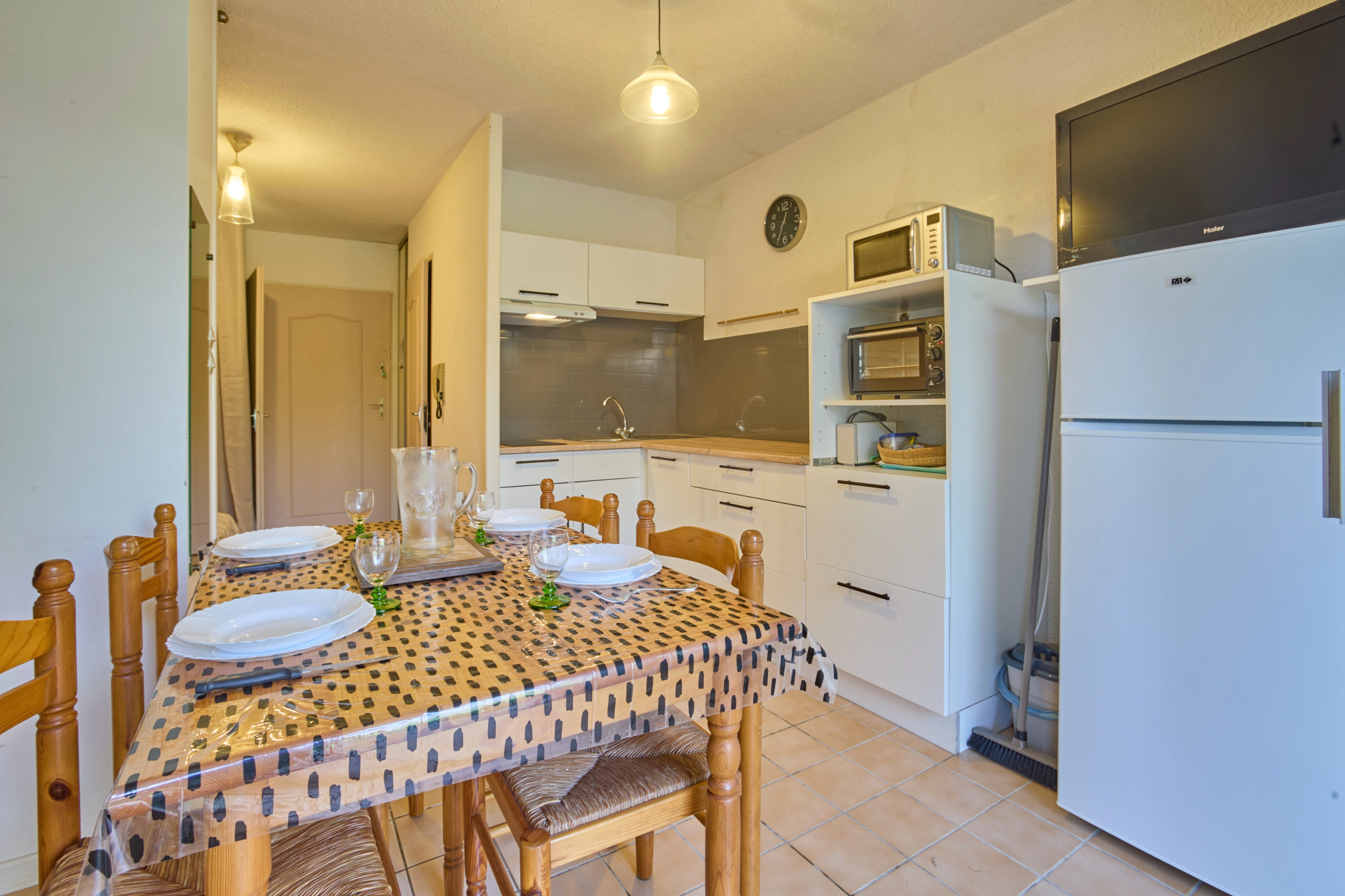 Il comprend un séjour avec canapé, TV et coin repas, une cuisine équipée (réfrigérateur-congélateur, micro-ondes, mini-four, plaques à induction), ainsi qu’un coin nuit séparé par une penderie et un rideau, avec un lit en 140 cm. La salle d’eau dispose d’une douche, d’un meuble vasque, d’un lave-linge, et les WC sont séparés. Chauffage électrique.