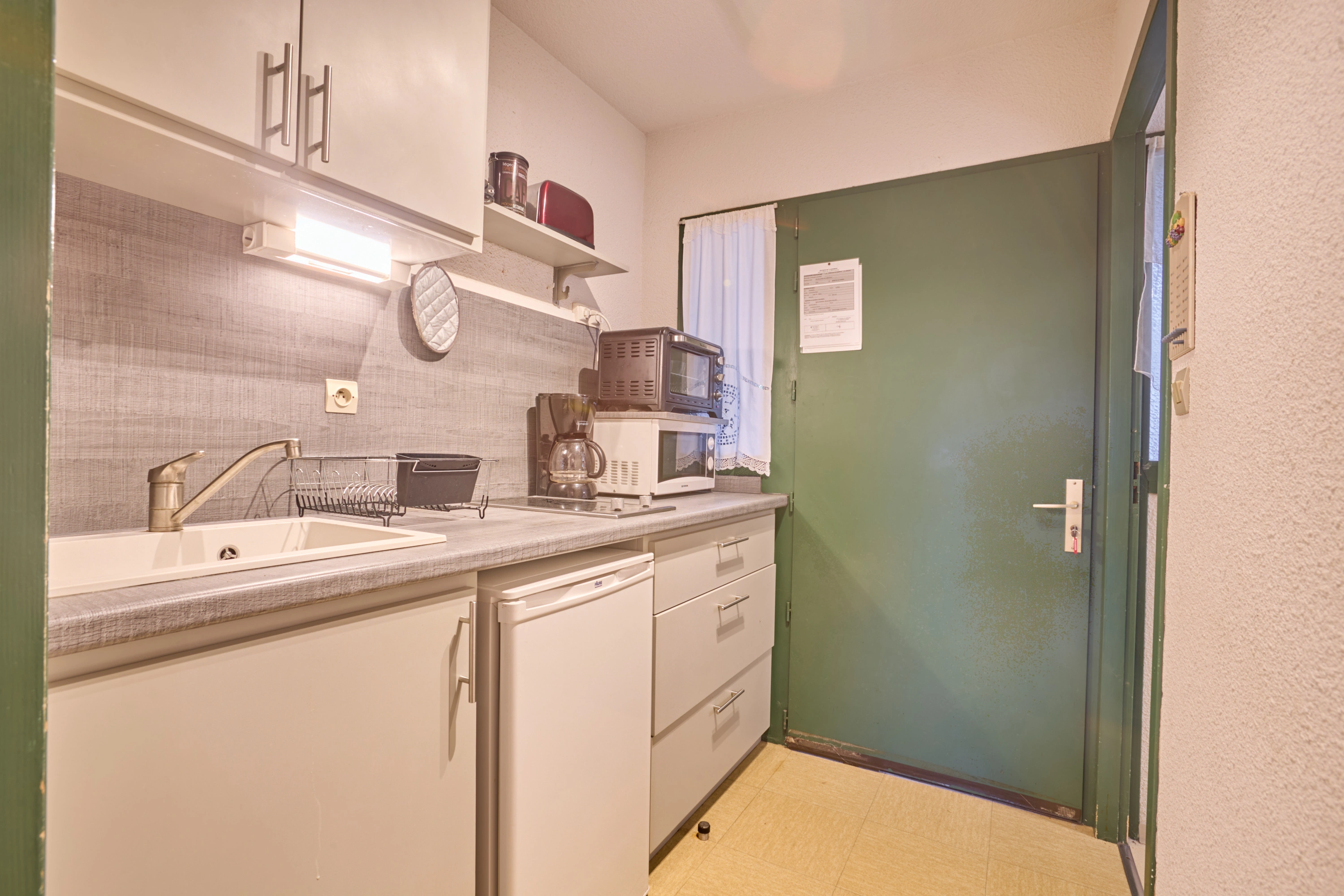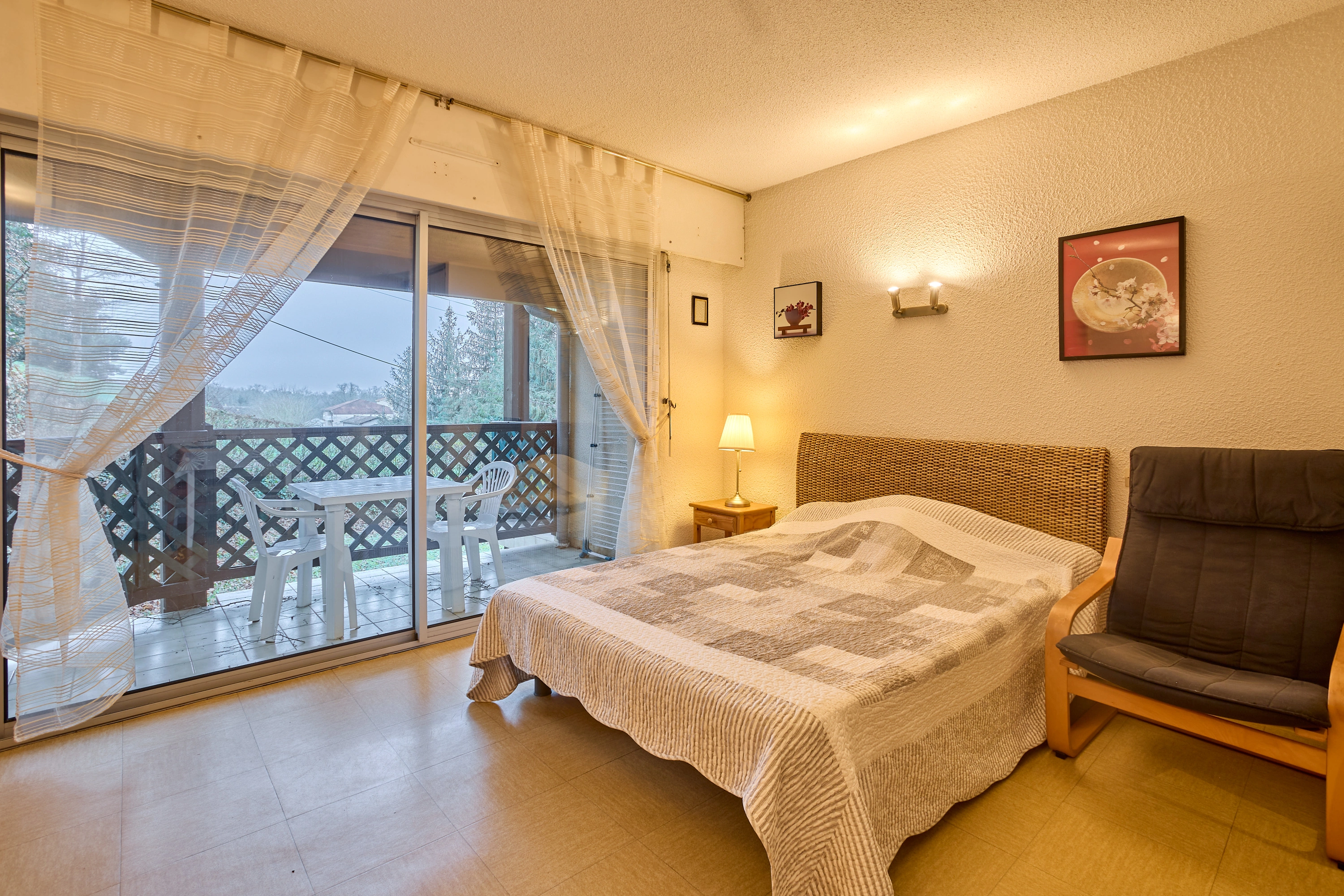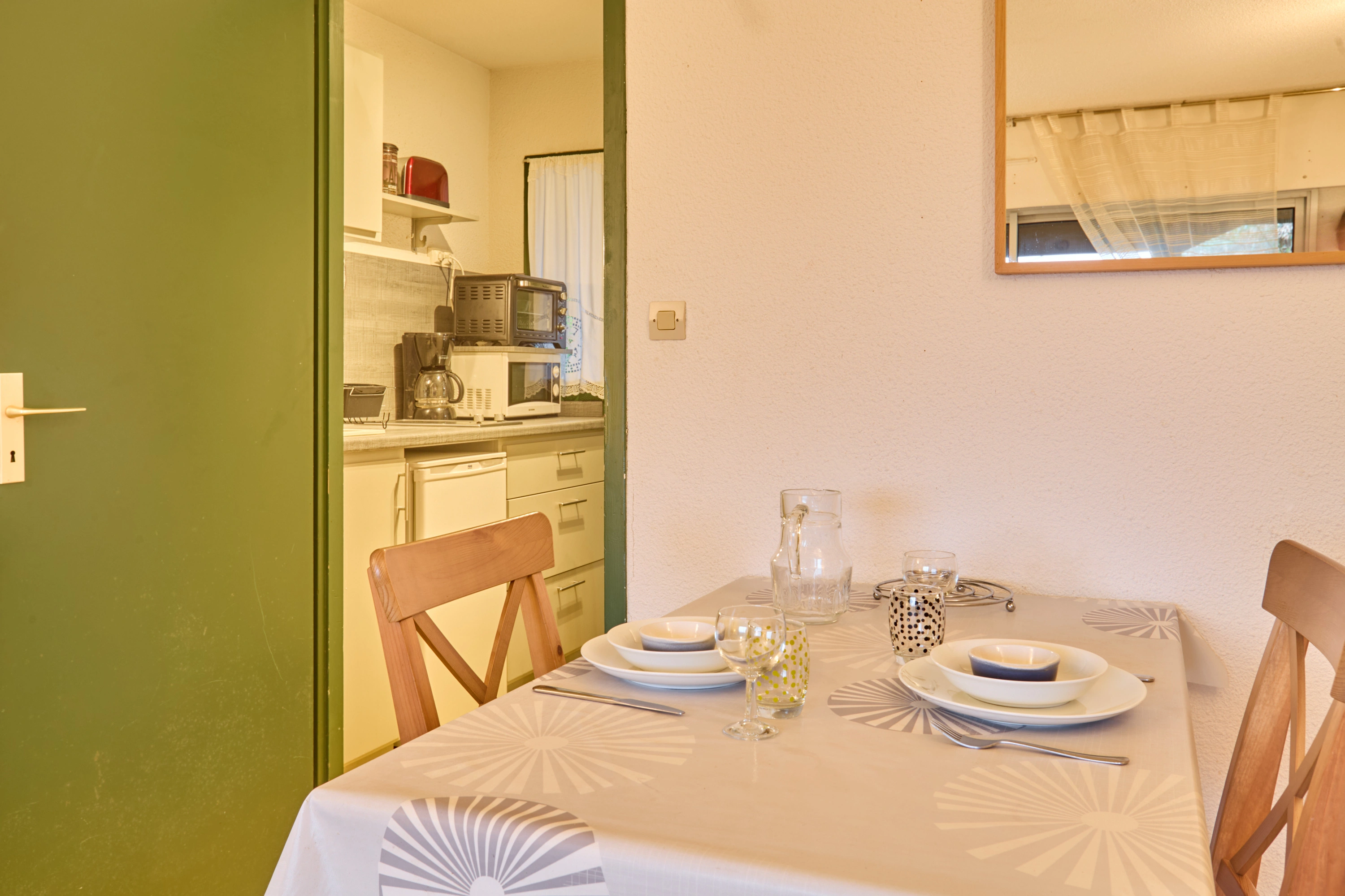 Sa pièce principale est aménagée avec un lit en 140, une charmante table et ses deux chaises, un fauteuil, une TV. Sa cuisine séparée offre tous les équipements (plaques vitrocéramiques, micro-ondes, mini-four, réfrigérateur,) et une ouverture fixe. Ainsi que sa salle d’eau qui intègre une douche, un lavabo, un lave-linge, des toilettes semi séparées. Sa décoration épurée et claire vous invitera au repos.