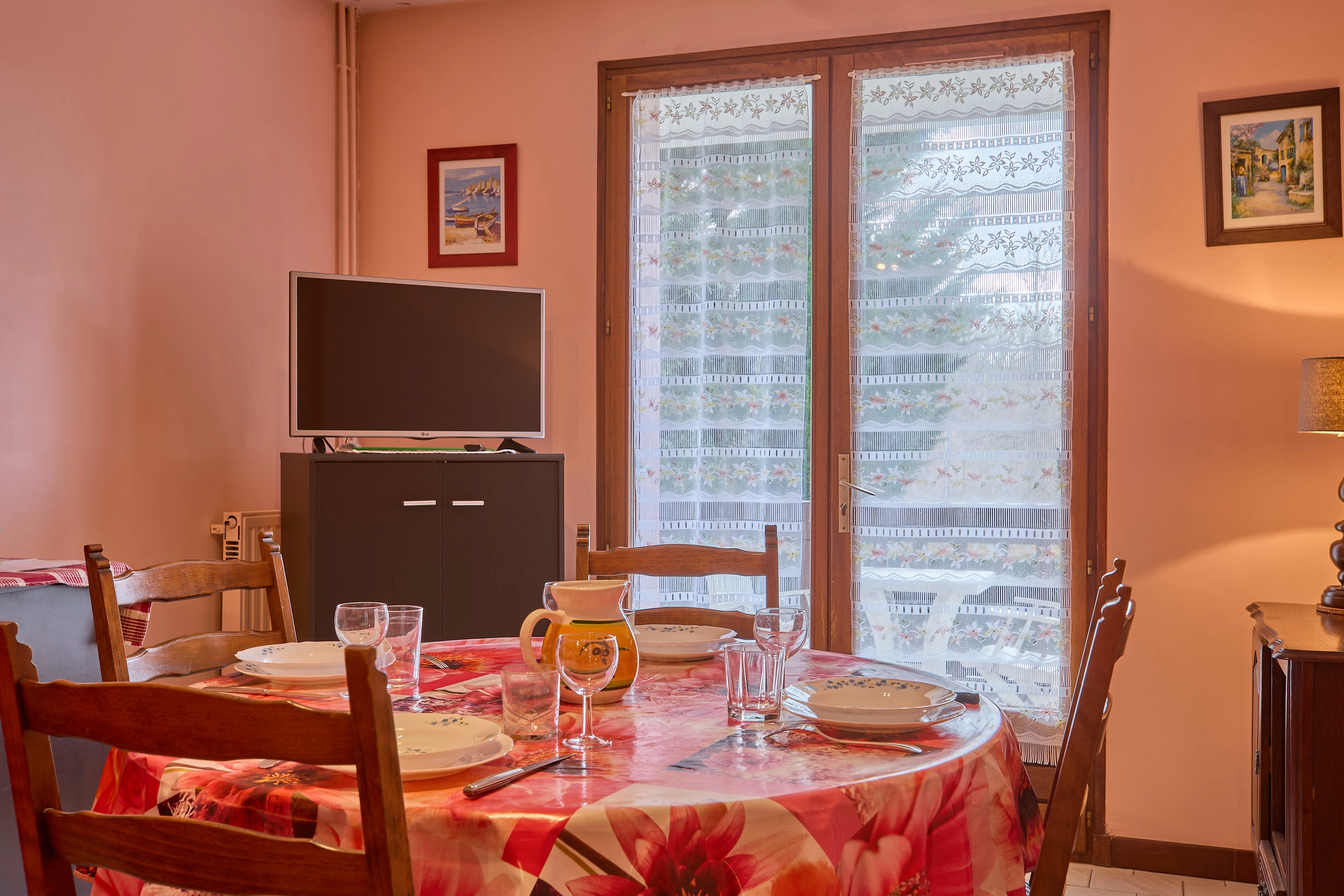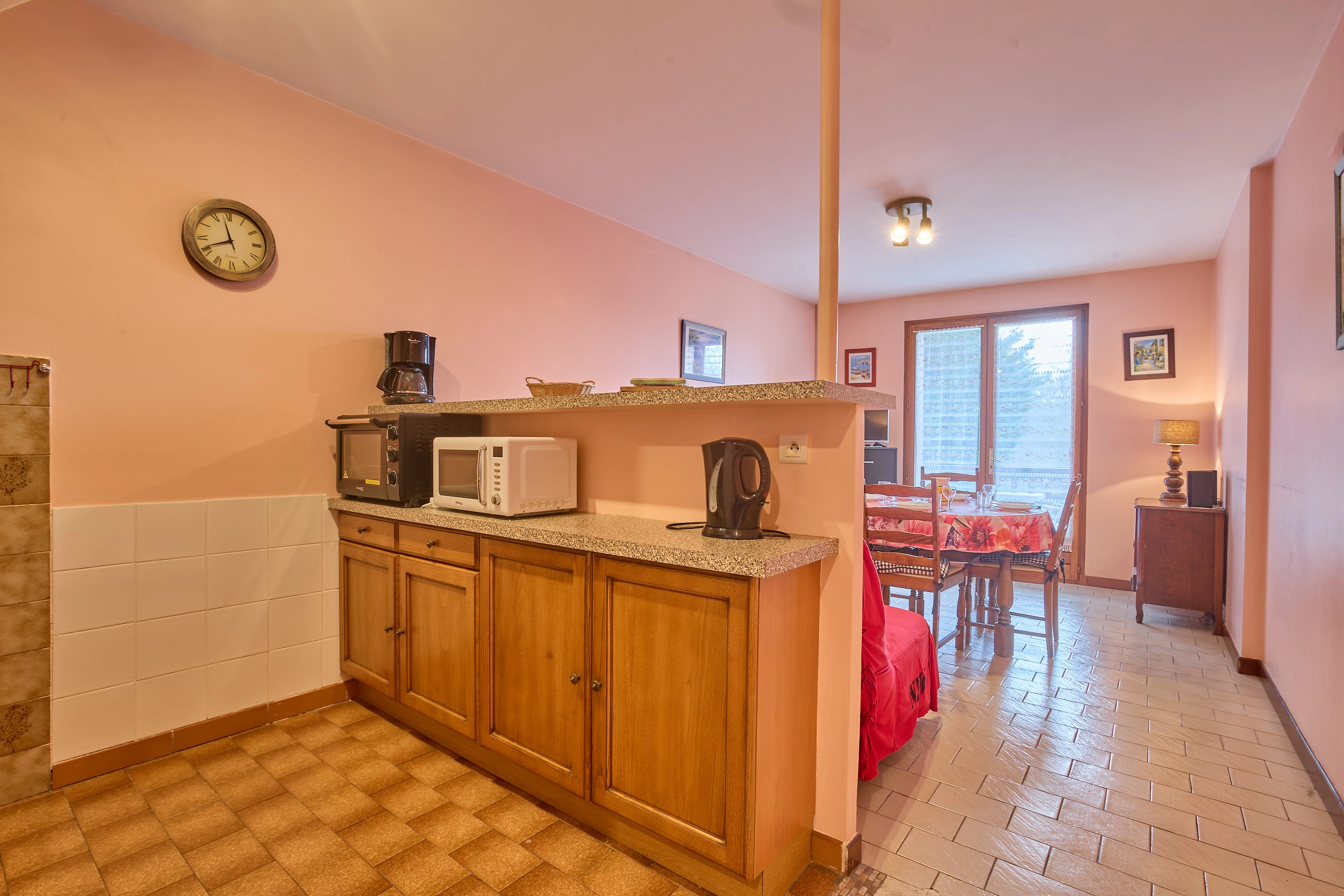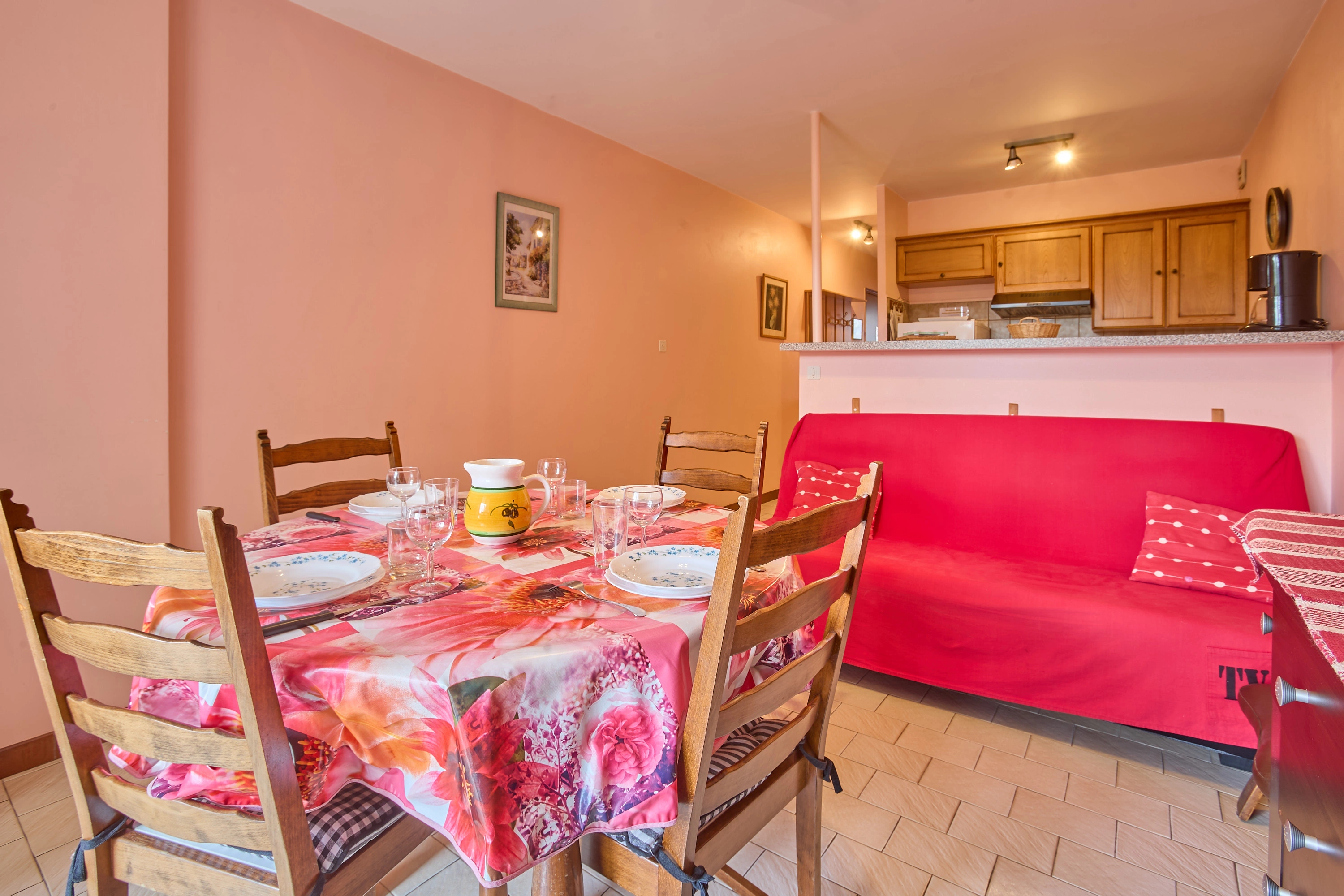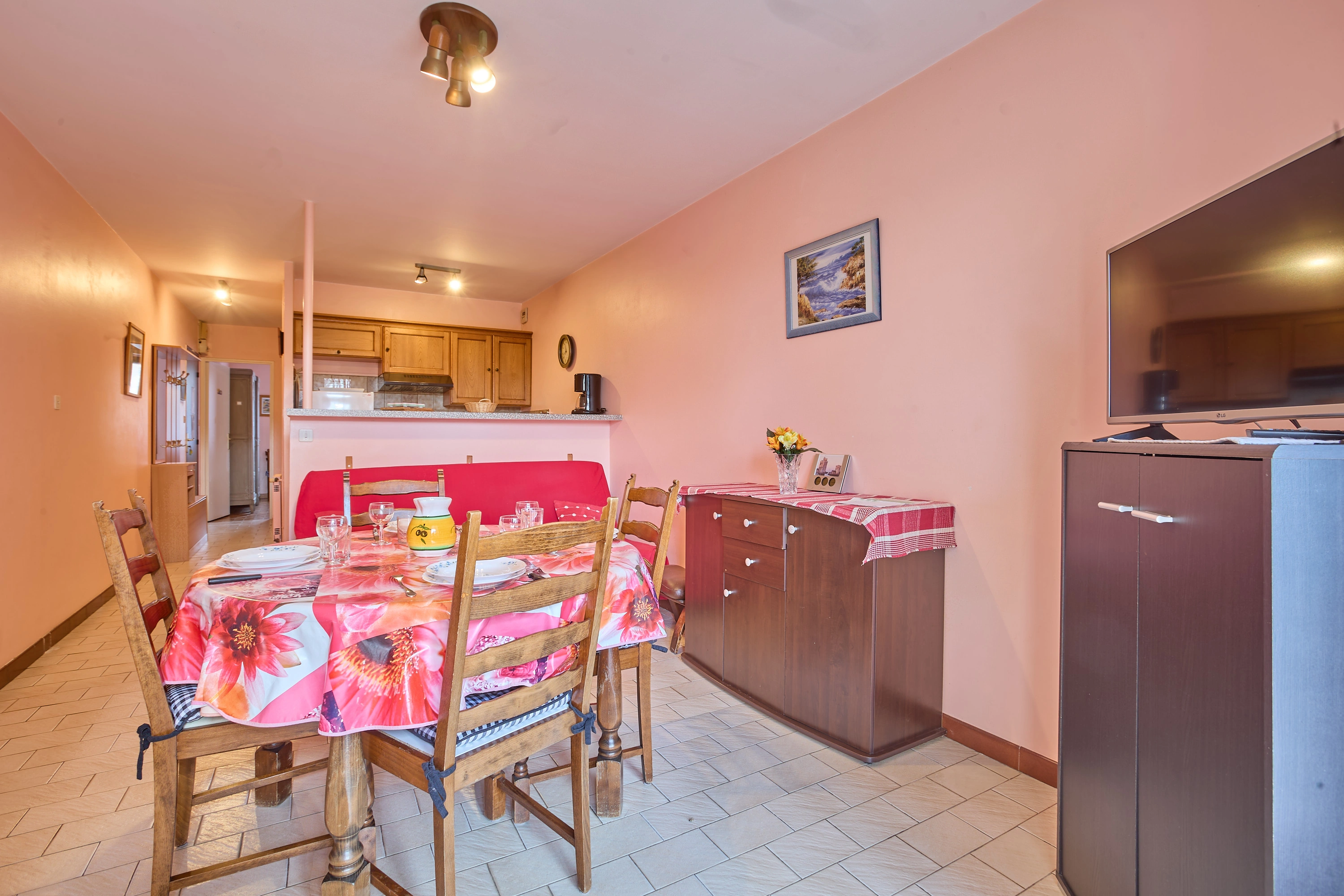 Sa grande pièce à vivre de 19 m², intègre une cuisine équipée de plaques avec induction, d’un réfrigérateur-congélateur, d’un micro-ondes, d’un mini-four et d’un lave-linge, un salon avec canapé et téléviseur, une salle à manger avec table, quatre chaises et un buffet.