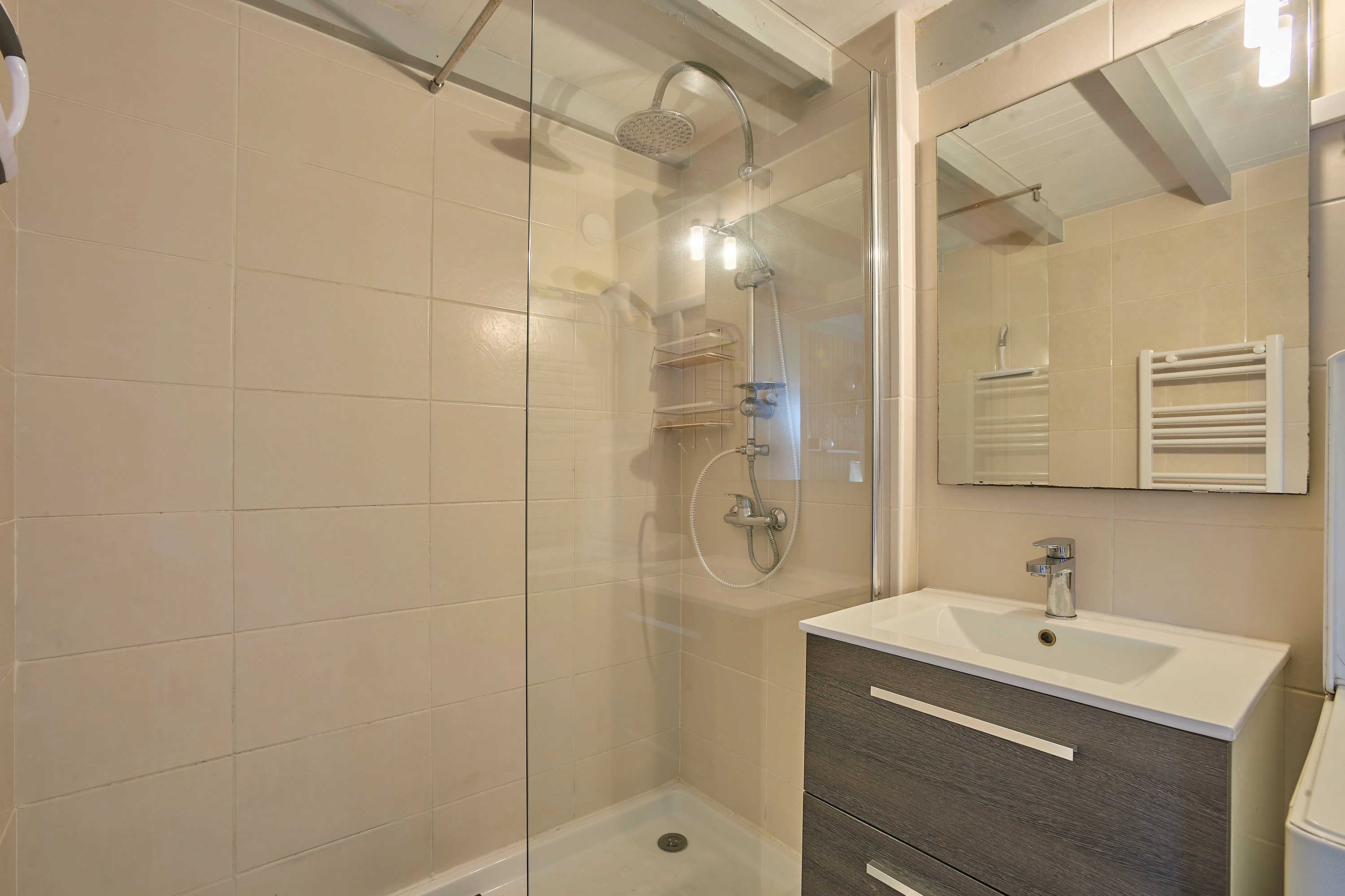 plaque quatre feux vitrocéramiques, un four électrique, un lave-vaisselle, cafetière Senseo, grille pain, bouilloire. Sa salle de bain, meuble vasque, lave-linge. Ses toilettes sont séparées.