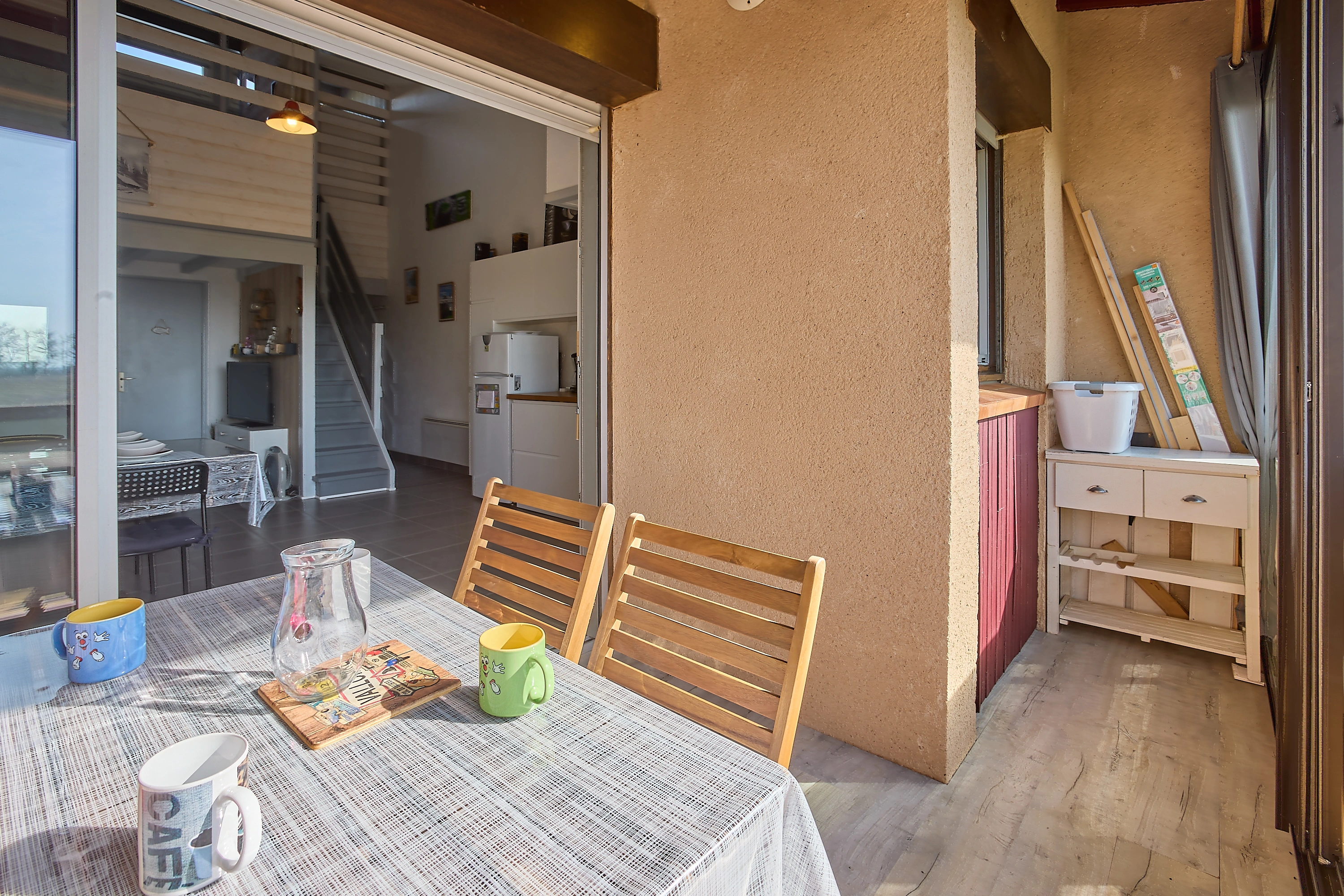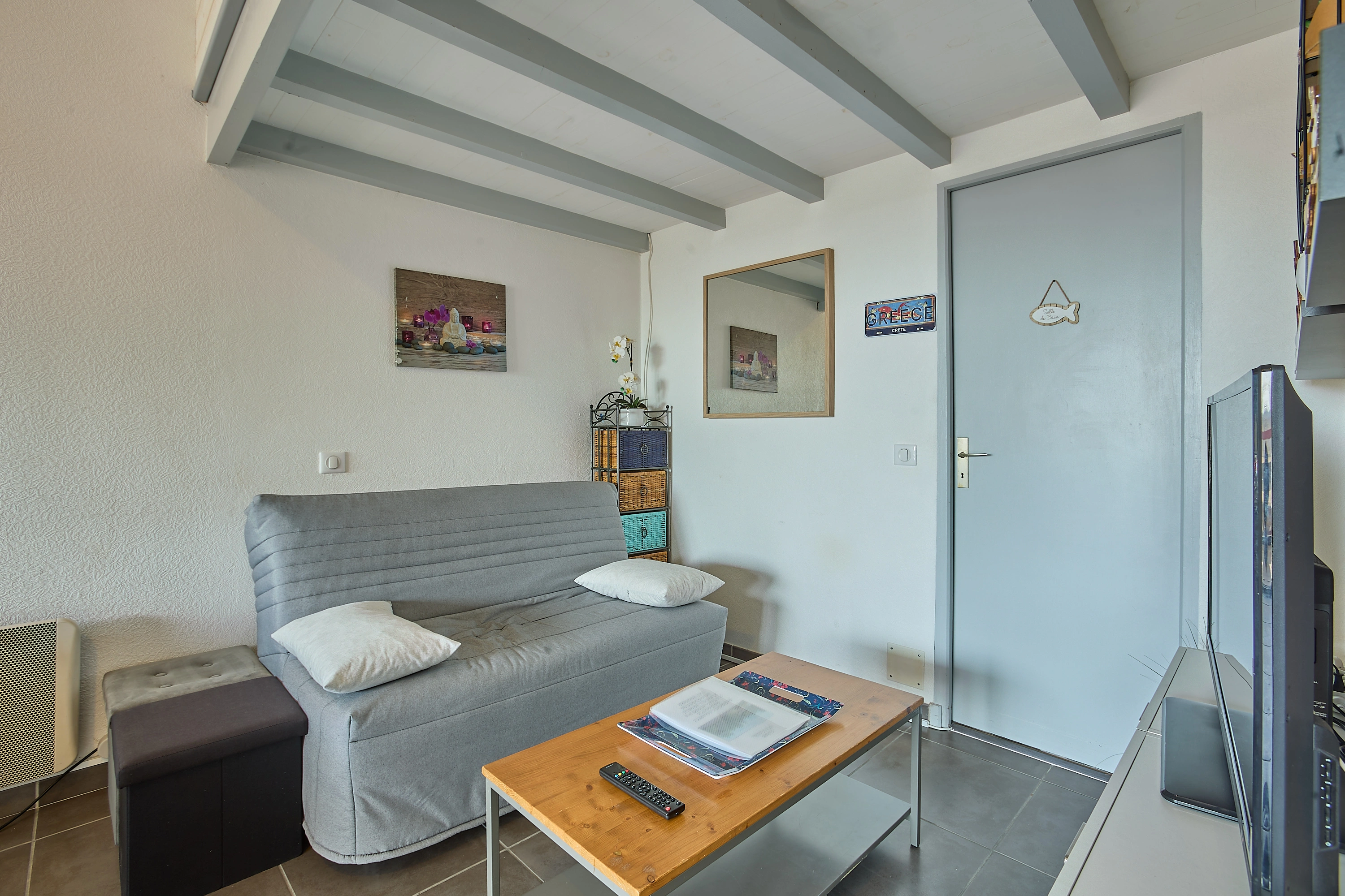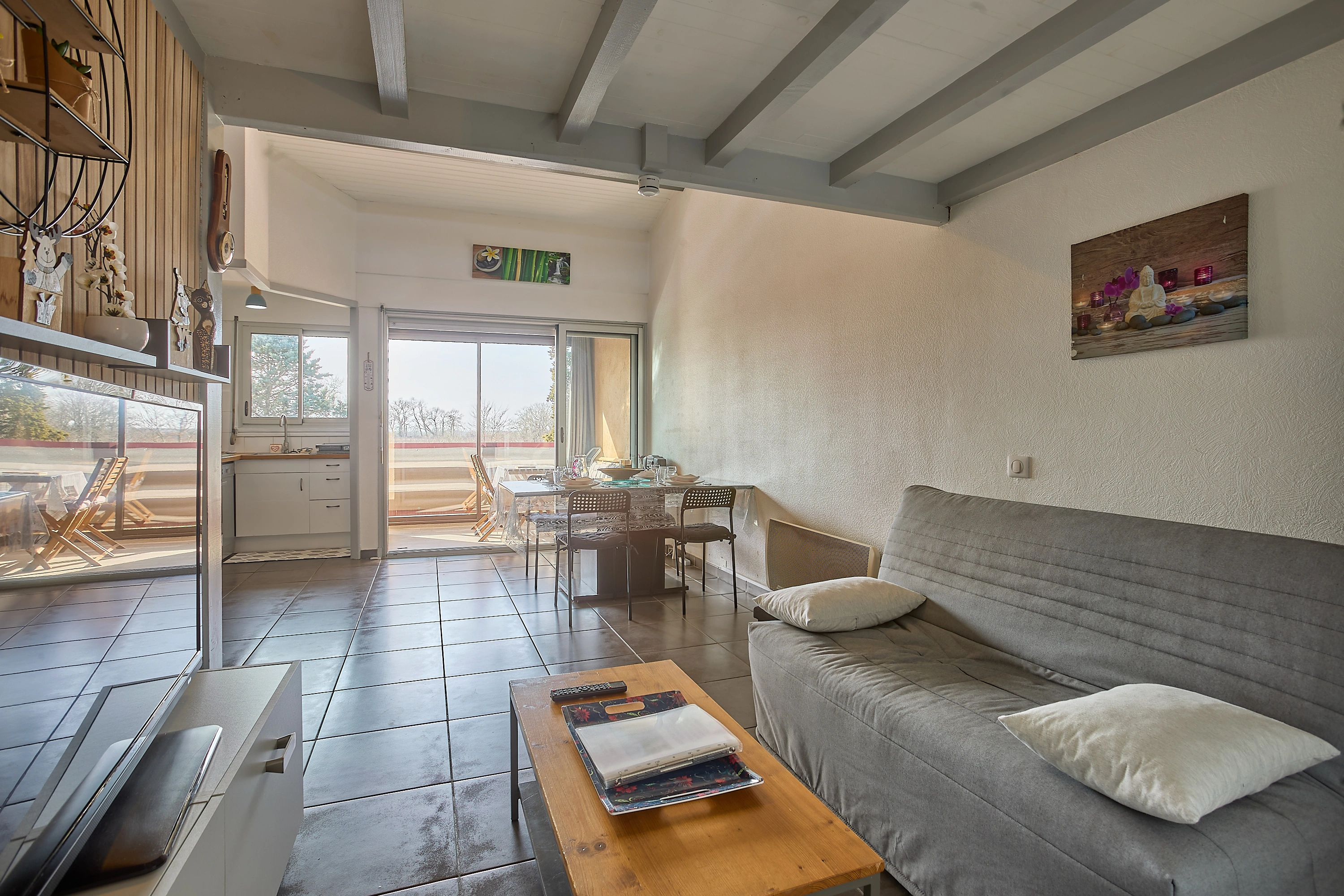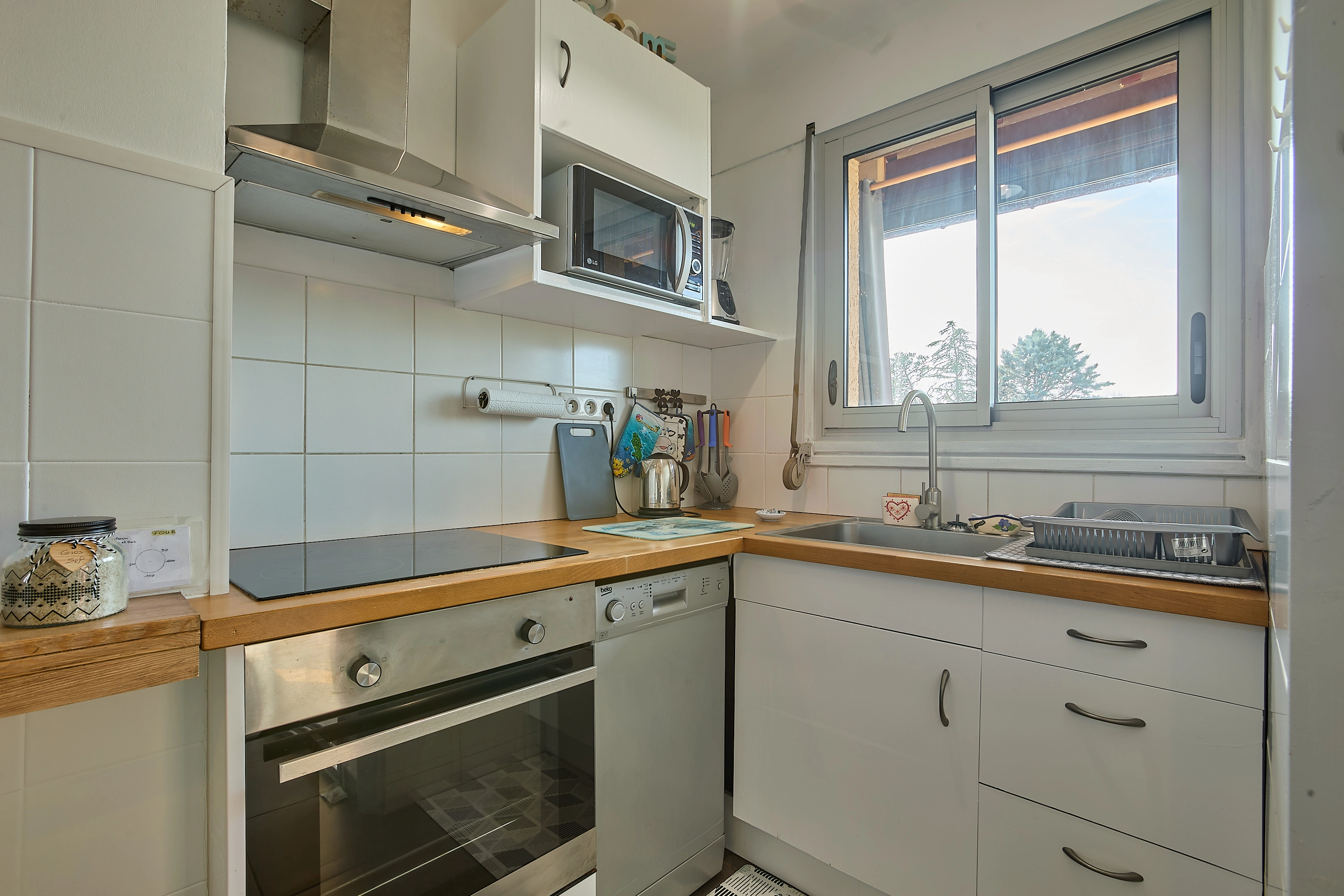 Sa lumineuse pièce à vivre est aménagée d’un confortable canapé, d’une TV grand écran plat posée sur un meuble de rangement, d’une salle à manger avec buffet, table et quatre chaises. Sa cuisine rénovée et séparée s’ouvre grâce à une fenêtre sur la véranda, et vous attend pour la préparation de vos repas avec un réfrigérateur/congélateur, une