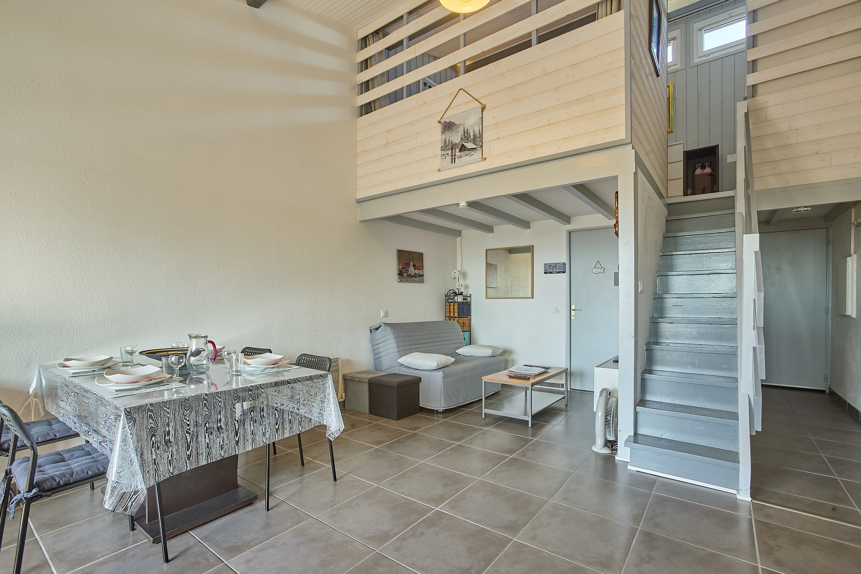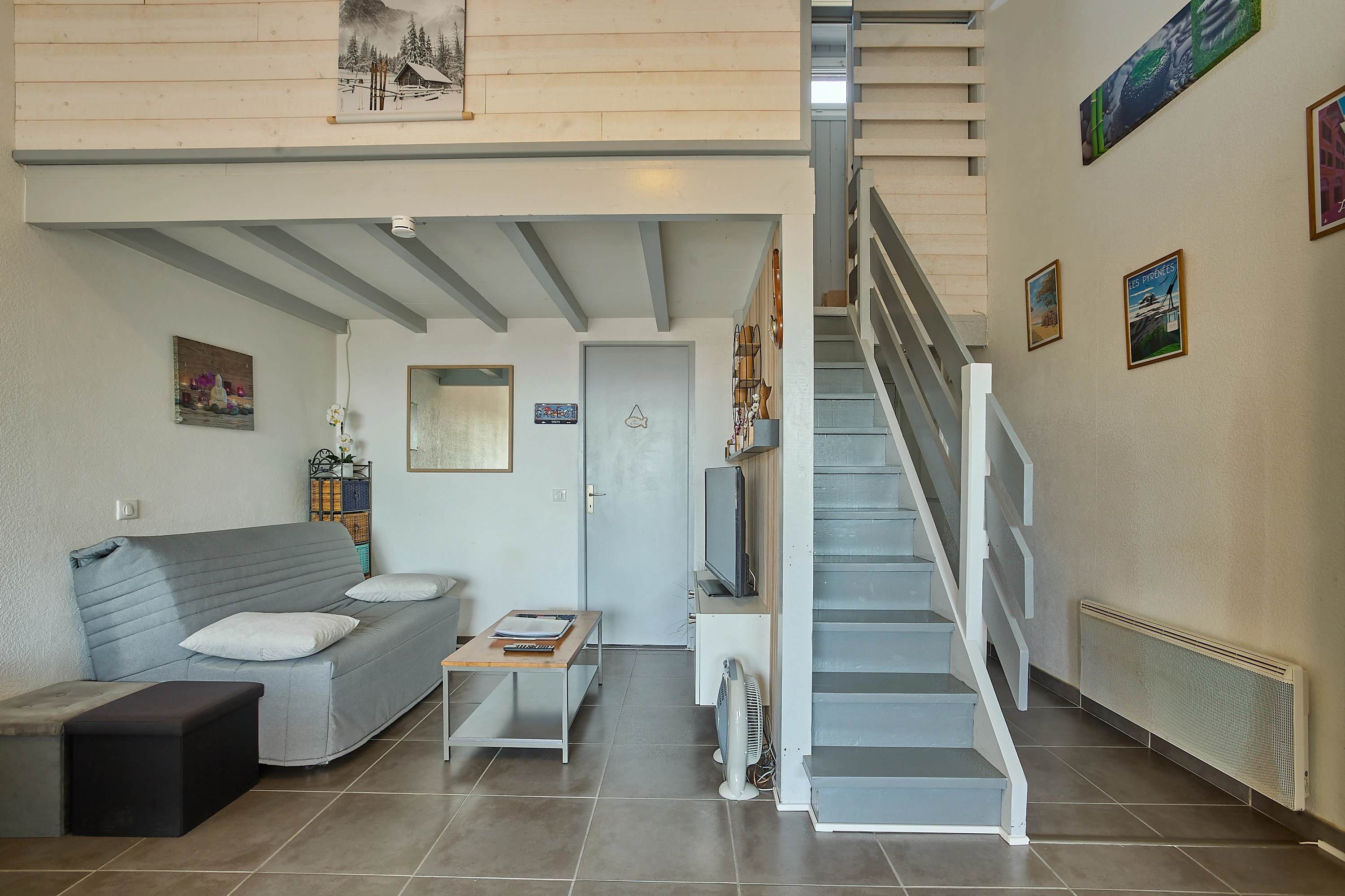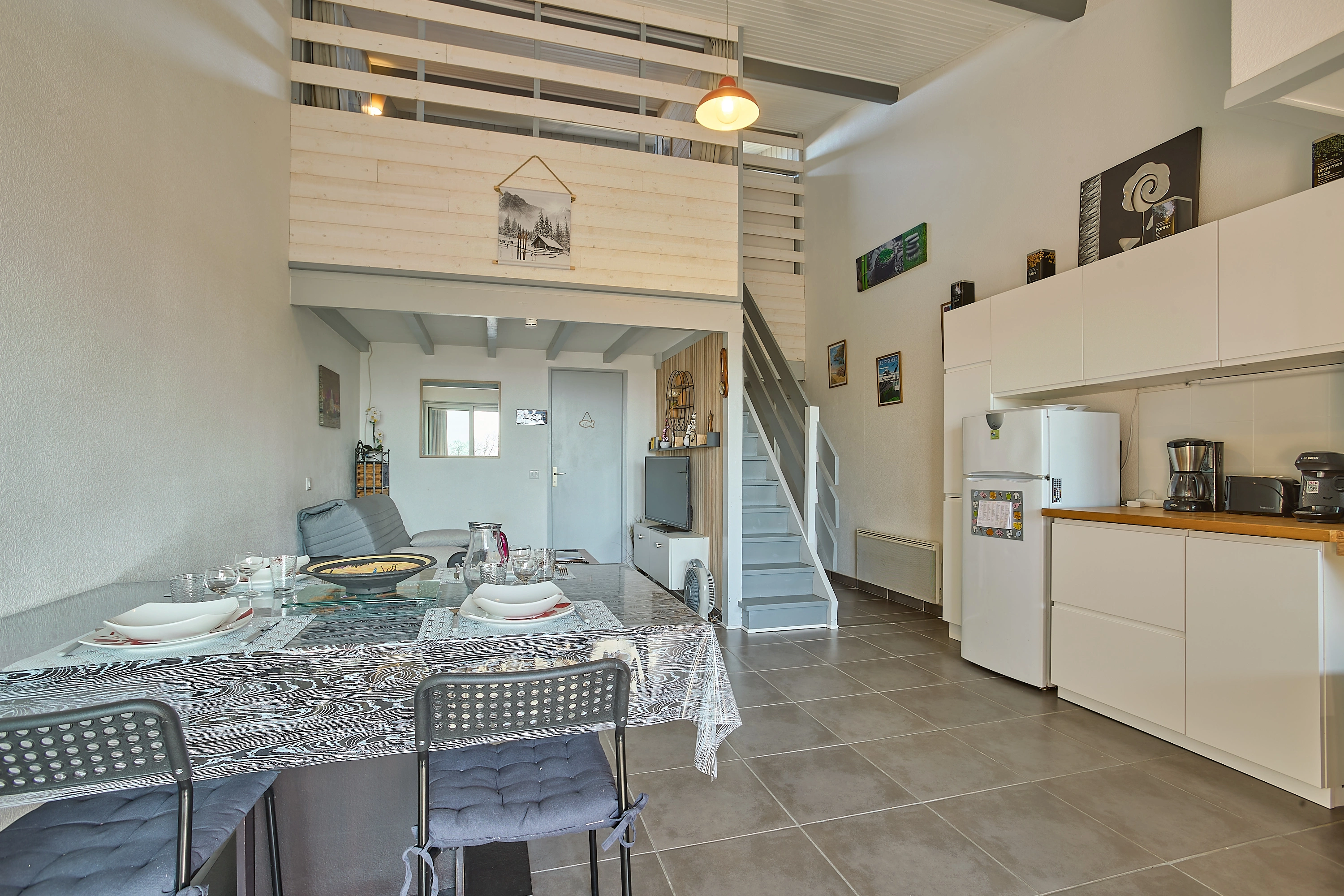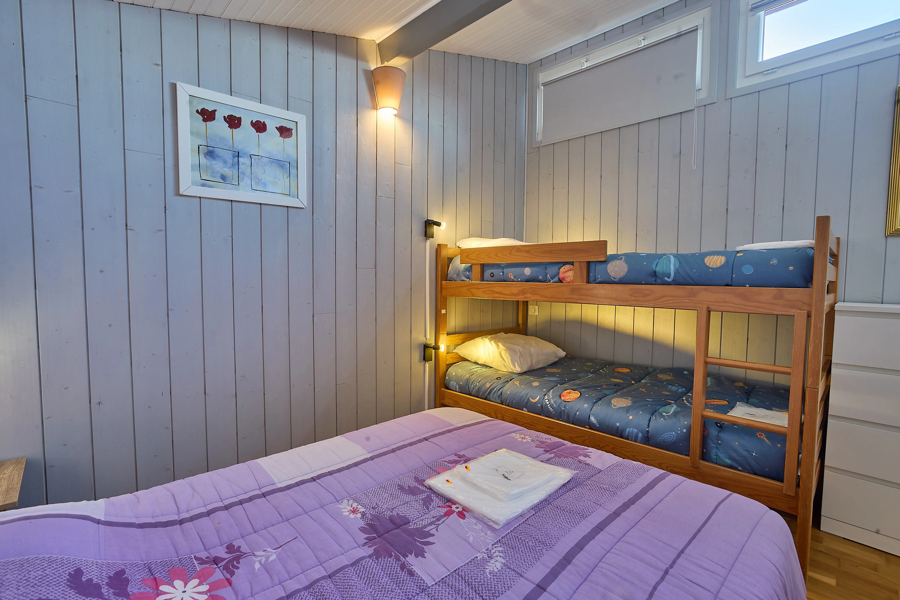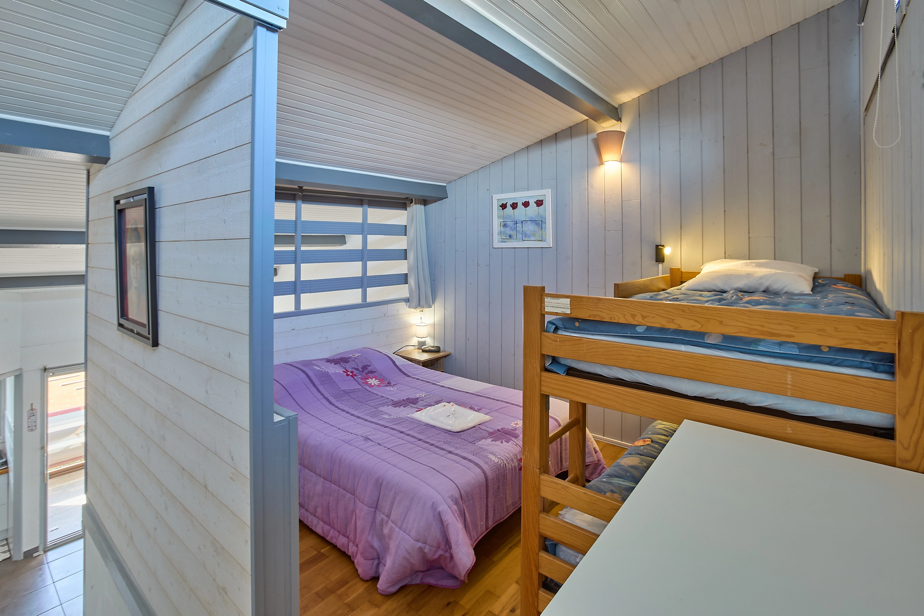 L’espace nuit situé à l’étage et accessible par l’escalier du séjour, une commode et une armoire. La chambre avec 2 lits en 90 superposé et 1 lit 140.