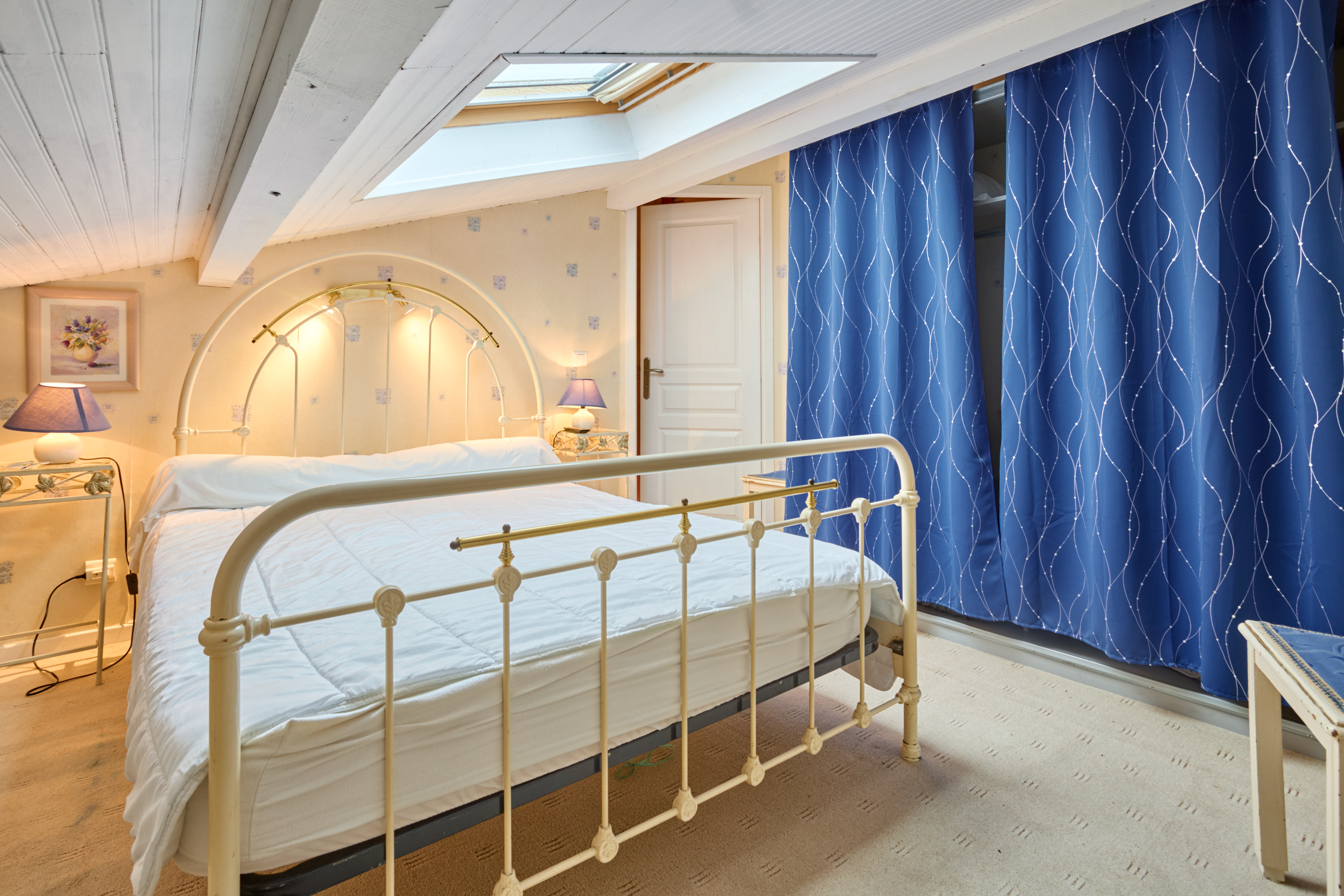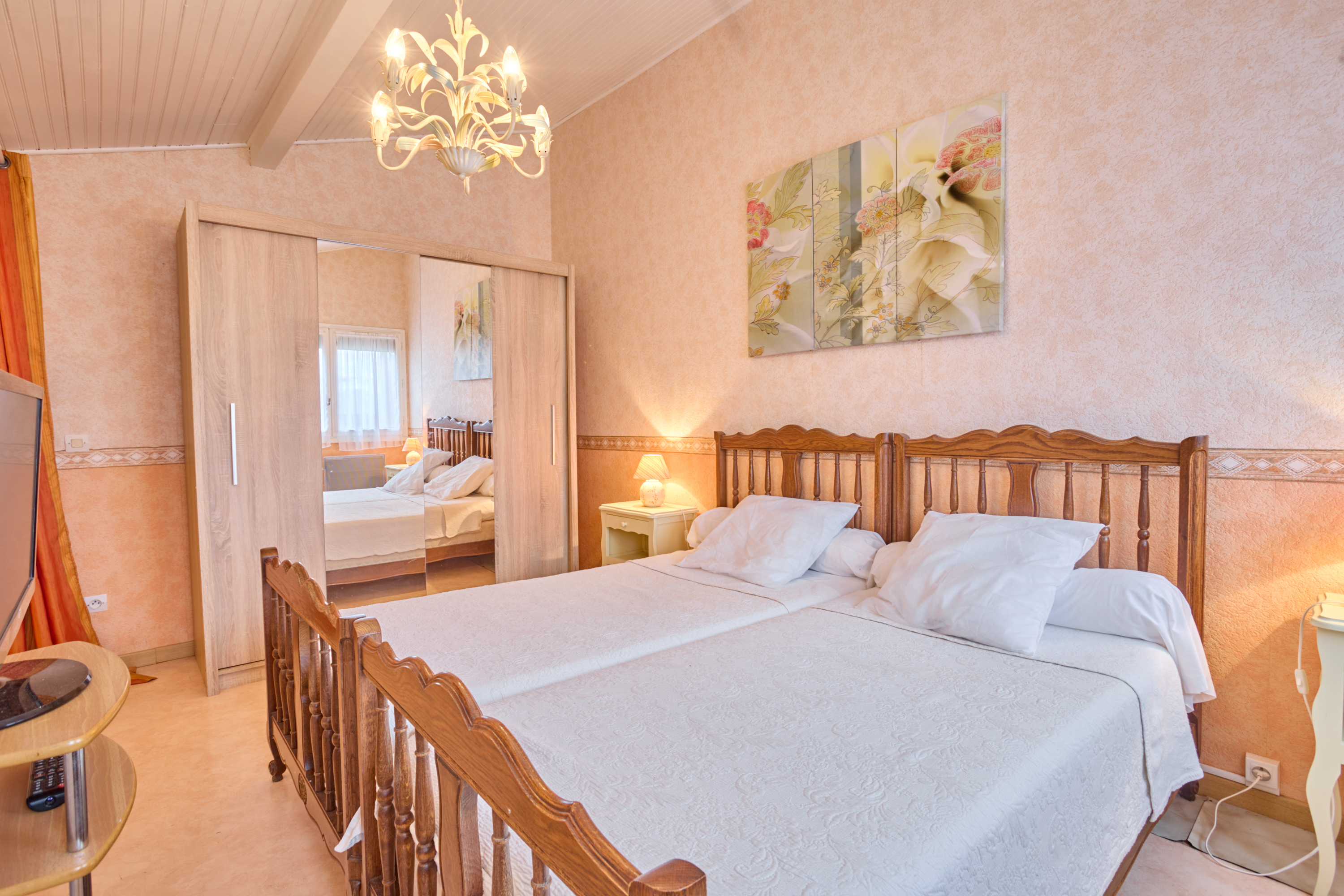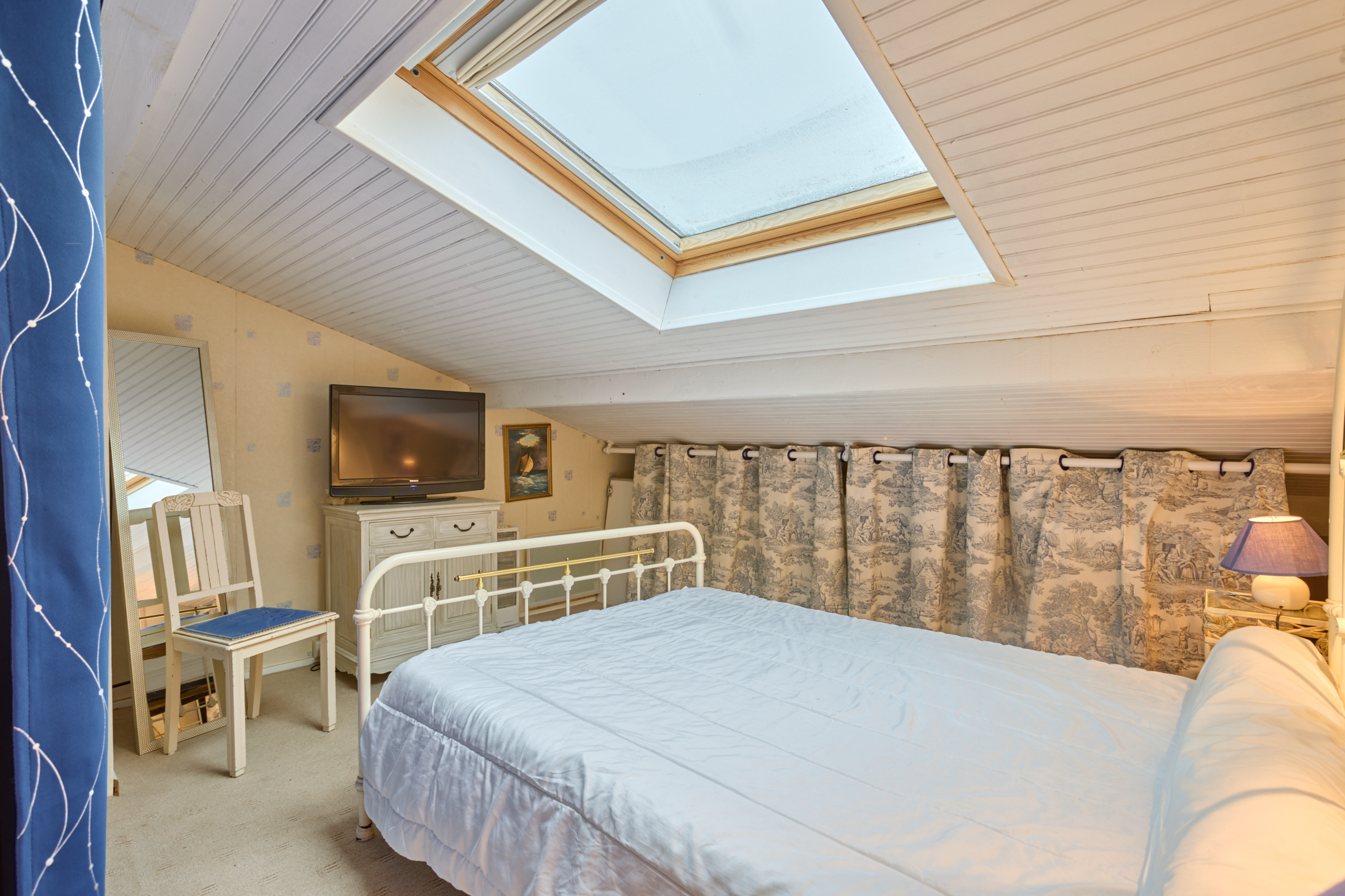 Sa salle de bain, avec baignoire, meuble vasque, lave-linge et sèche-linge, est baignée de lumière grâce à une large fenêtre. Ses toilettes sont séparées. L’espace nuit situé à l’étage et accessible par l’escalier du séjour, il y a une TV, une commode et une armoire dans chaque pièce.