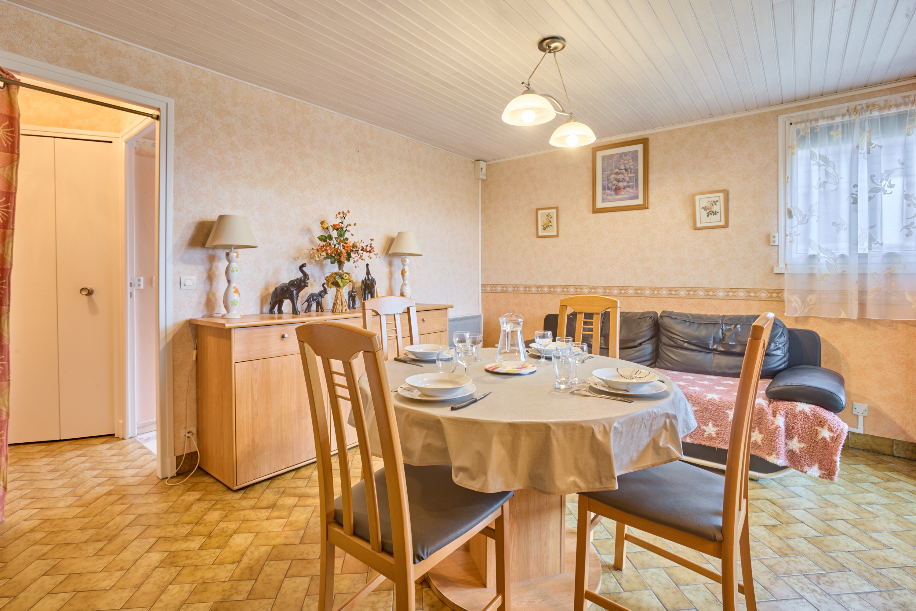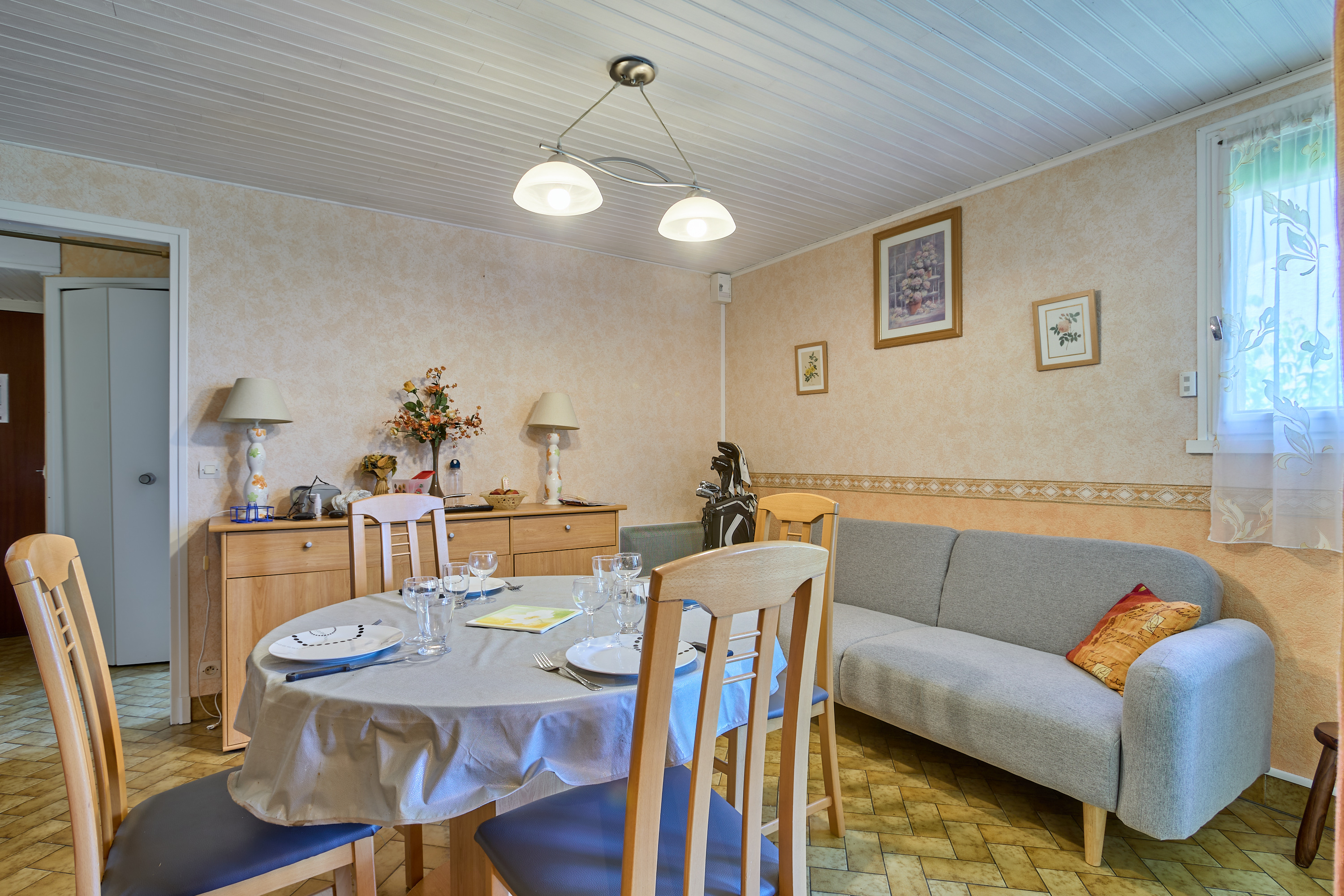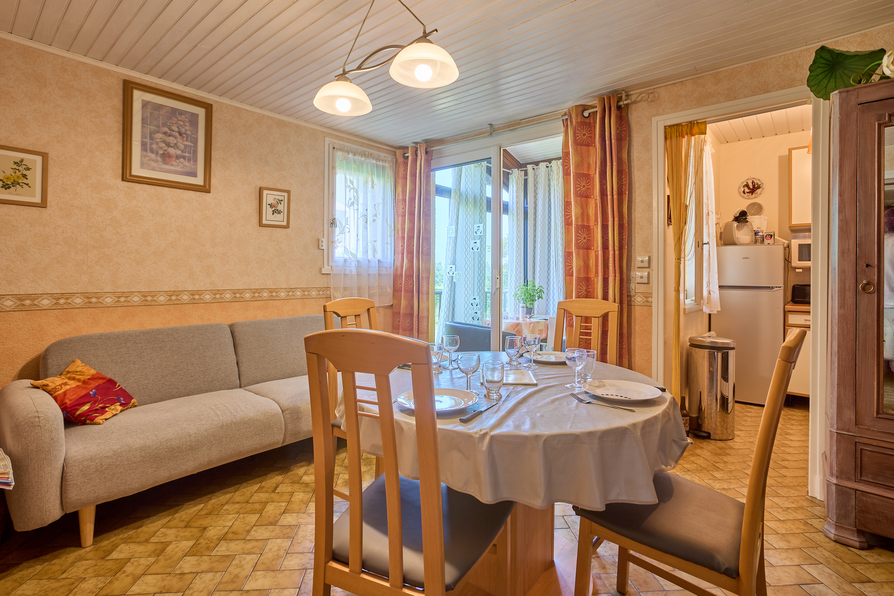 Sa lumineuse pièce à vivre est aménagée d’un confortable canapé, d’une TV grand écran plat posée sur un meuble de rangement, d’une salle à manger avec buffet, table et quatre chaises. Sa cuisine rénovée et séparée s’ouvre grâce à une fenêtre sur la véranda, et vous attend pour la préparation de vos repas avec un réfrigérateur/congélateur, une plaque quatre feux vitrocéramiques, un four électrique, un lave-vaisselle et de nombreux placards de rangements.