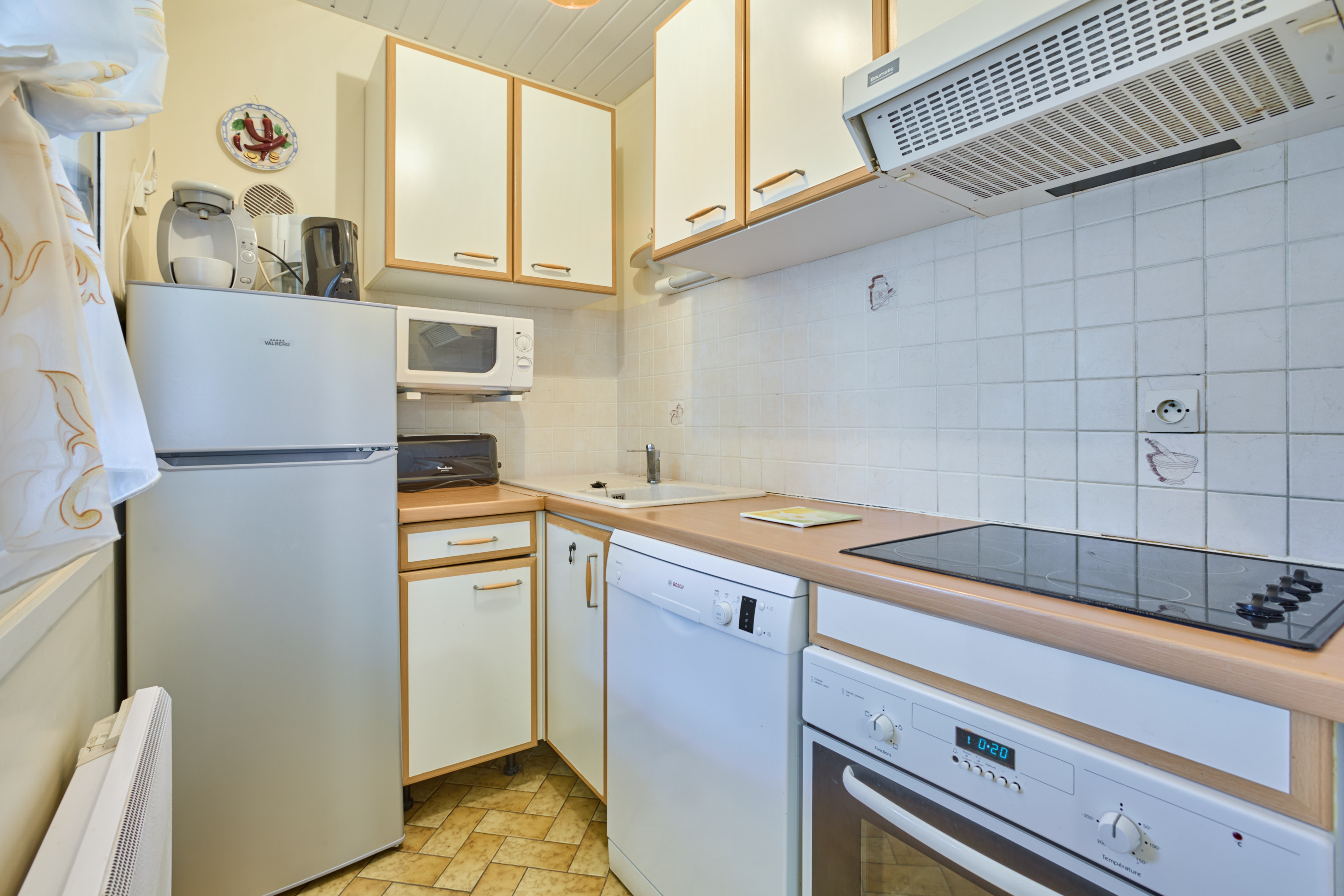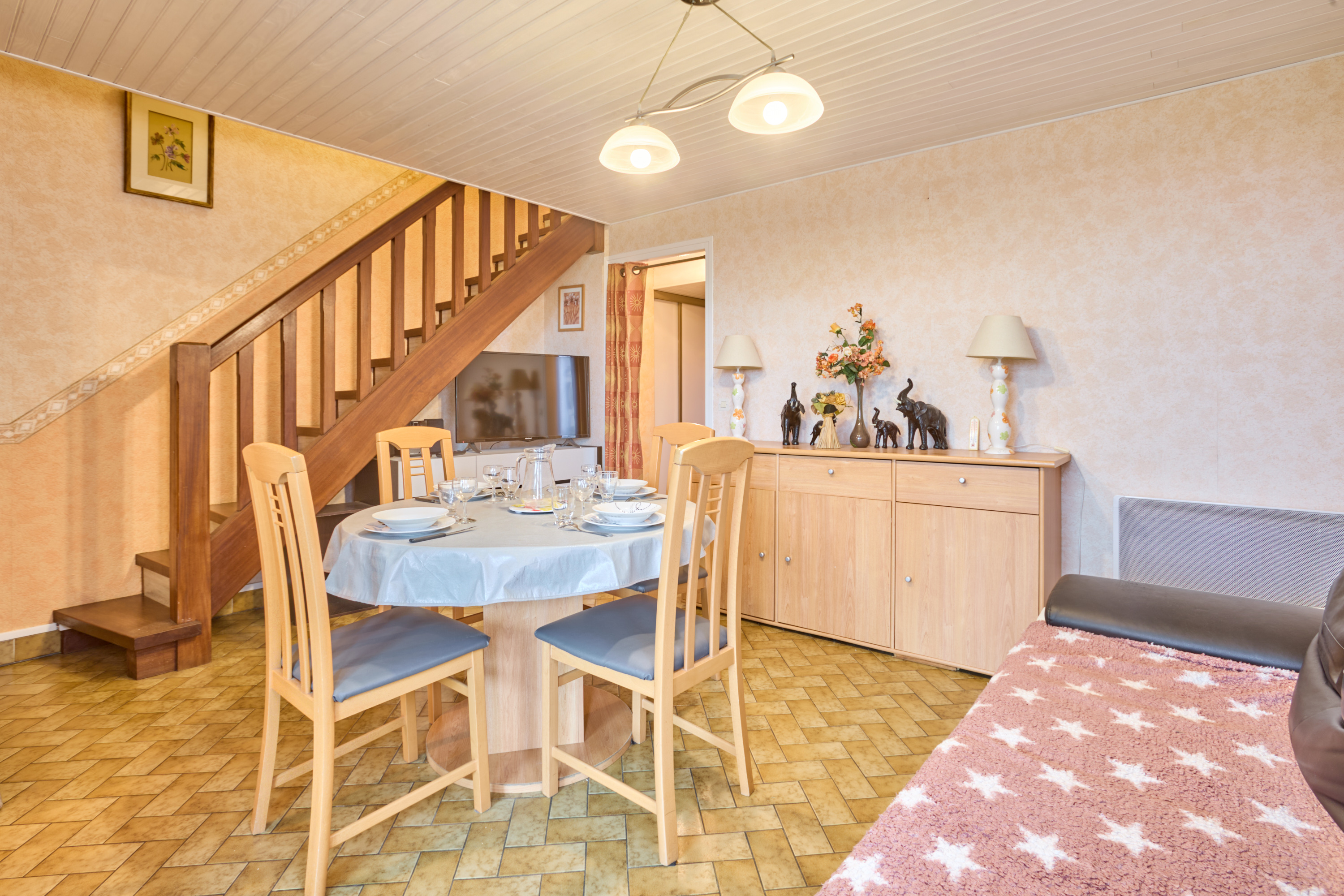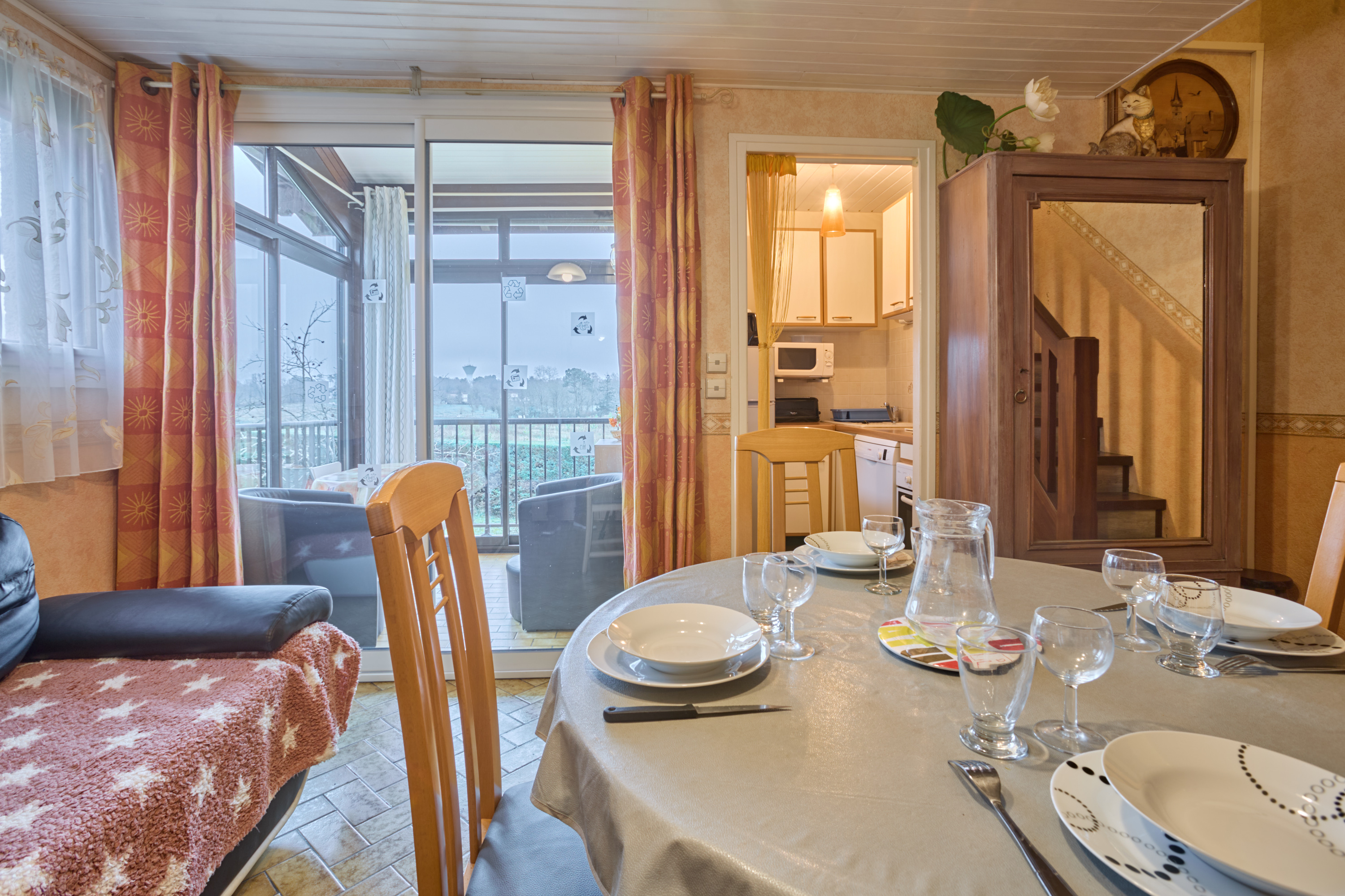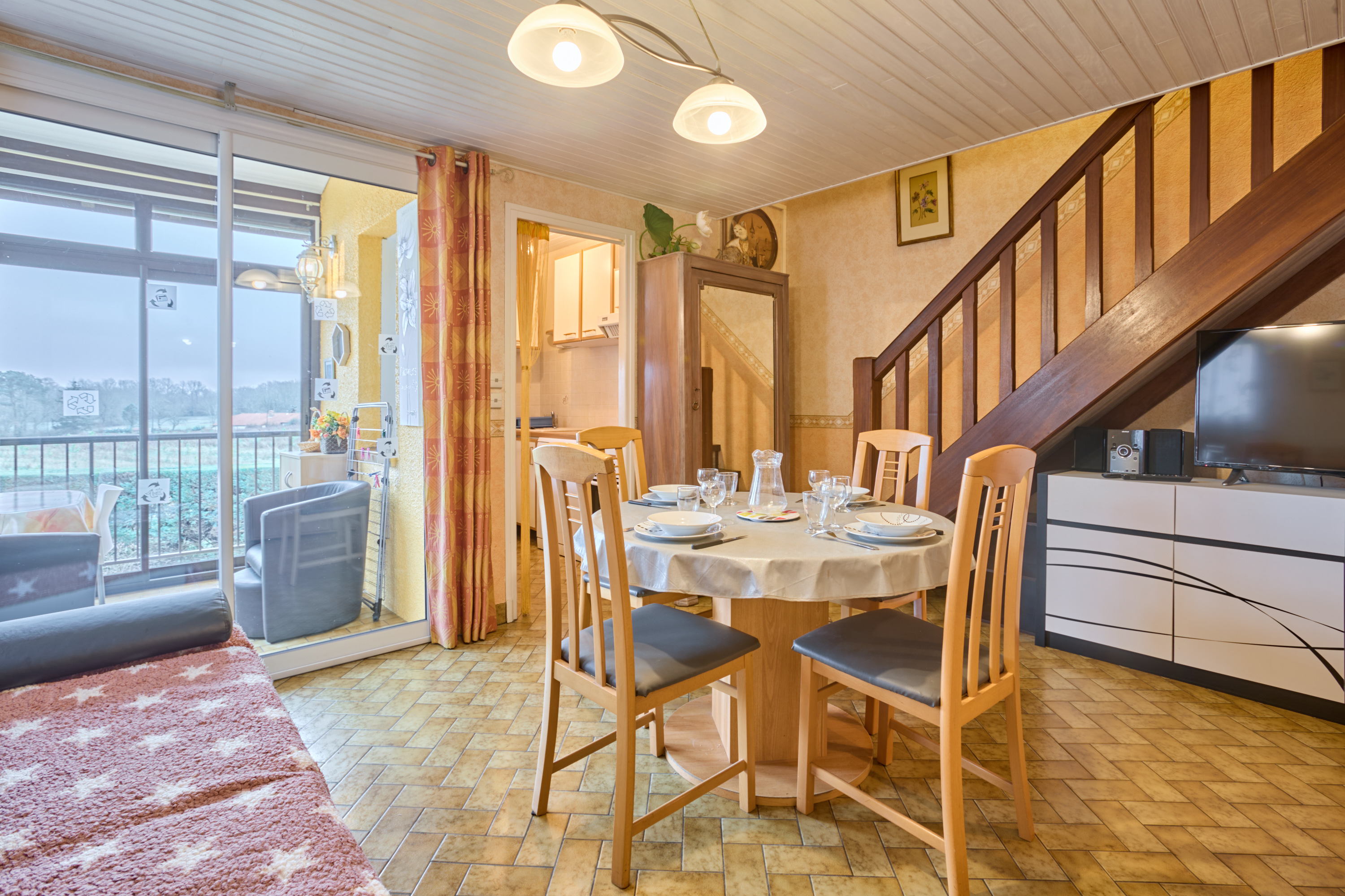 Sa lumineuse pièce à vivre est aménagée d’un confortable canapé, d’une TV grand écran plat posée sur un meuble de rangement, d’une salle à manger avec buffet, table et quatre chaises. Sa cuisine rénovée et séparée s’ouvre grâce à une fenêtre sur la véranda, et vous attend pour la préparation de vos repas avec un réfrigérateur/congélateur, une plaque quatre feux vitrocéramiques, un four électrique, un lave-vaisselle et de nombreux placards de rangements.