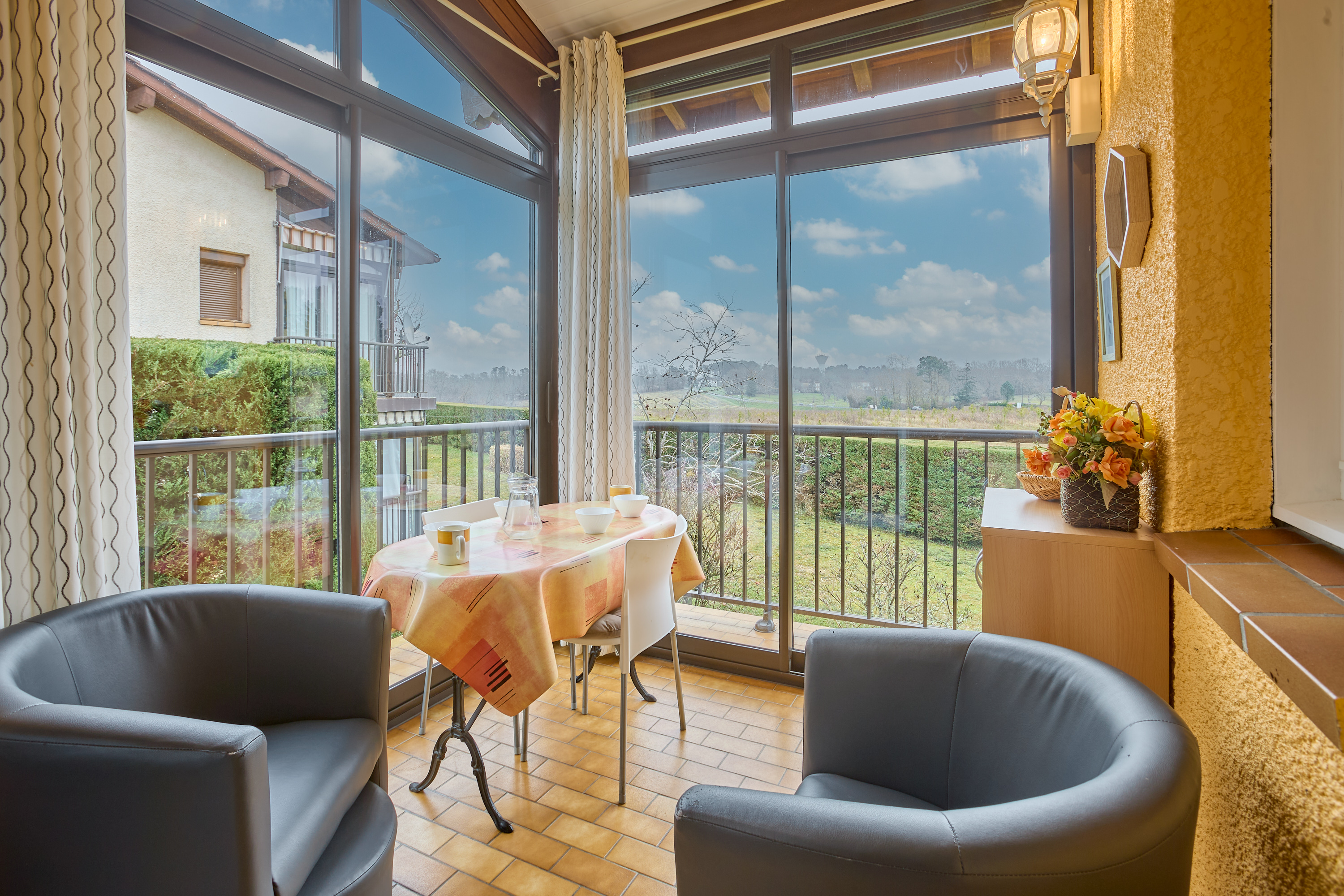 Sa véranda vous offre une magnifique vue dégagée sur la campagne environnante, dont vous pourrez profiter autour de son salon de jardin pour tous les temps.