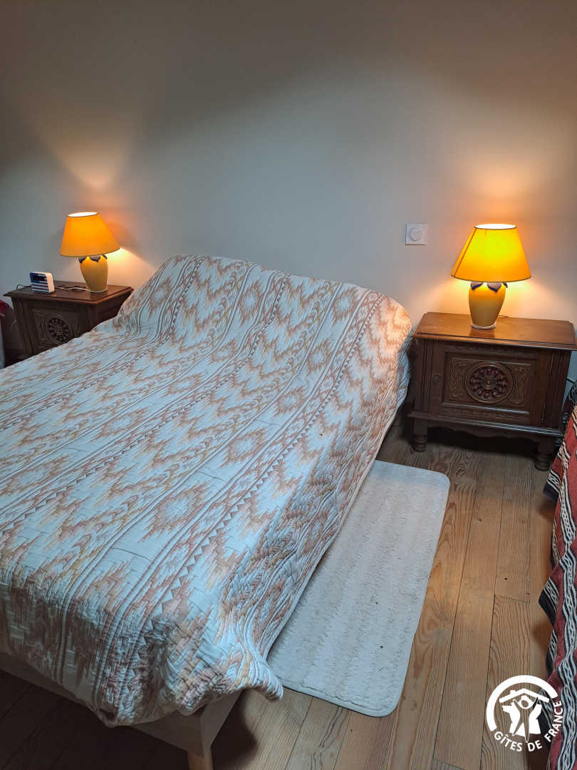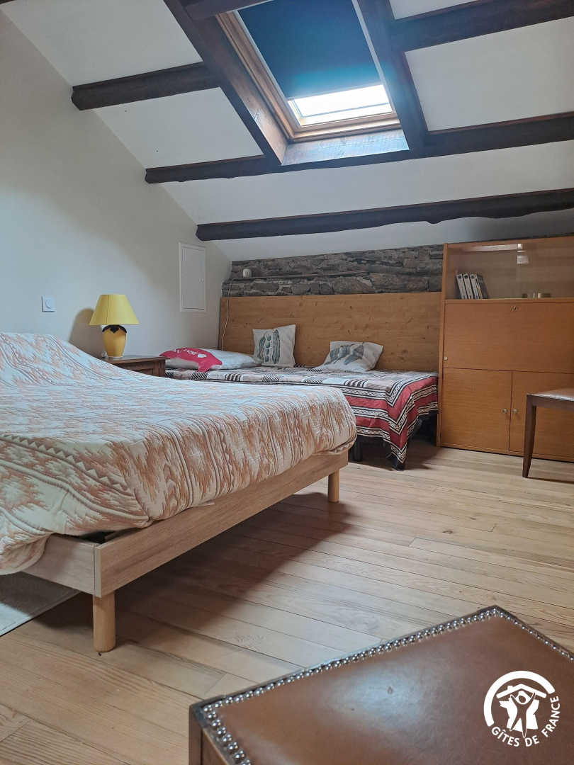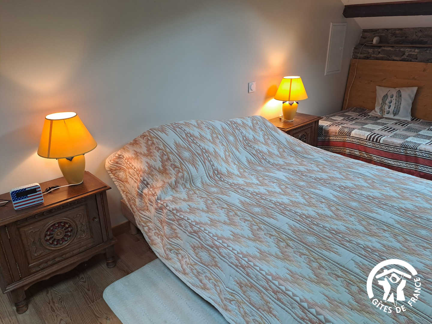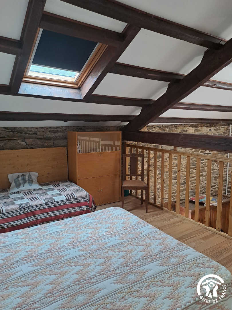 Le coin nuit se trouve en mezzanine (16m²), on y accède par un escalier en bois. S’y trouvent un lit double en 140×190 et un lit simple en 90×190. Lit bébé sur demande.