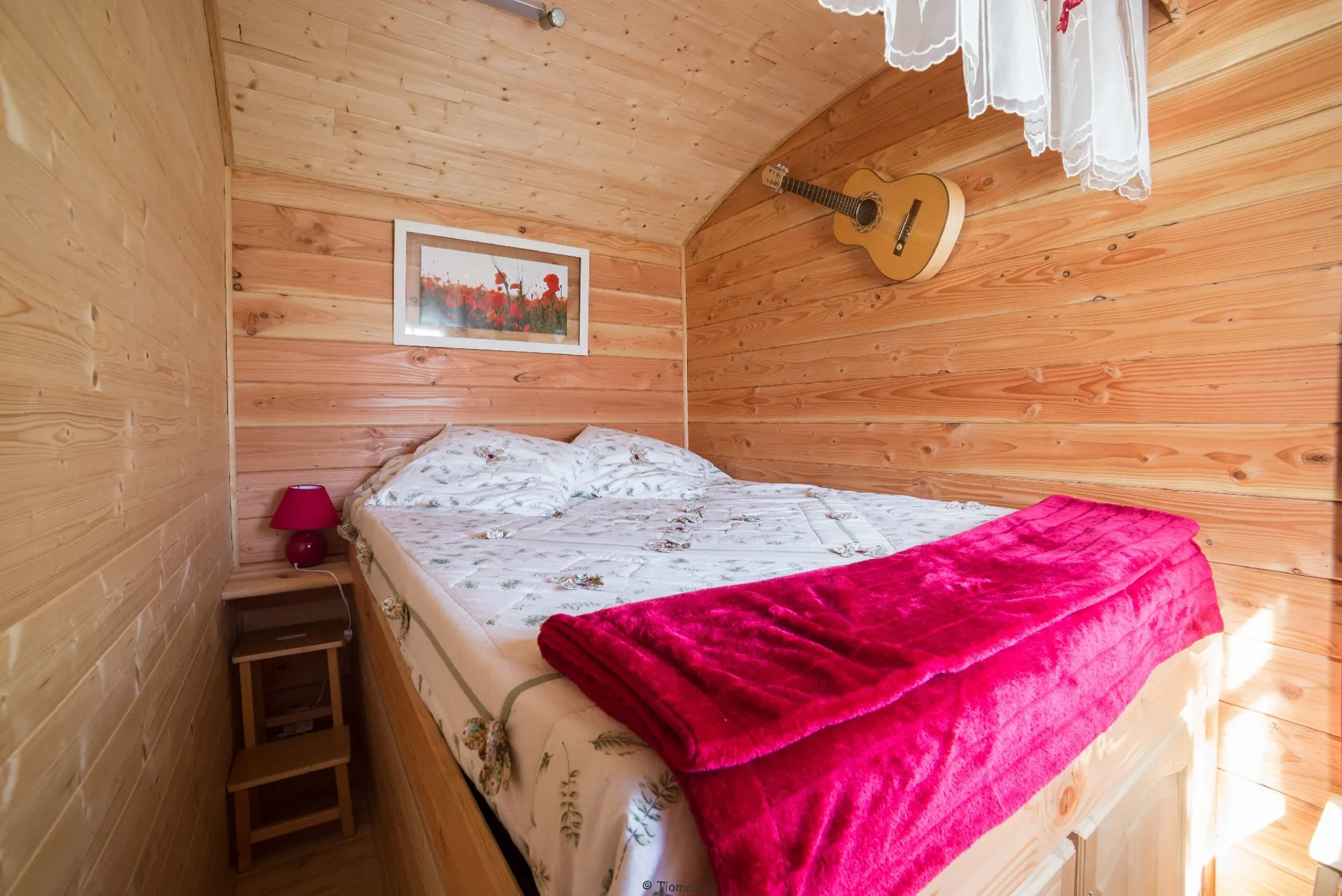Aux abords d’un hameau agricole des hauts plateaux du Lévezou, proche du lac de Pareloup et du bourg de Salles Curan, cette roulotte colorée et personnalisée est un véritable petit nid douillet et confortable.