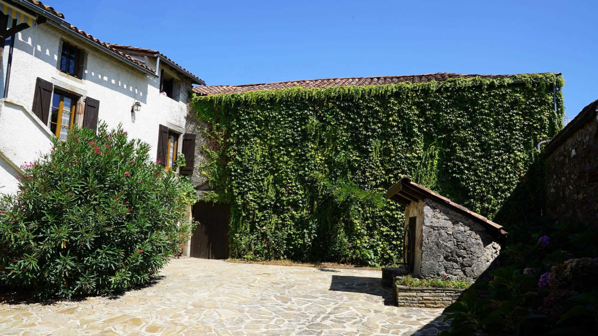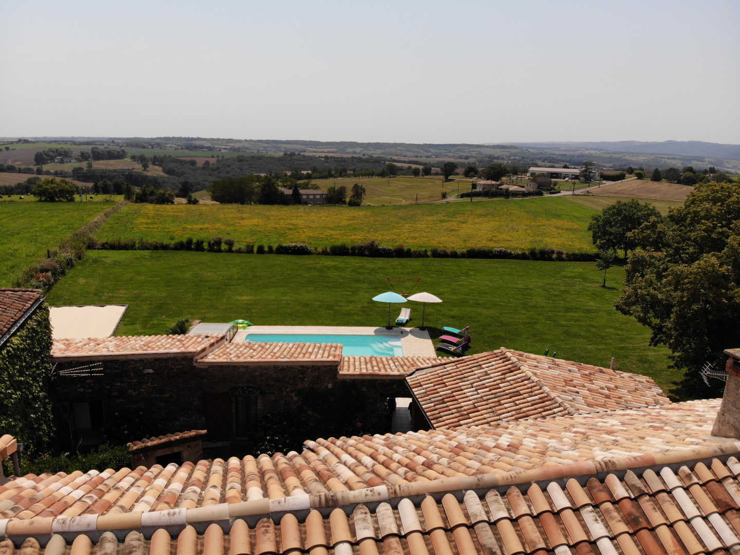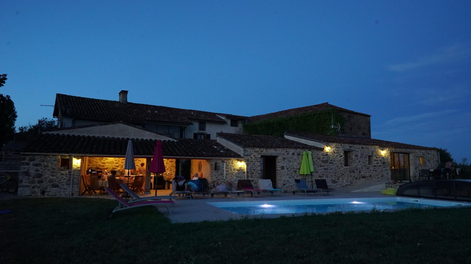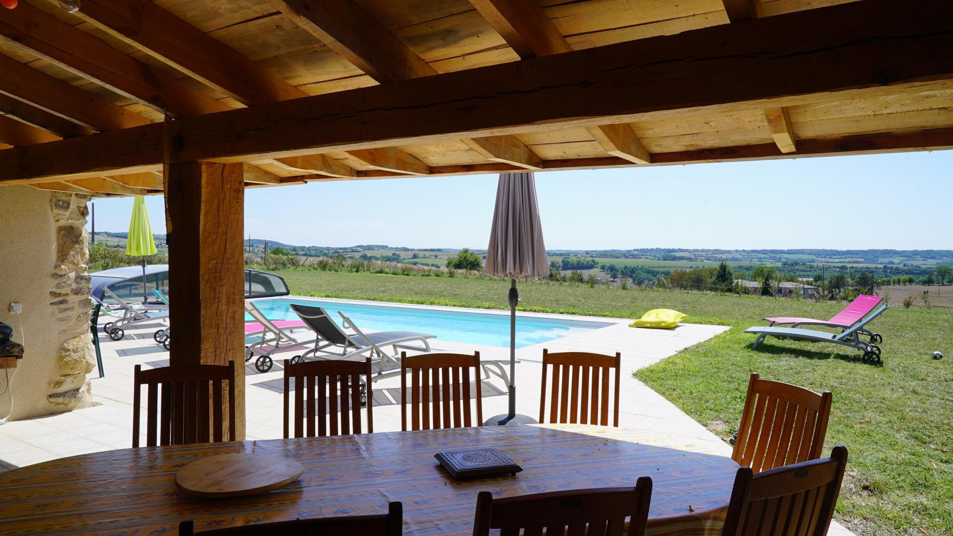 Au sud, vue panoramique sur tout le département, une jolie terrasse couverte avec cuisine, jardin ombragé, un boulodrome éclairé, et une belle piscine chauffée, rien que pour vous, un hamac sous des tilleuls pour un moment de repos au frais.