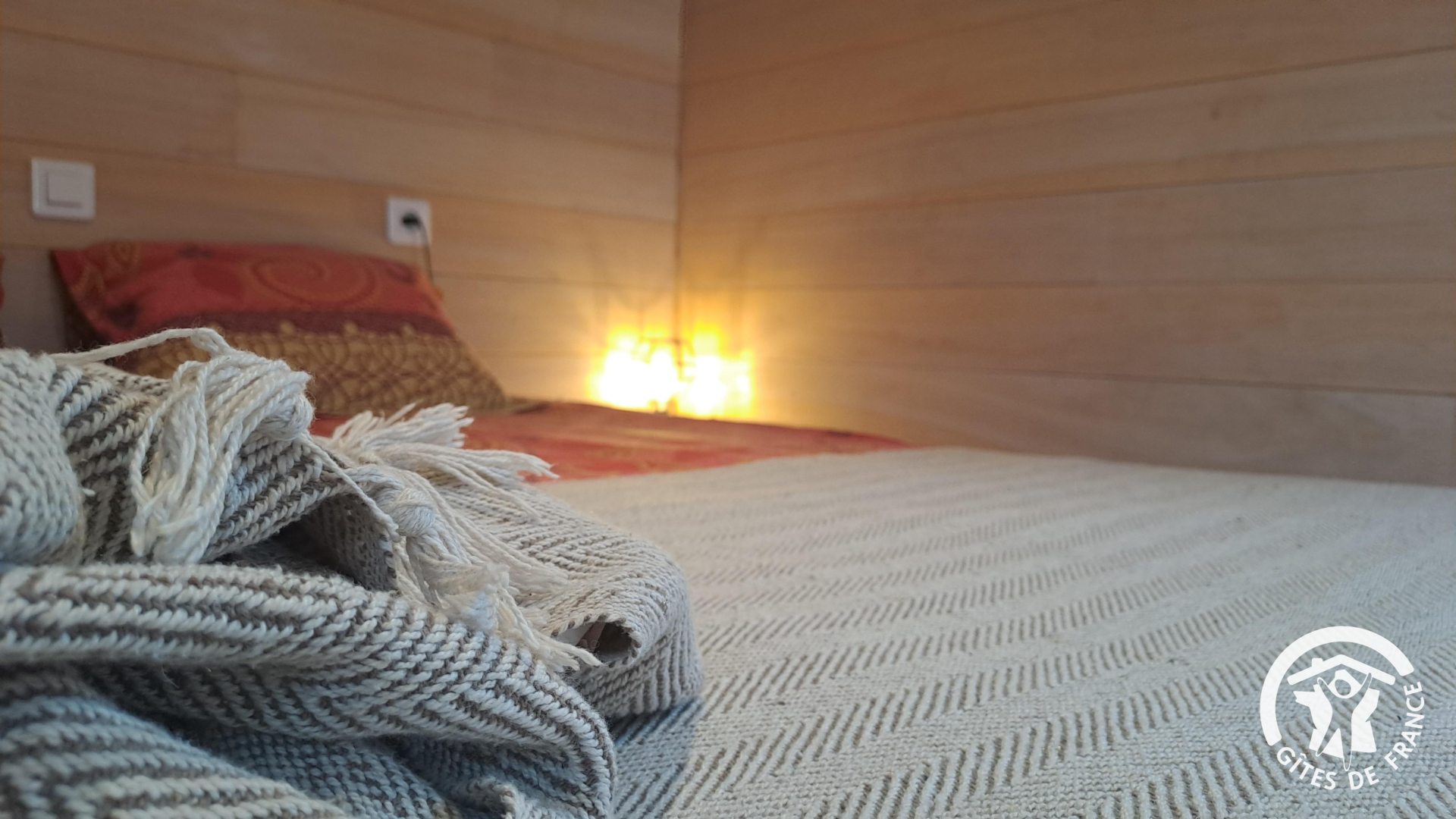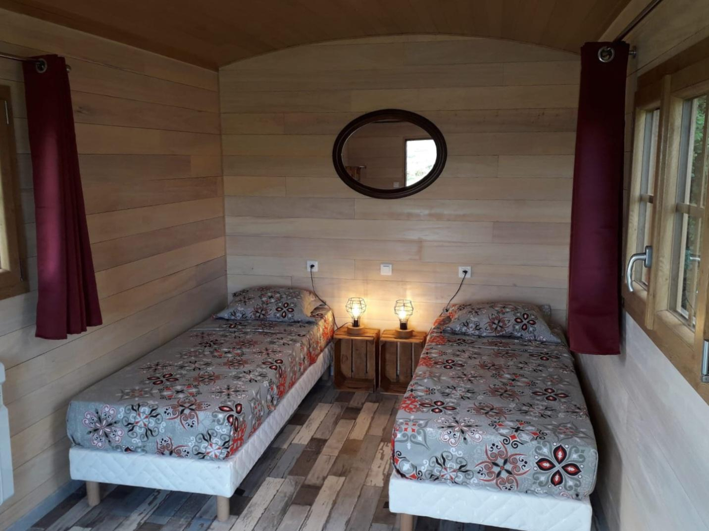 La ROULOTTE, véritable cocon, avec 2 lits simples qui peuvent se jumeler pour proposer un lit double. Les sanitaire se trouvent dans le gîte.