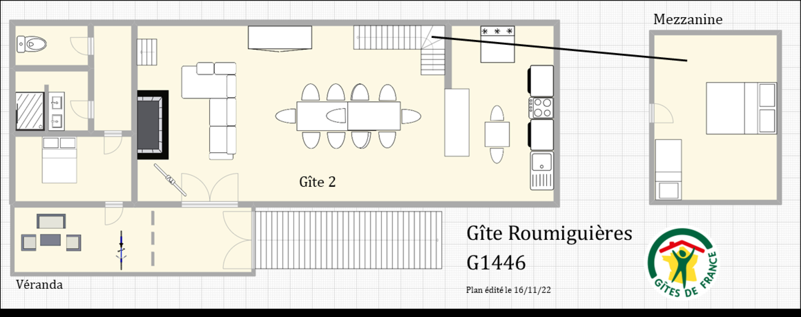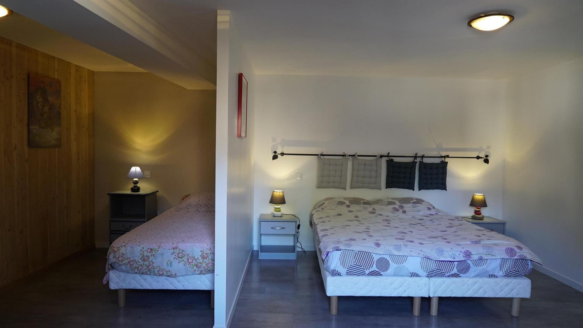 * Mezzanine : 1 chambre avec 1 lit simple et 2 lits simples qui peuvent se jumeler
