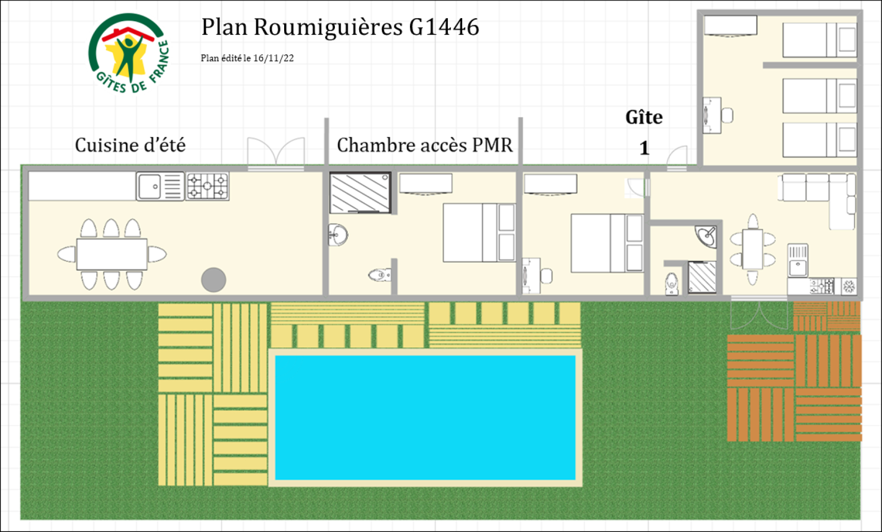 Une autre partie aménagée dans les dépendances, pour 5 personnes, donnant sur la cuisine extérieure et la piscine