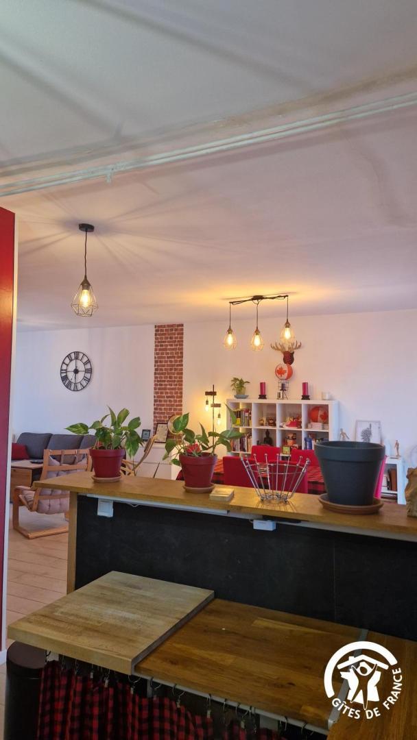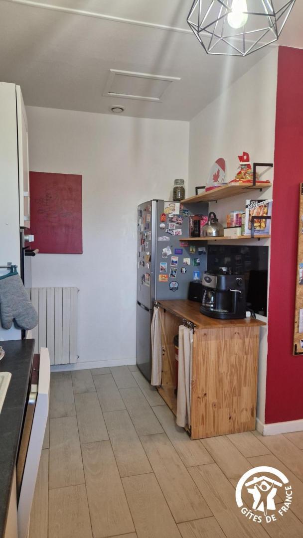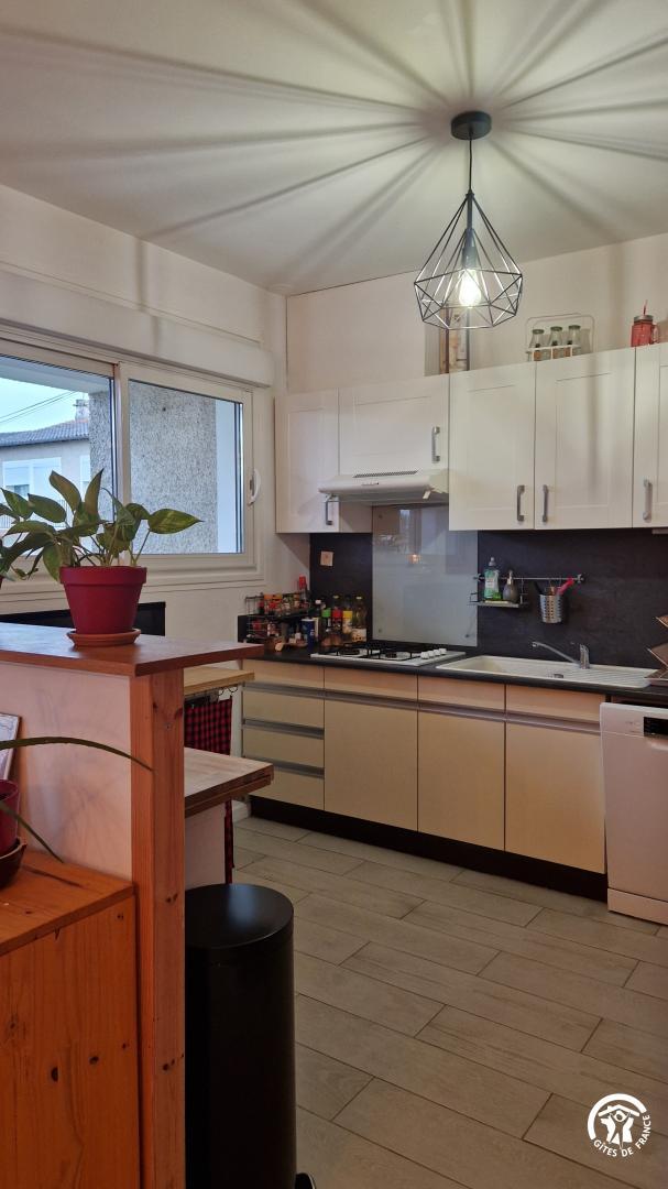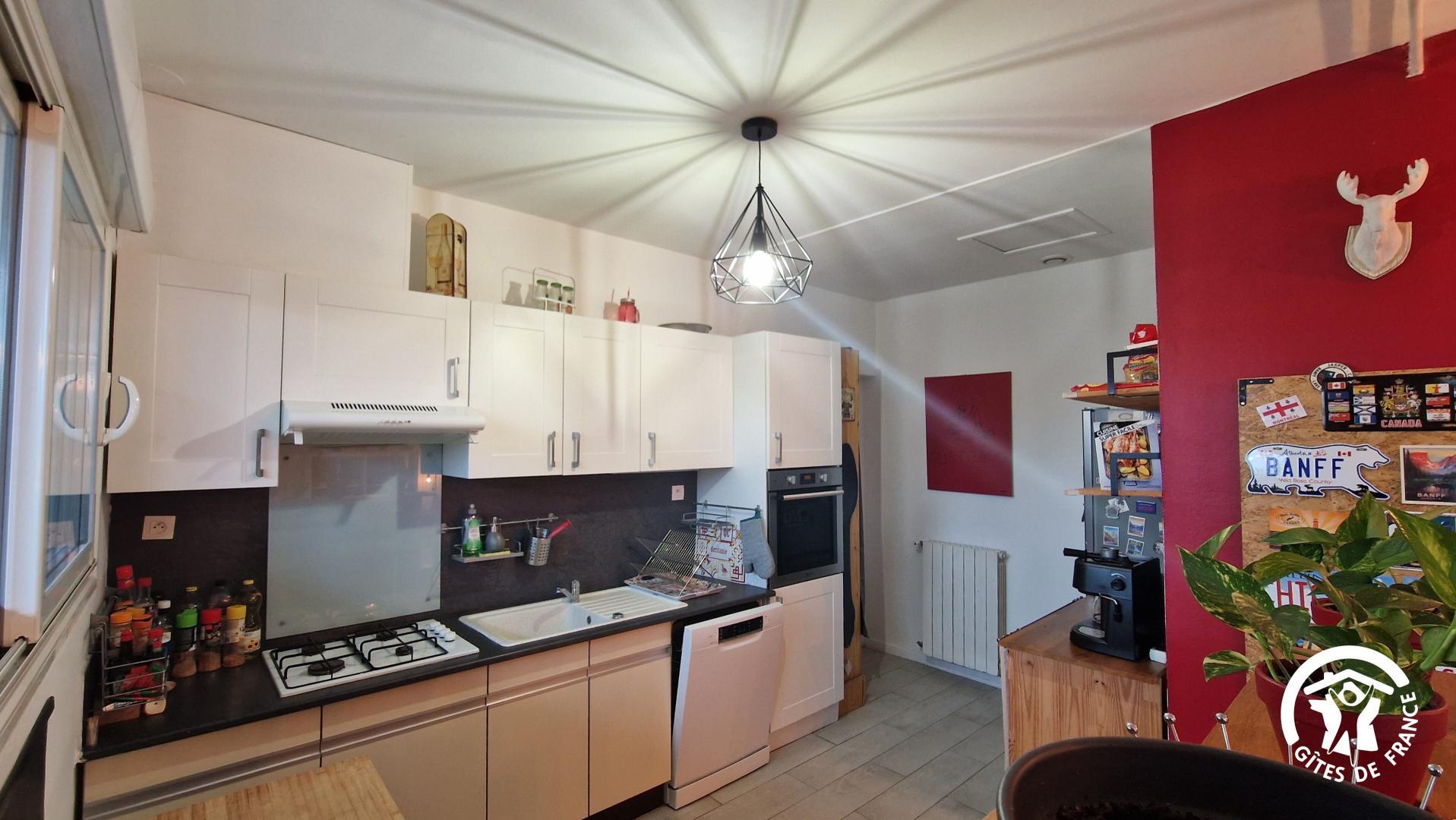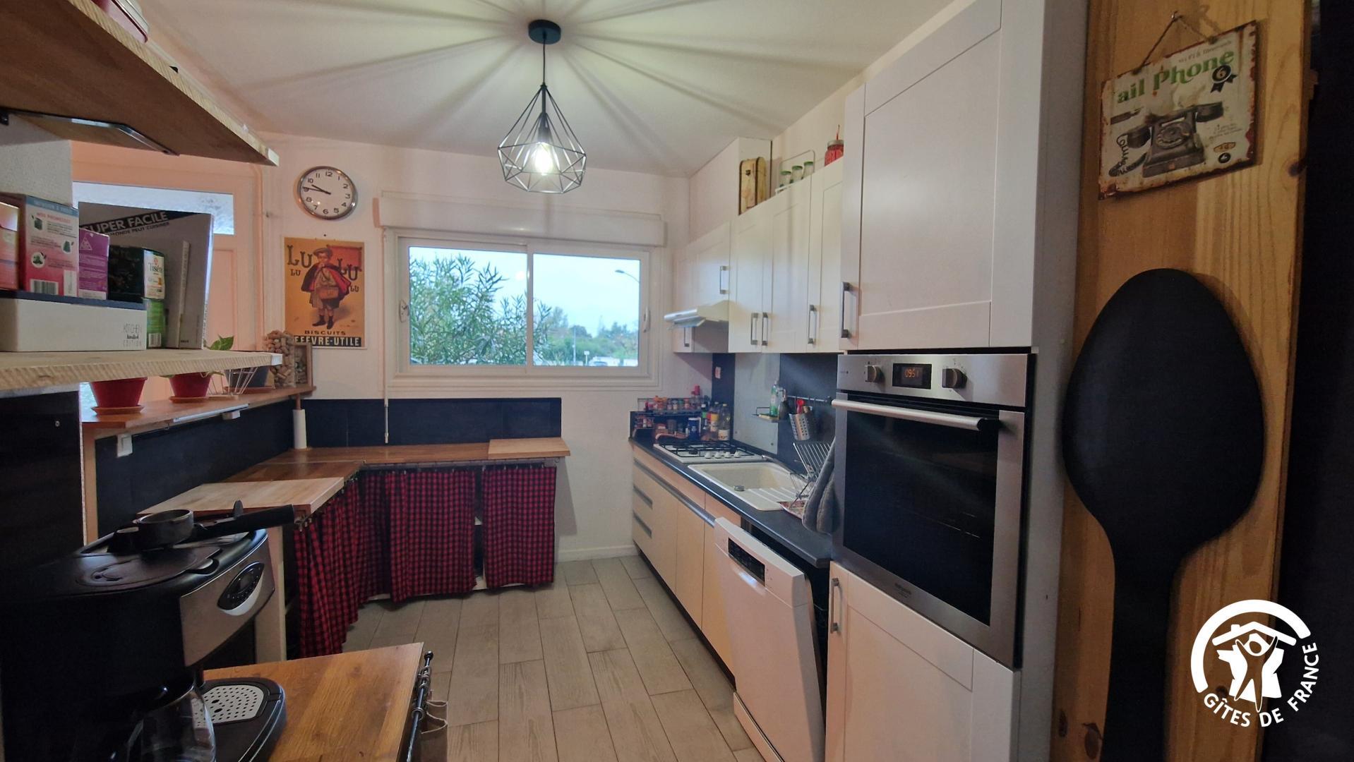 – la cuisine ouverte toute équipée : grille-pain, cafetière qui fait filtre et dosettes (café moulu), bouilloire, micro-ondes, lave-vaisselle, four, réfrigérateur avec congélateur, robot multifonctions, crêpière, gaufrier…