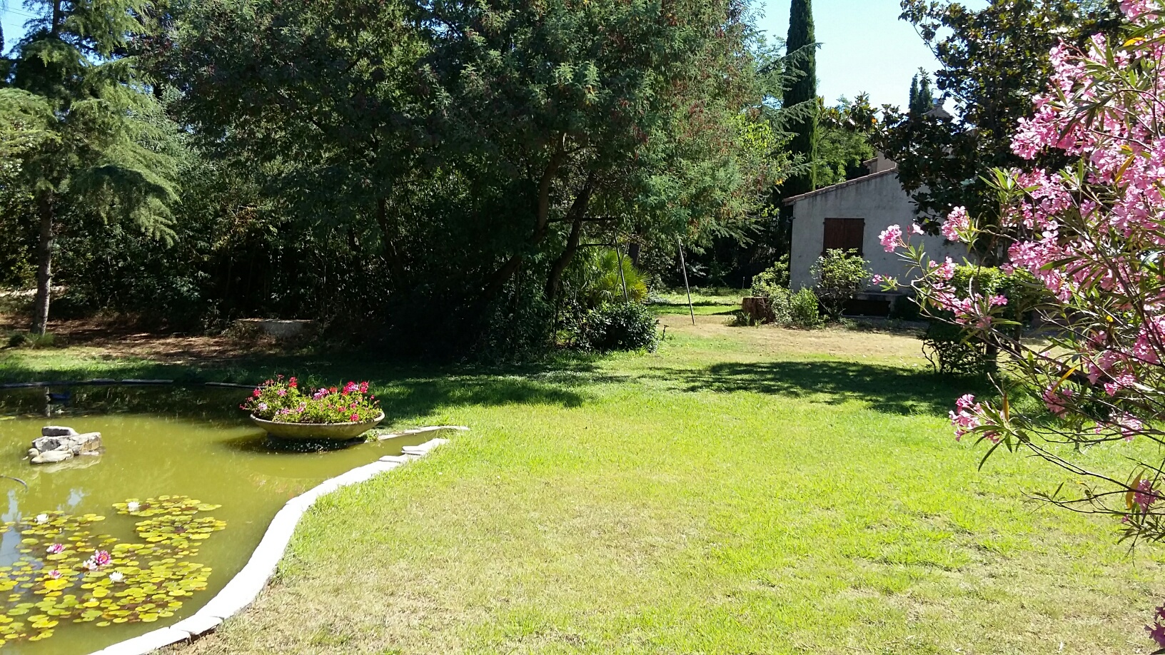 Extérieur arboré de 2500 m2 avec piscine privative de 13×6 m d’une profondeur de 1.20 à 2.50 m, sécurisée par volet électrique; bassin à poissons non sécurisé dans pelouse de 0.40 cm de profondeur, portique balançoire, trapèze pour enfants, table ping-pong sur demande