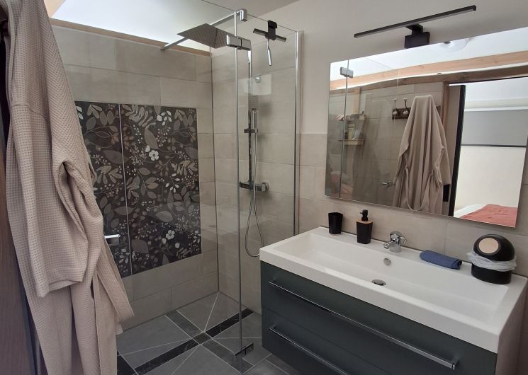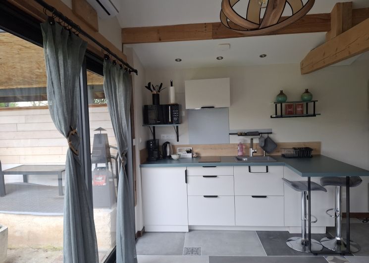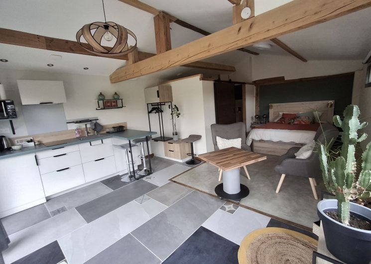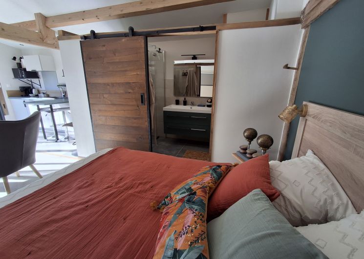 Studio Cocoon de plain pied avec sa large baie vitrée pour une vue panoramique sur la terrasse ombragée et le jardinet. Espace non fumeur, climatisé Eté/Hiver pour deux personnes, avec charme alliant le rustique et le contemporain doté d’une enceinte Bluetooth pour votre confort. Le logement est équipé d’un lit coffre en 140 (pour couette et oreillers supplémentaires), une salle de bain toilette avec douche à l’italienne, une cuisine avec vaisselle et petit électroménager nécessaire pour votre séjour. Le lit est fait à l’arrivée et le linge de toilette est inclus. Un local à ski et à vélos sécurisé est à disposition. Sur le secteur dans un périmètre de 10 Km, toutes les commodités:supermarché, pharmacie, carburants et des restaurants sympa… Sur le village, boite à pains et viennoiseries.