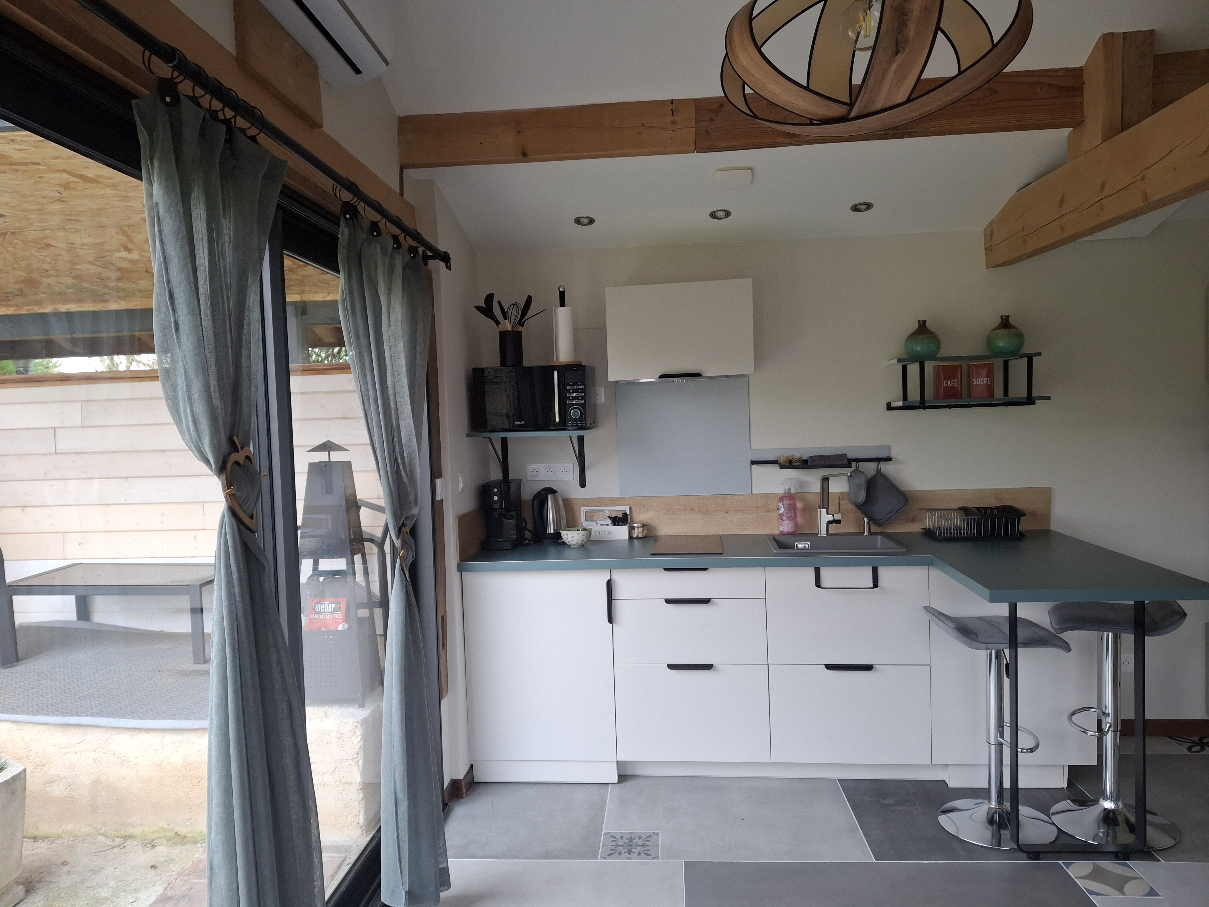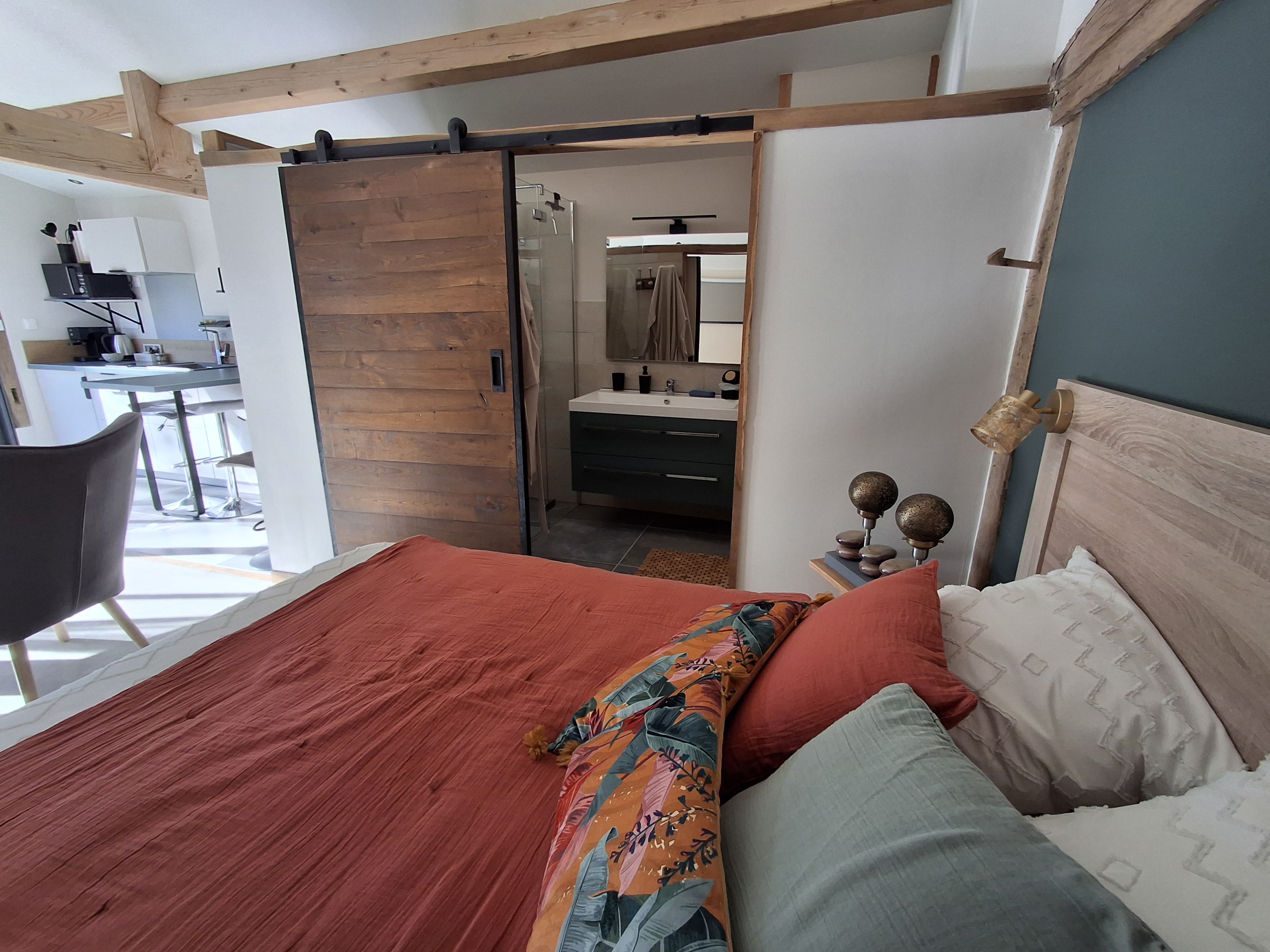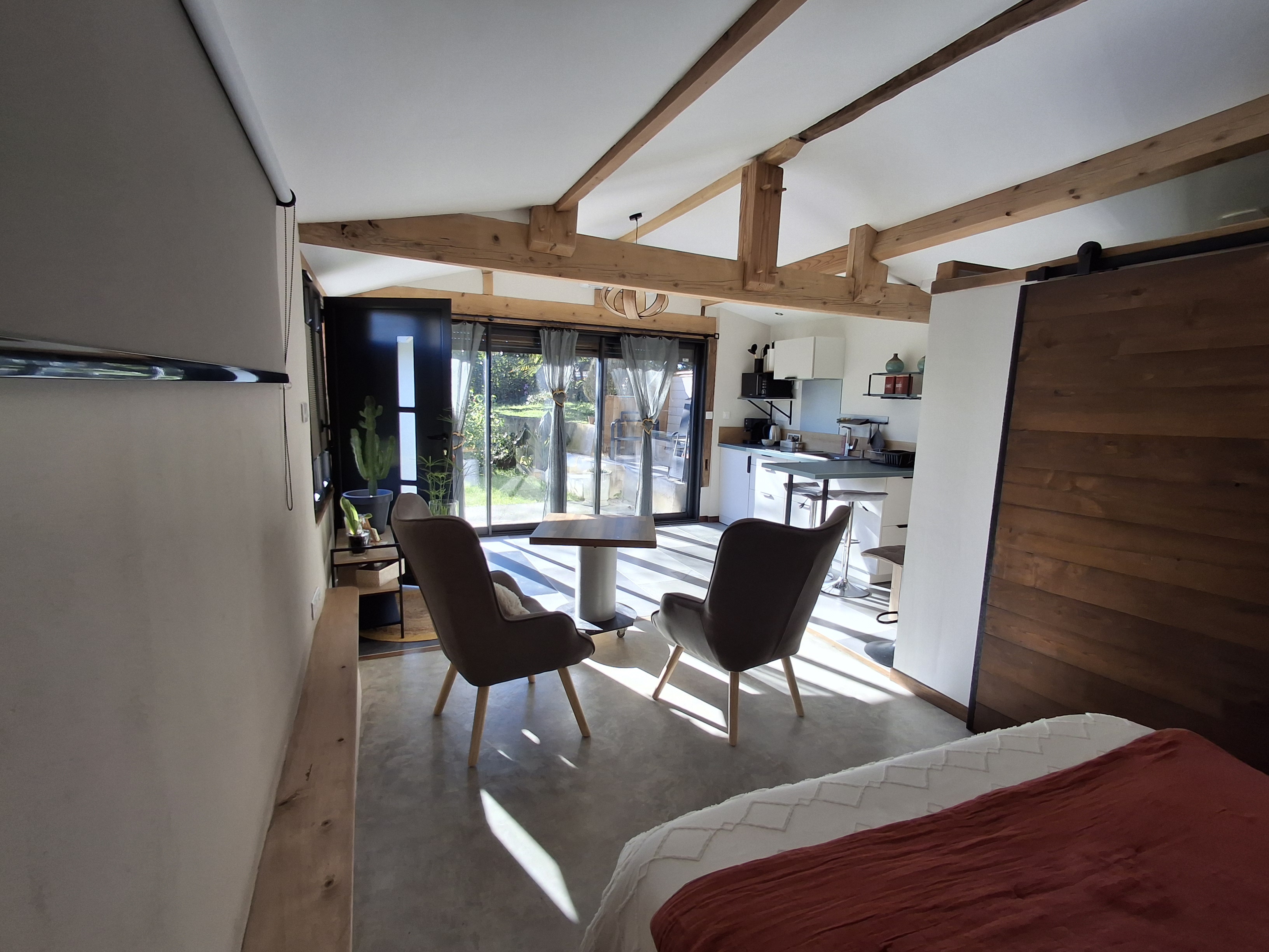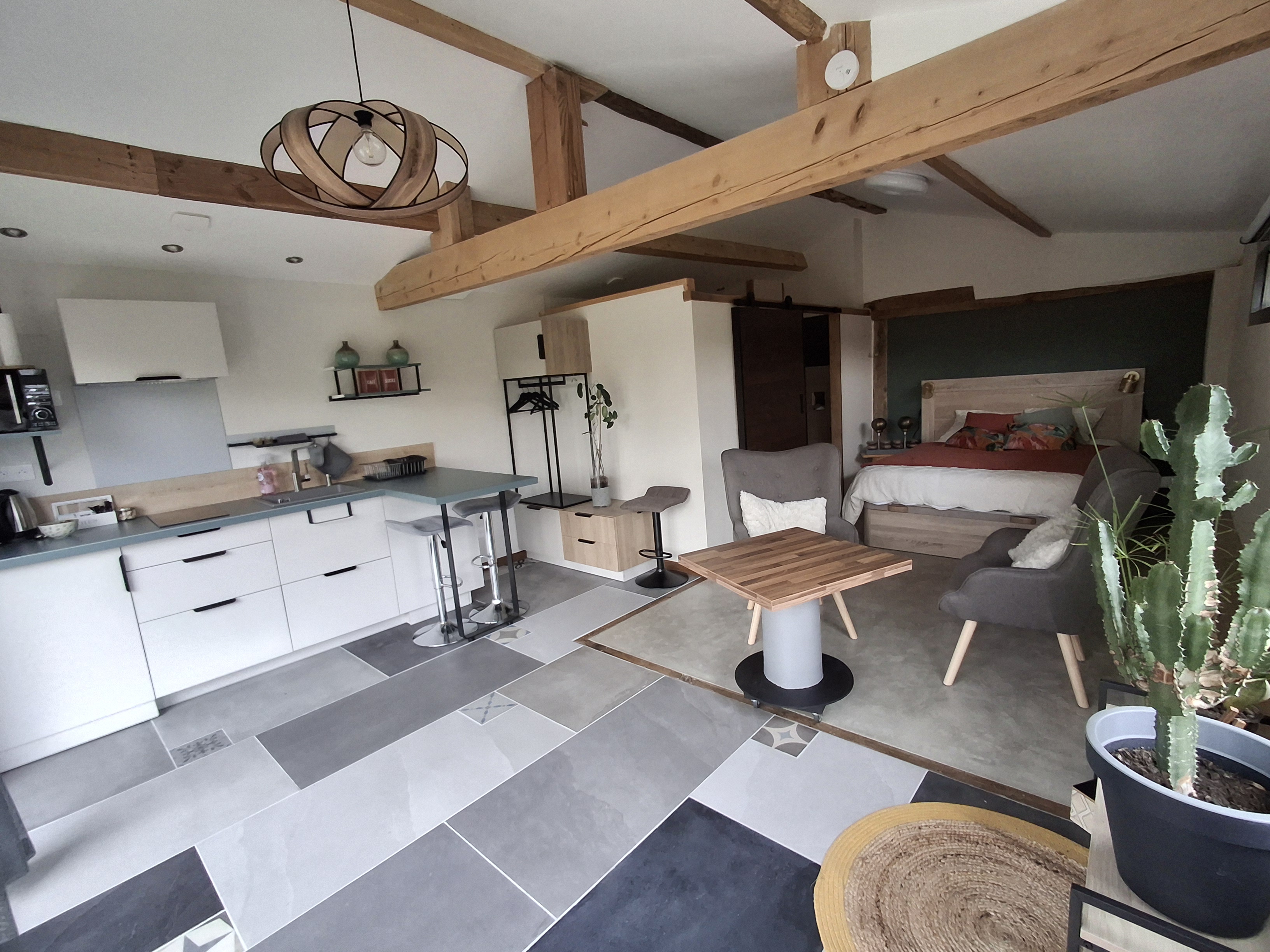 Studio Cocoon de plain pied avec sa large baie vitrée pour une vue panoramique sur la terrasse ombragée et le jardinet. Espace non fumeur, climatisé Eté/Hiver pour deux personnes, avec charme alliant le rustique et le contemporain doté d’une enceinte Bluetooth pour votre confort. Le logement est équipé d’un lit coffre en 140 (pour couette et oreillers supplémentaires), une salle de bain toilette avec douche à l’italienne, une cuisine avec vaisselle et petit électroménager nécessaire pour votre séjour. Le lit est fait à l’arrivée et le linge de toilette est inclus. Un local à ski et à vélos sécurisé est à disposition. Sur le secteur dans un périmètre de 10 Km, toutes les commodités:supermarché, pharmacie, carburants et des restaurants sympa… Sur le village, boite à pains et viennoiseries.