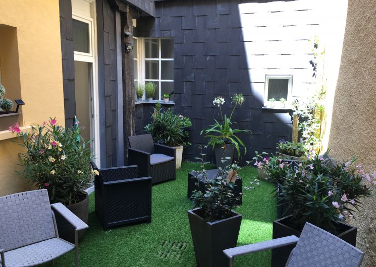 En rdc d’une petite maison bourgeoise sécurisée, elle offre une belle cuisine indépendante entièrement équipée (four, frigo-congélateur, plaque à induction, lave vaisselle, lave-linge,…), aspirateur, étendoir, fer et table à repasser… Un espace salon avec canapé et lit dans armoire de qualité en 140 offrant un système d’ouverture facile, matelas grand confort, TV écran plat Livebox orange et Netflix et wifi gratuit. Un espace salle à manger et une belle salle d’eau avec douche à receveur extra plat, accès direct à la petite cour commune agrémentée de salons de jardin . .