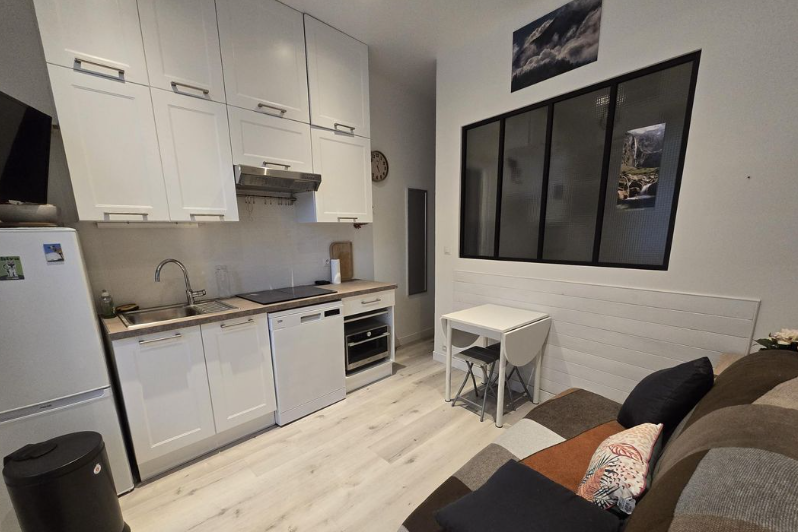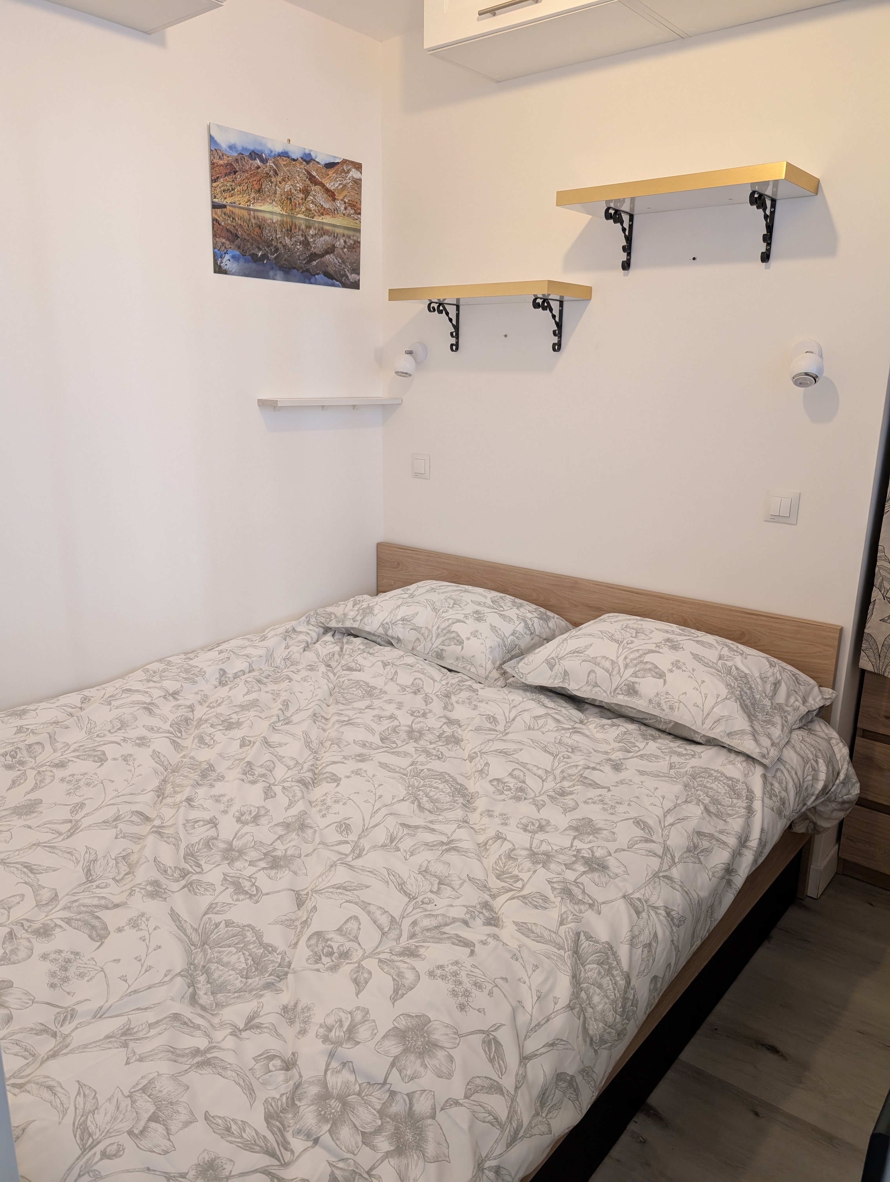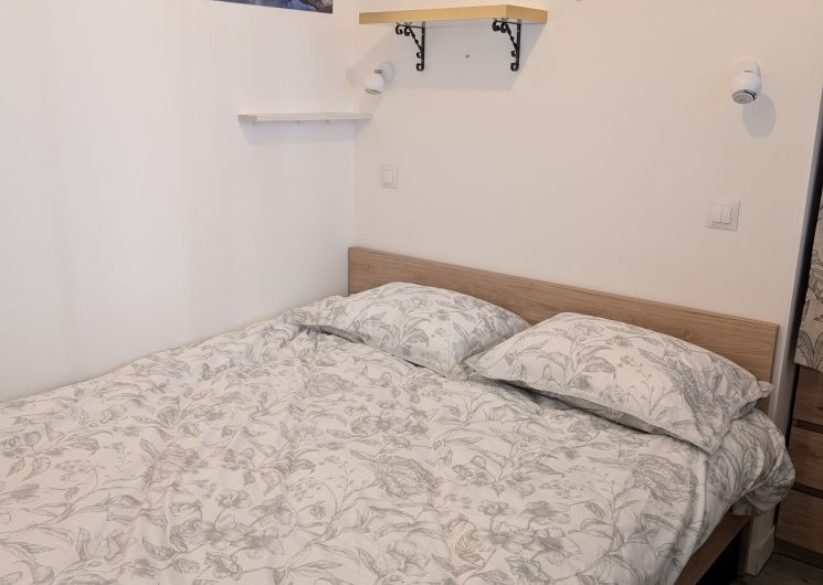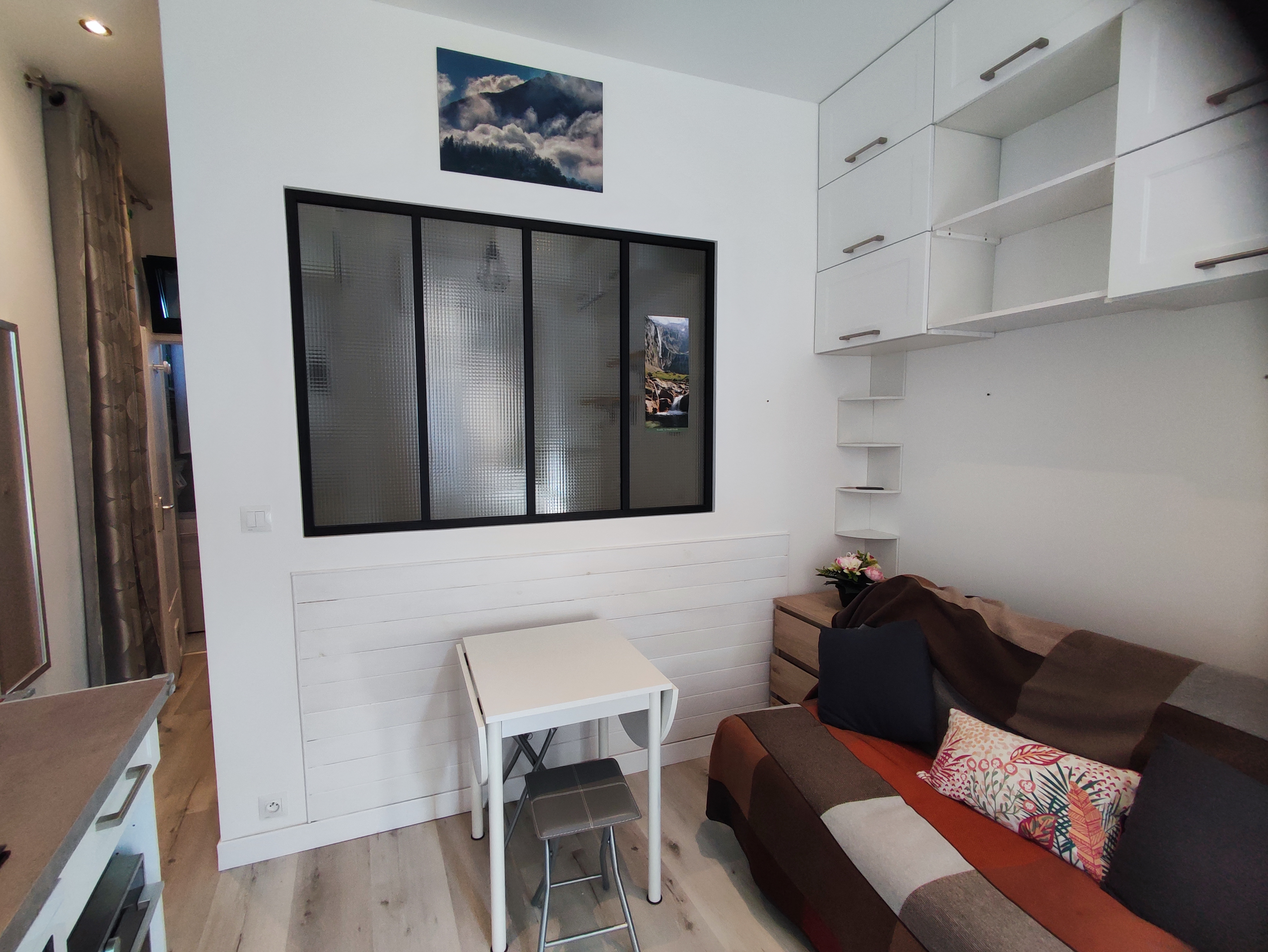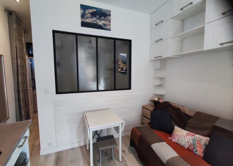 Studio de 23m² pour 1 ou 2 personnes comprenant : – une kitchenette équipée (four micro-ondes, lave-vaisselle) ouverte sur un espace salon/couchage avec un canapé BZ convertible (140*190), TV – un coin nuit fermé par une porte coulissante avec un lit en 160*200 – une salle d’eau (douche) avec WC et lave-linge La location bénéficie d’un local à skis/vélo. Places de parking public à proximité.