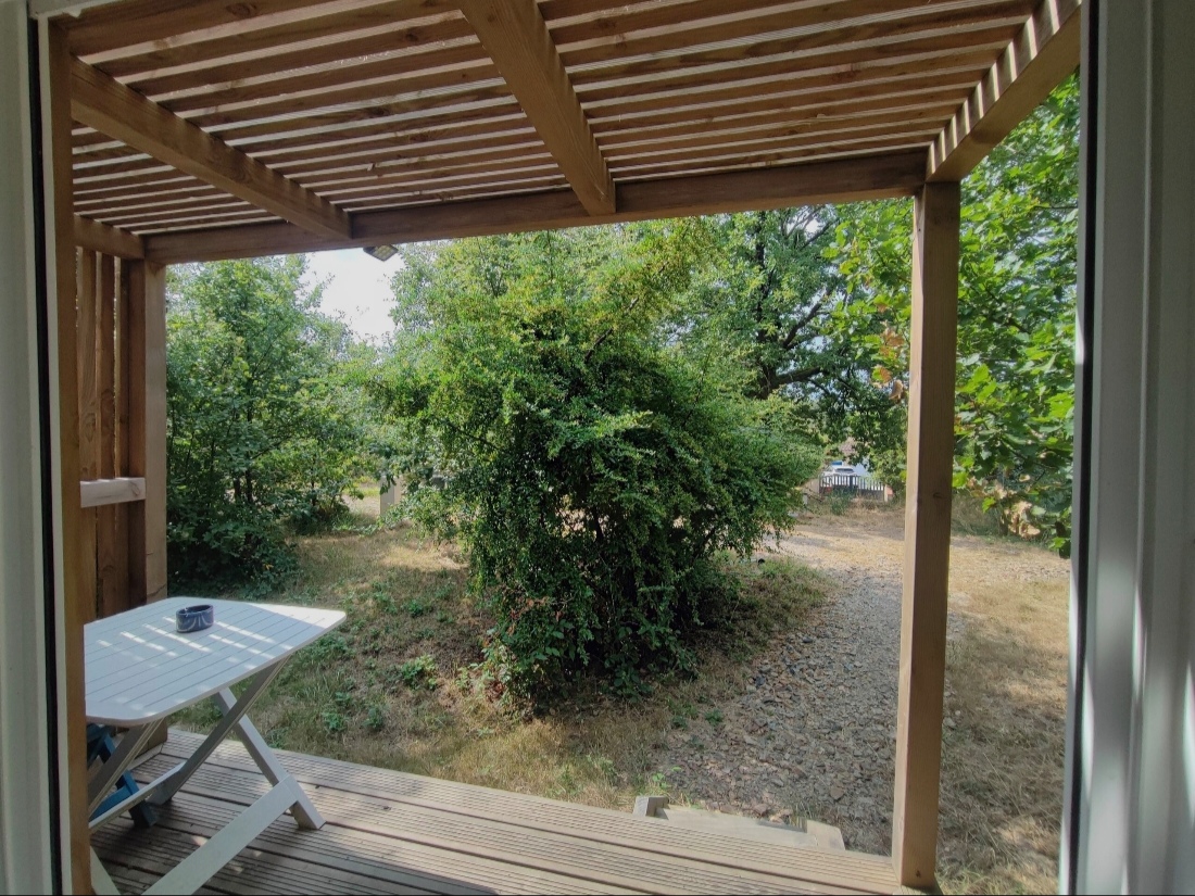 À l’extérieur, une terrasse avec pergola et salon de jardin vous permet de profiter pleinement de la nature environnante.