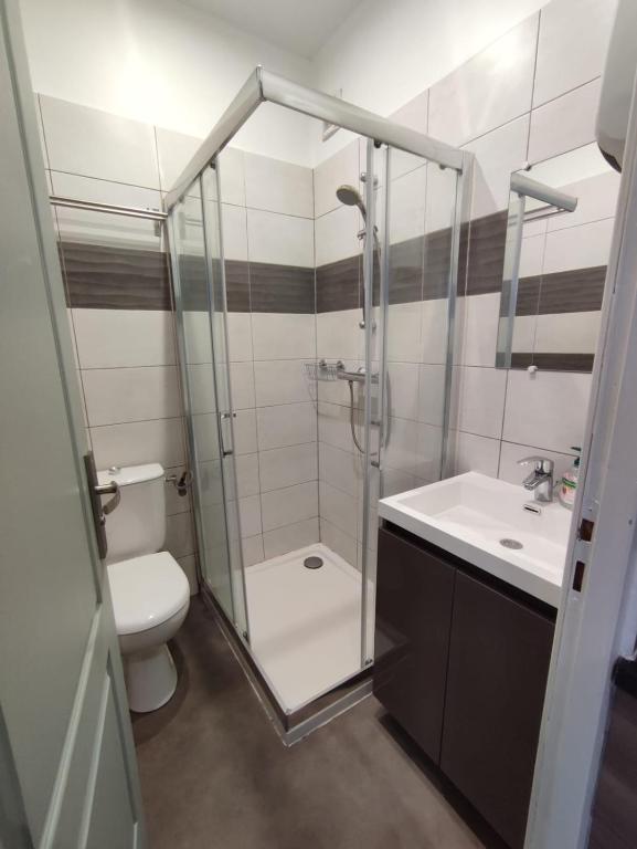 La salle de bains est équipée d’une douche, avec WC intégrés.