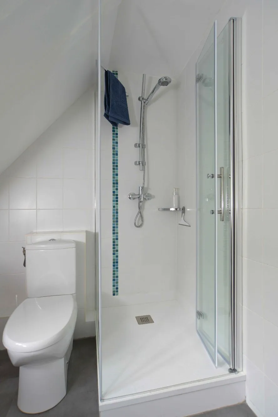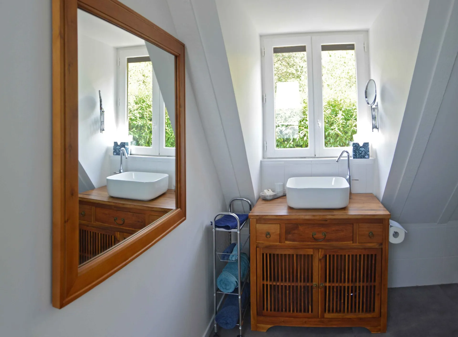 Nous avons aménagé avec soin 2 jolies chambres mansardées. Elles sont au 1er étage de la maison à côté de notre chambre. Il n’y pas d’entrée privée. Nous vous ouvrons notre maison, nous partagerons les espaces communs. Chaque chambre a sa propre salle d’eau (lavabo, douche & WC).