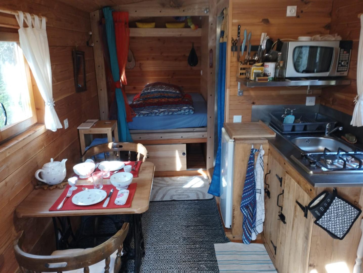 Dans un esprit cocooning, vous trouverez un espace cuisine avec une plaque de cuisson 2 feux, un frigo top, un four micro-onde combiné, une bouilloire et une cafetière à piston.