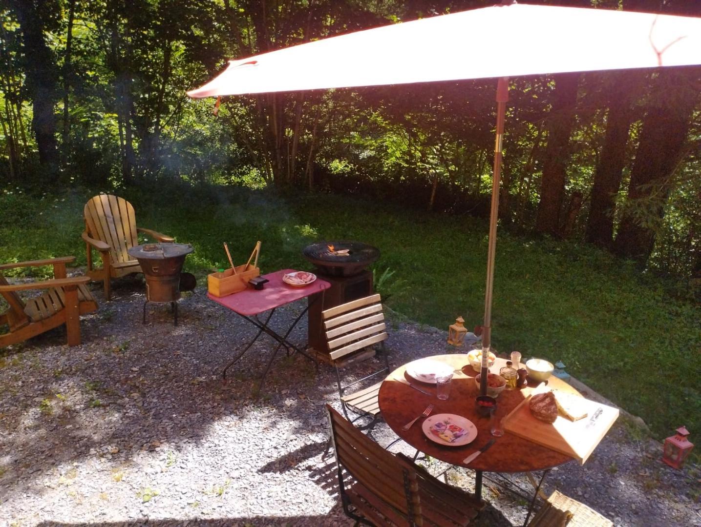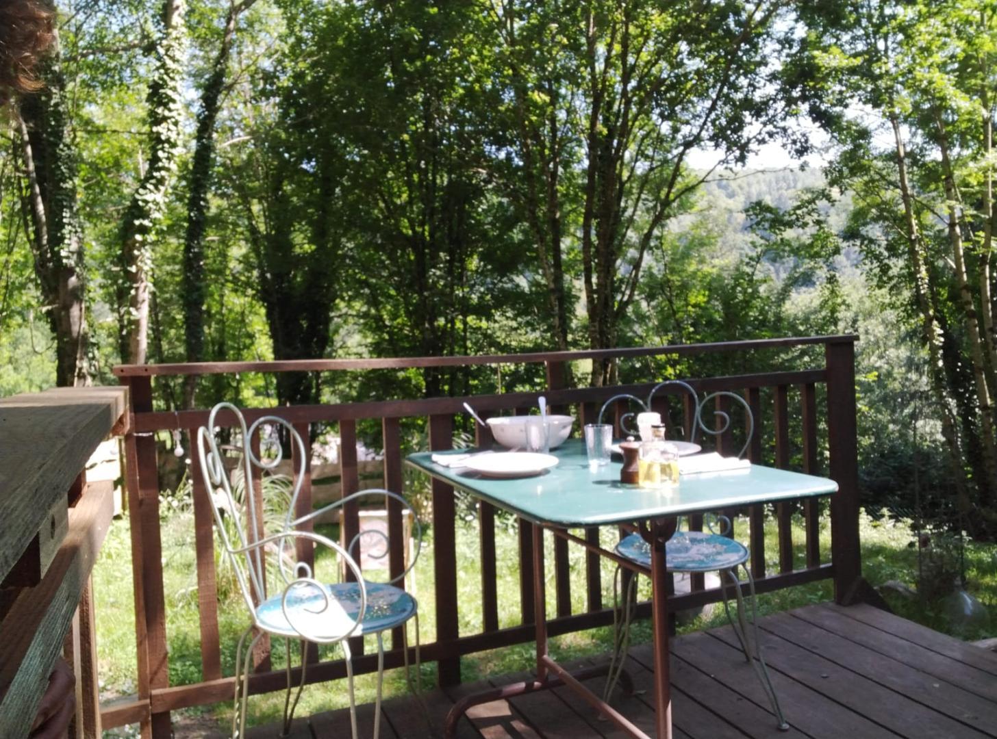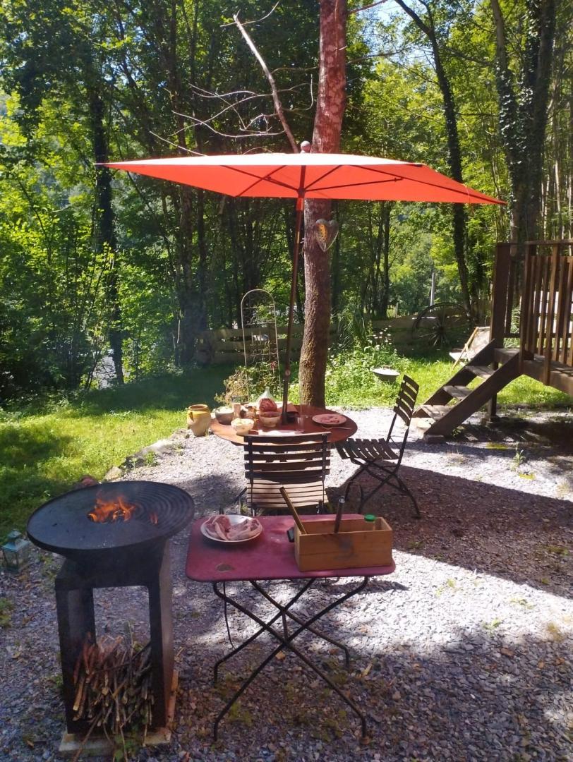 Terrasse avec table et chaises pour apprécier son café (ou son thé) du matin. La roulotte est posée sur un terrain clos, au milieu de la forêt. Vous avez à disposition des chaises en bois et un barbecue.