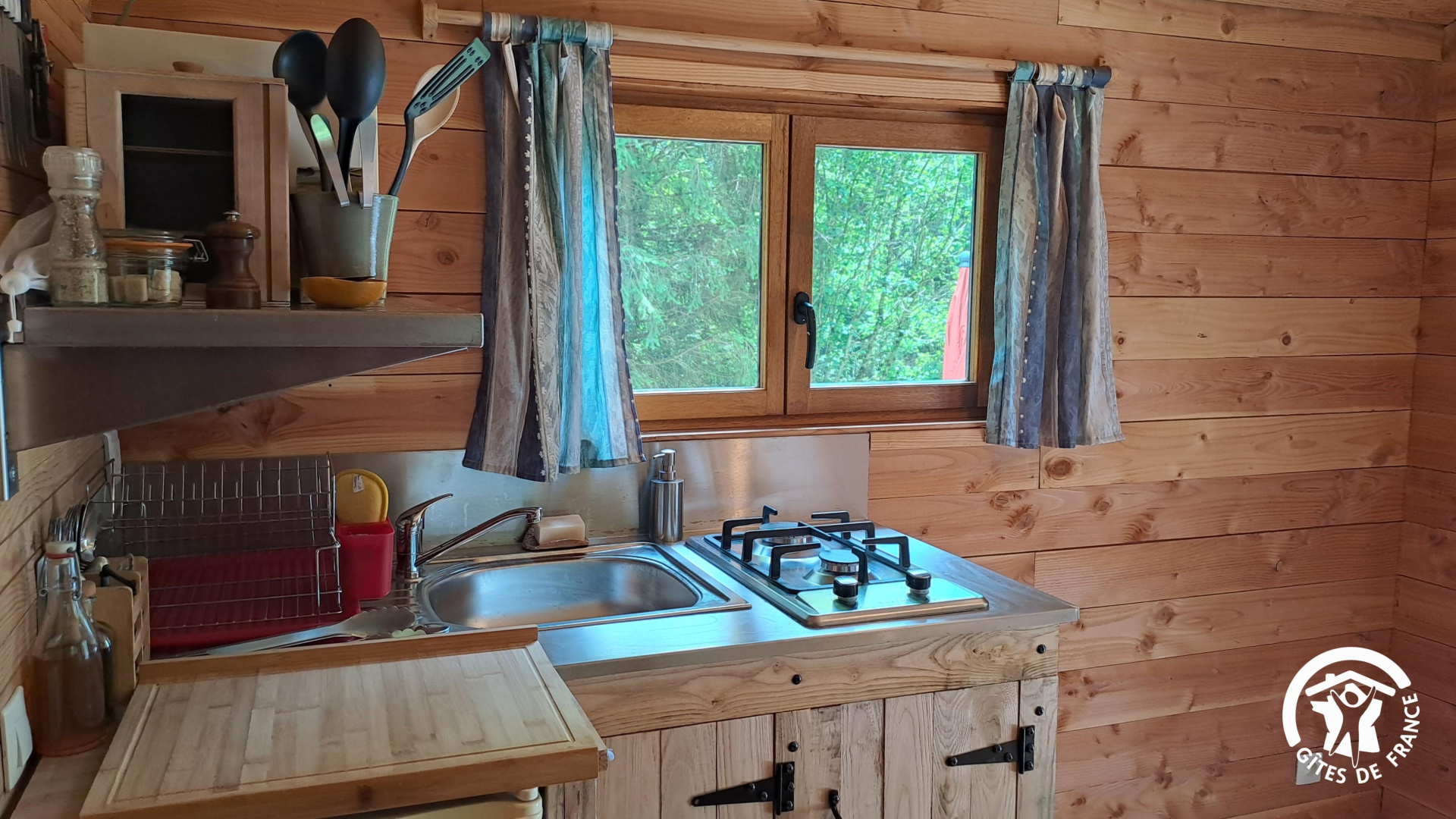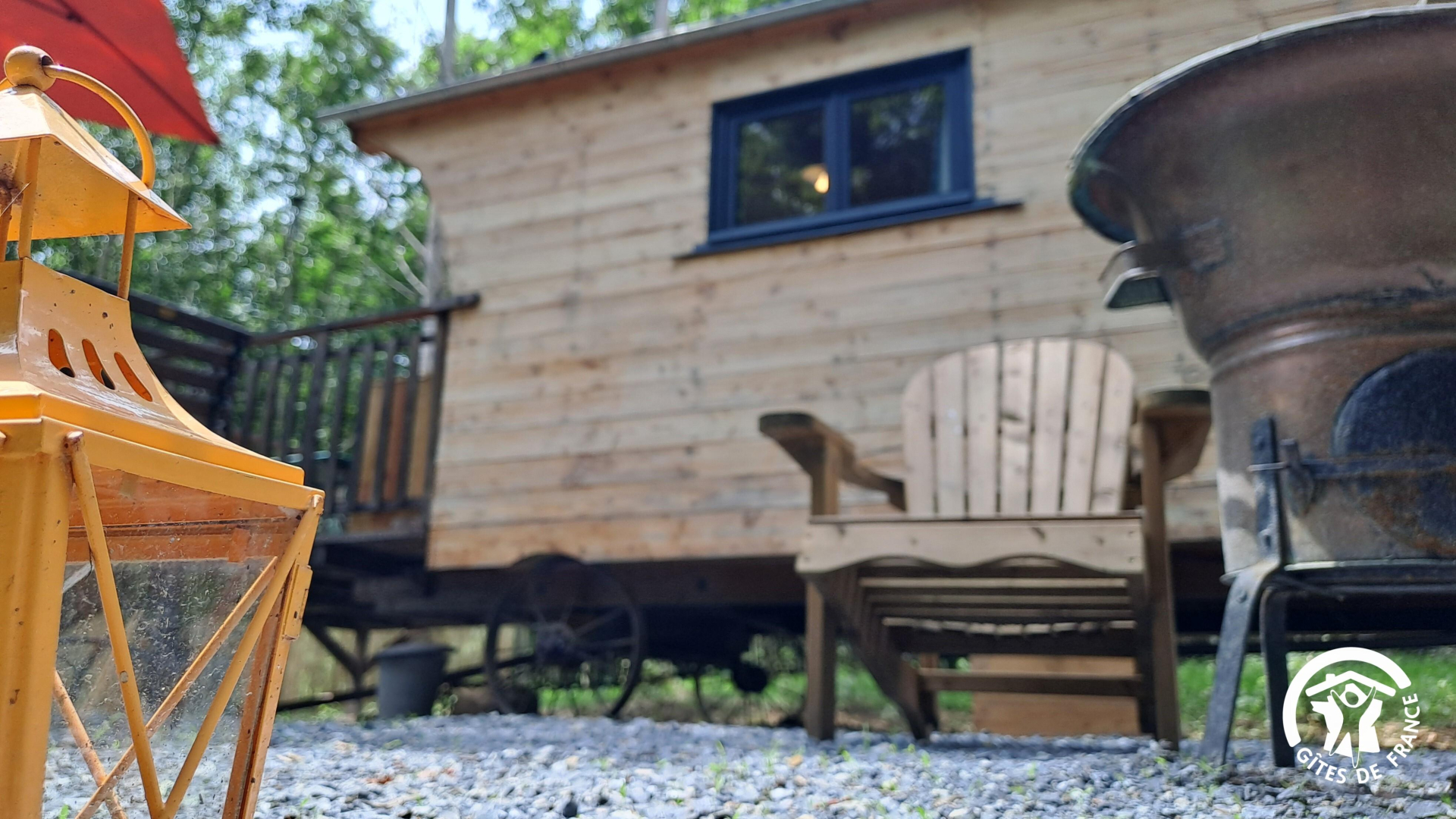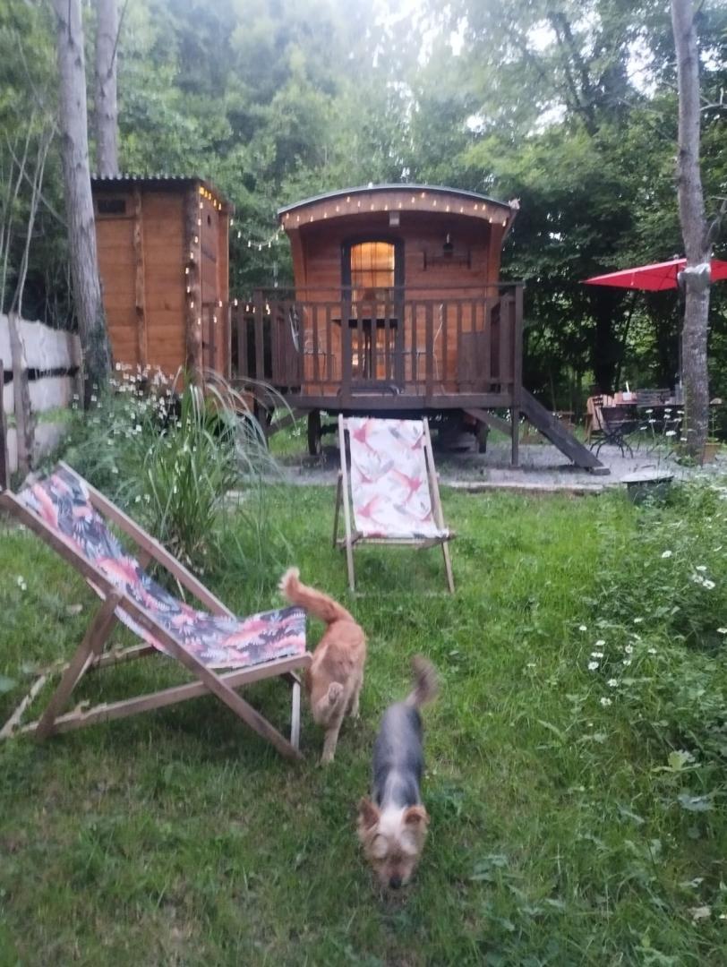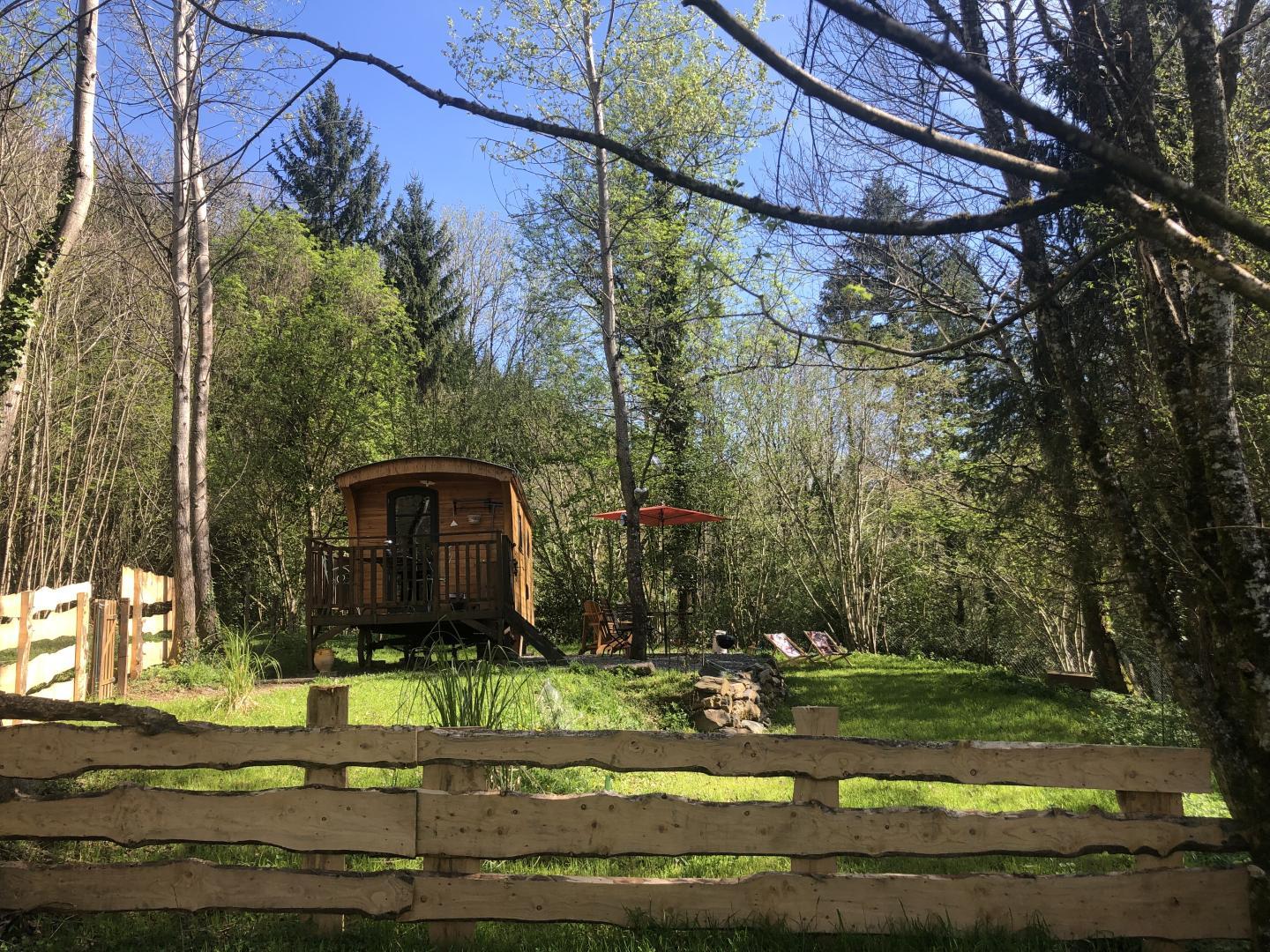 La Roulotte est accessible avec un petit chemin à une cinquantaine de mètres du parking, au-dessus d’un second gîte pour 2 personnes, en plein cœur de la forêt. Pas de vis-à-vis autour de vous, hormis les arbres !