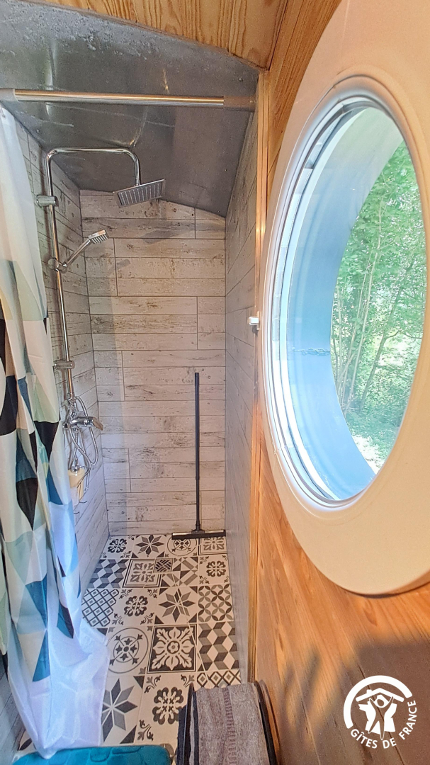 Espace « salle d’eau » derrière un rideau avec toilettes sèches et douche. Il est recommandé d’utiliser des produits Ecocert® pour respecter la nature environnante (puits filtré avec eaux grises). Il faudra utiliser le lavabo de la cuisine pour la toilette du matin et du soir.
