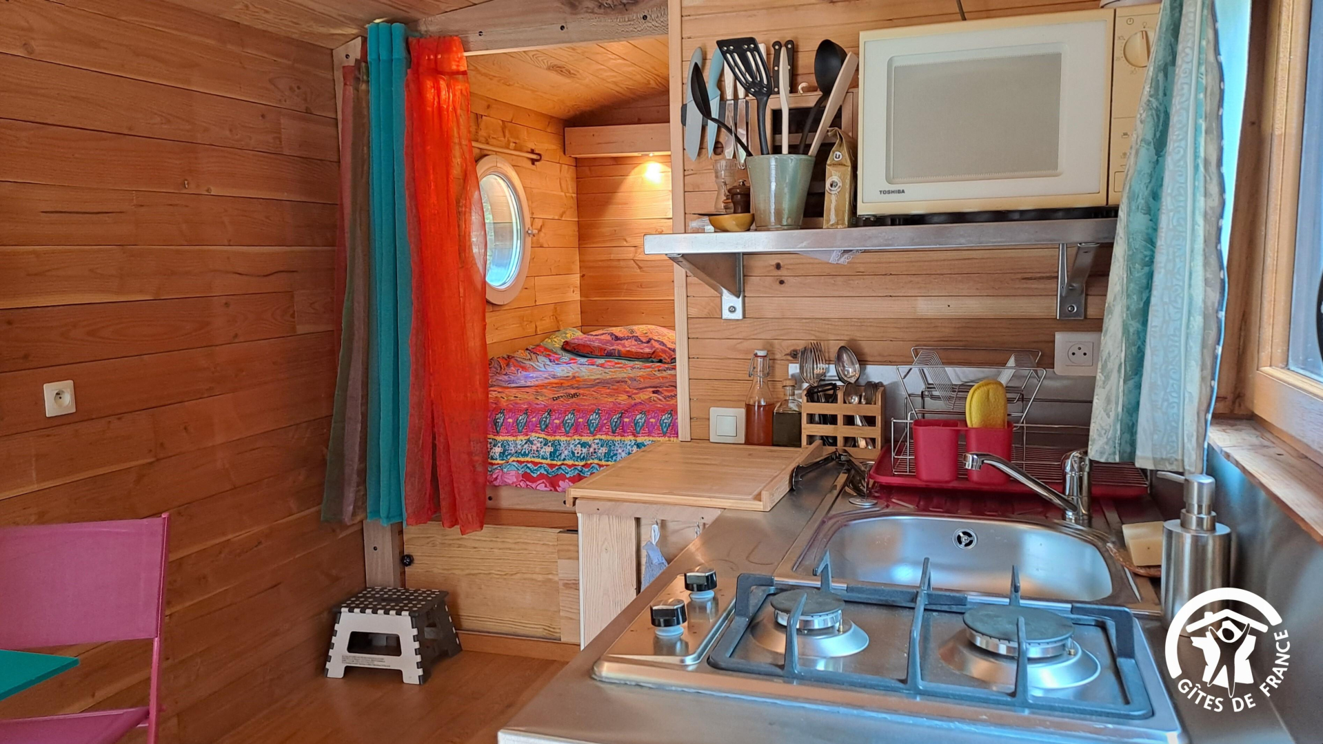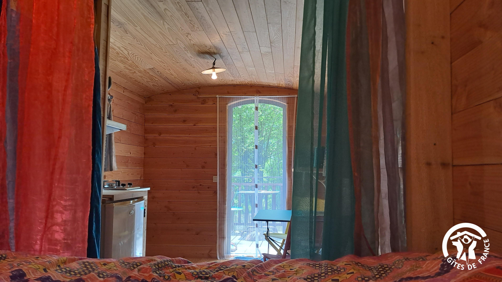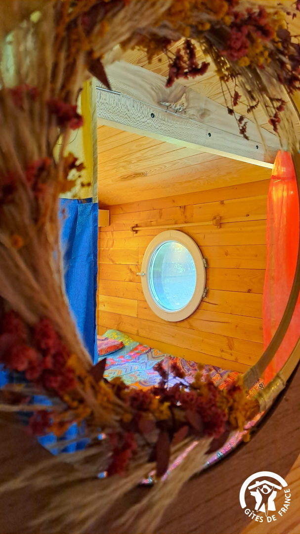 Espace nuit derrière les rideaux, avec un petit hublot donnant sur la forêt. Lit en 140x190cm surélevé.