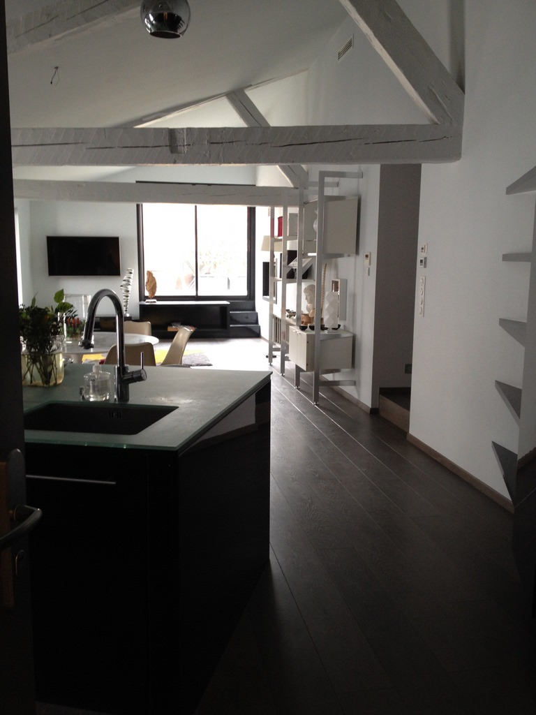 Appartement de 170m2. Pièce principale de 55m2 avec grande hauteur sous plafond et charpente apparente, cuisine americaine, coin repas salon avec 4 fenetres sur joli patio avec accès direct sur une terrasse de 20m2 sans vis a vis ainsi que sur une terrasse/balcon. 2 chambres avec grand dressing et grande salle d’eau, douche à l’italienne, 1 autre chambre, 1 salle de bain, 1 buanderie, 1 garage /garage velo.