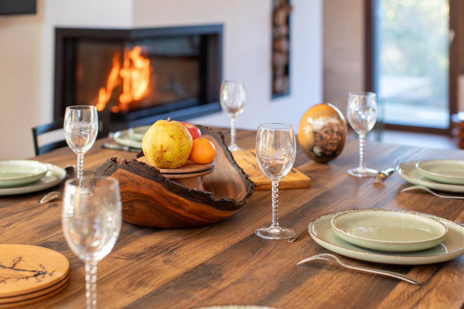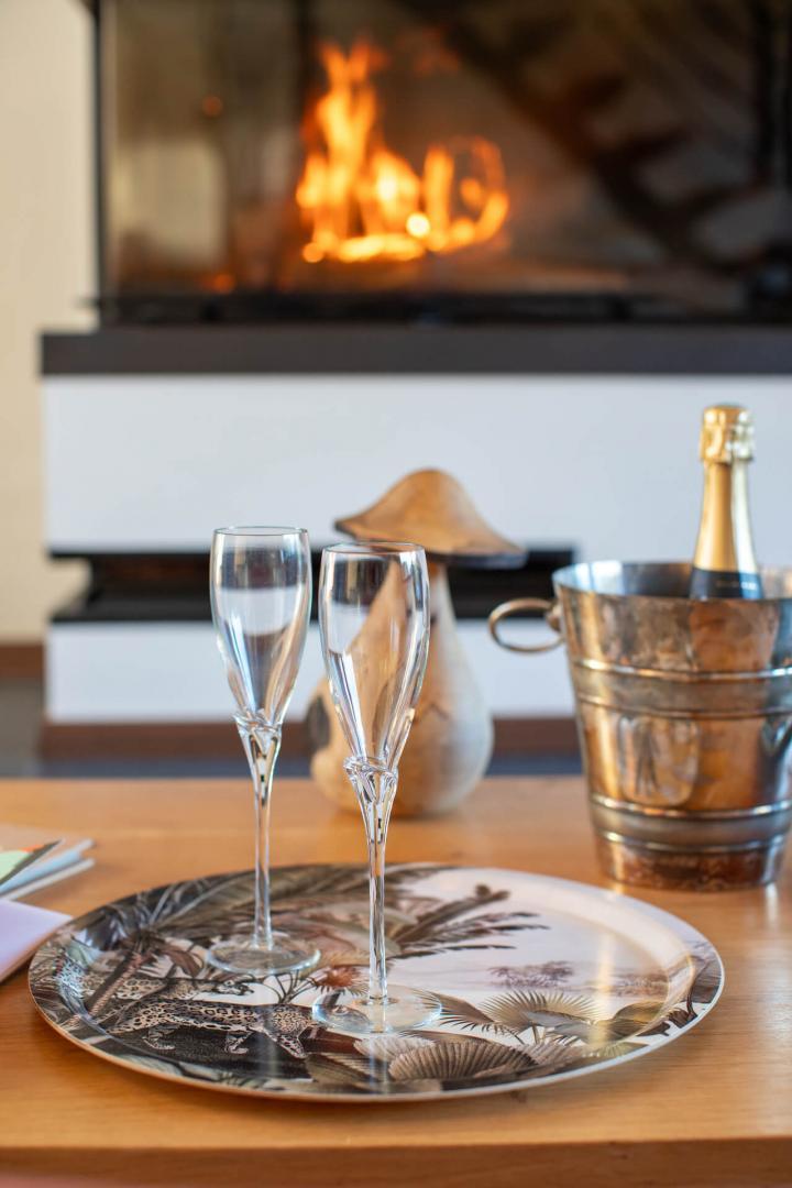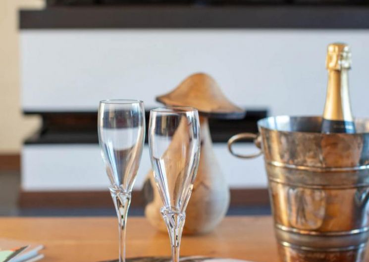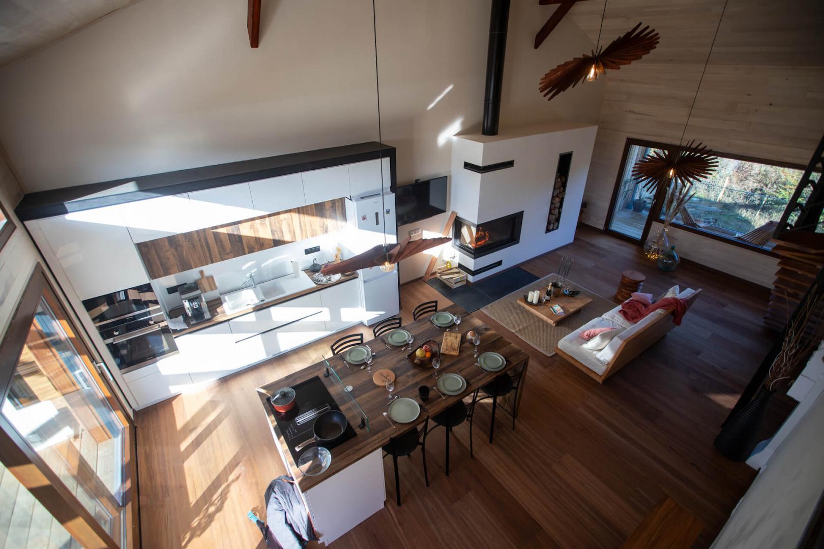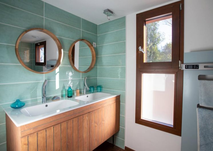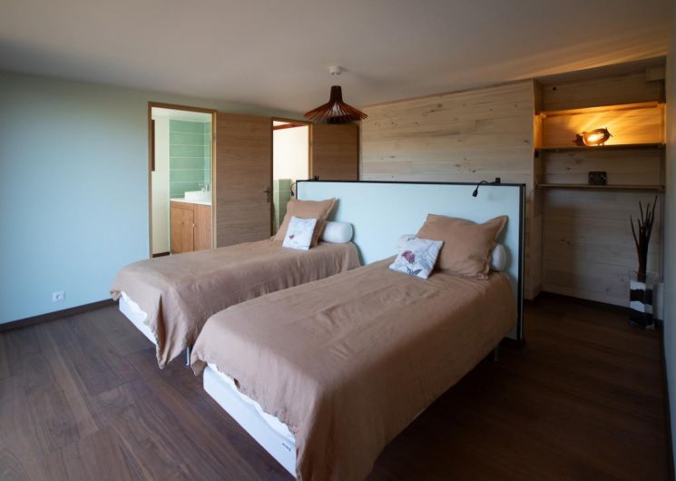 – Au rez-de-chaussée : une vaste pièce de jour avec séjour cathédrale et cheminée (foyer double vitres), 2 chambres avec 1 lit en 180cm et 2 lits 90, chacune avec une salle d’eau privative et un WC séparé.