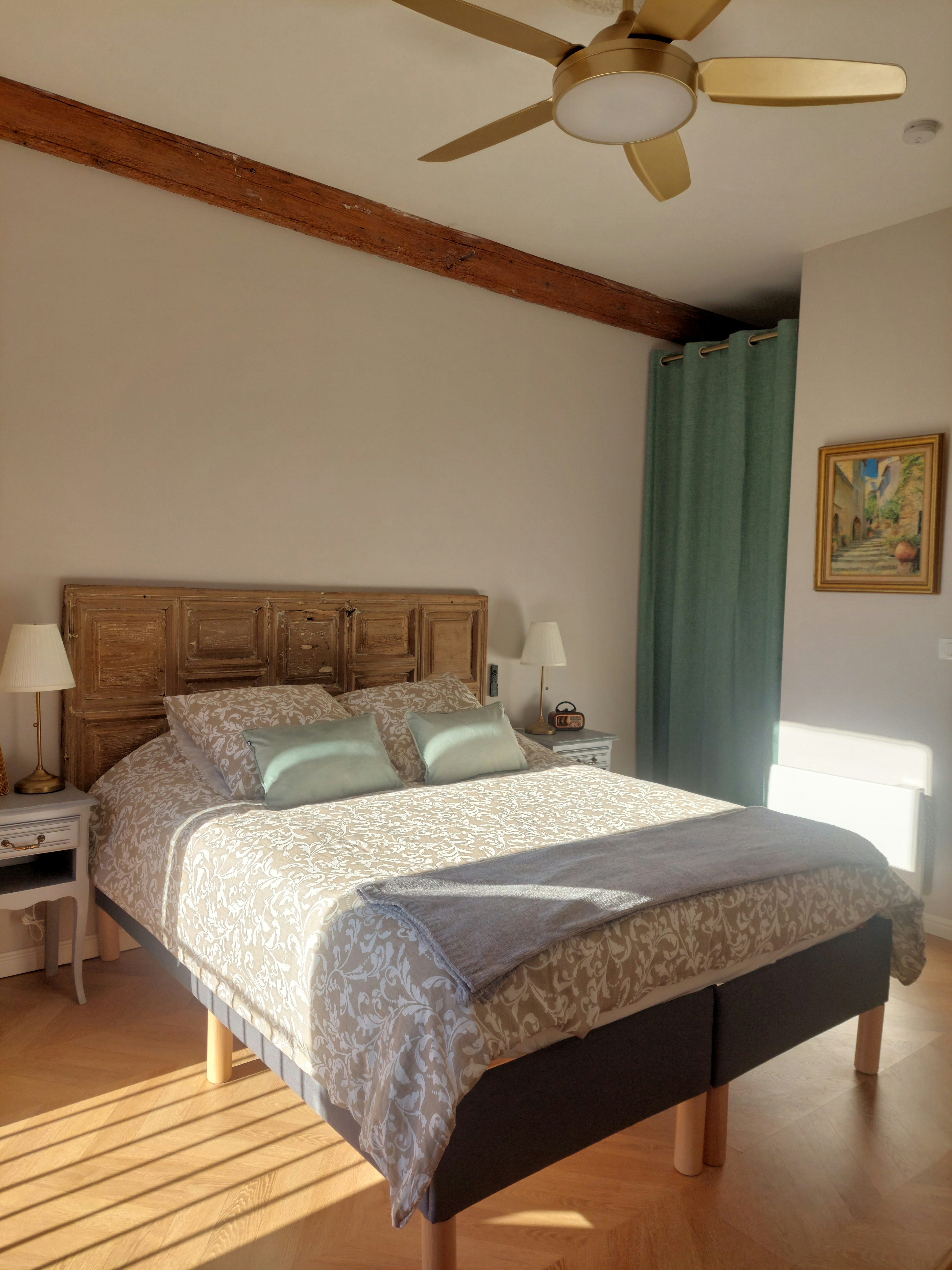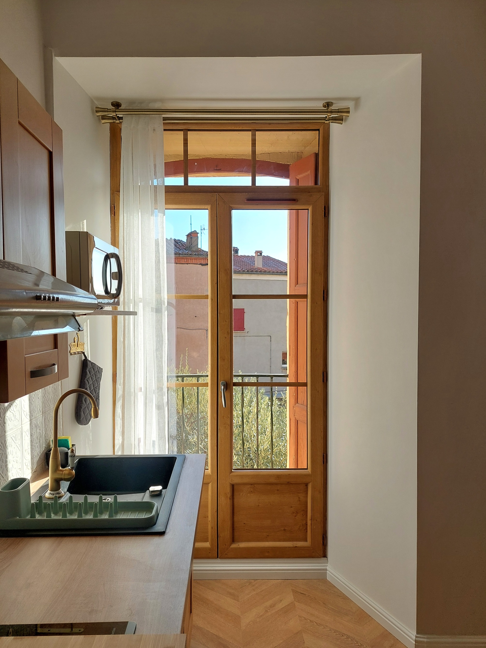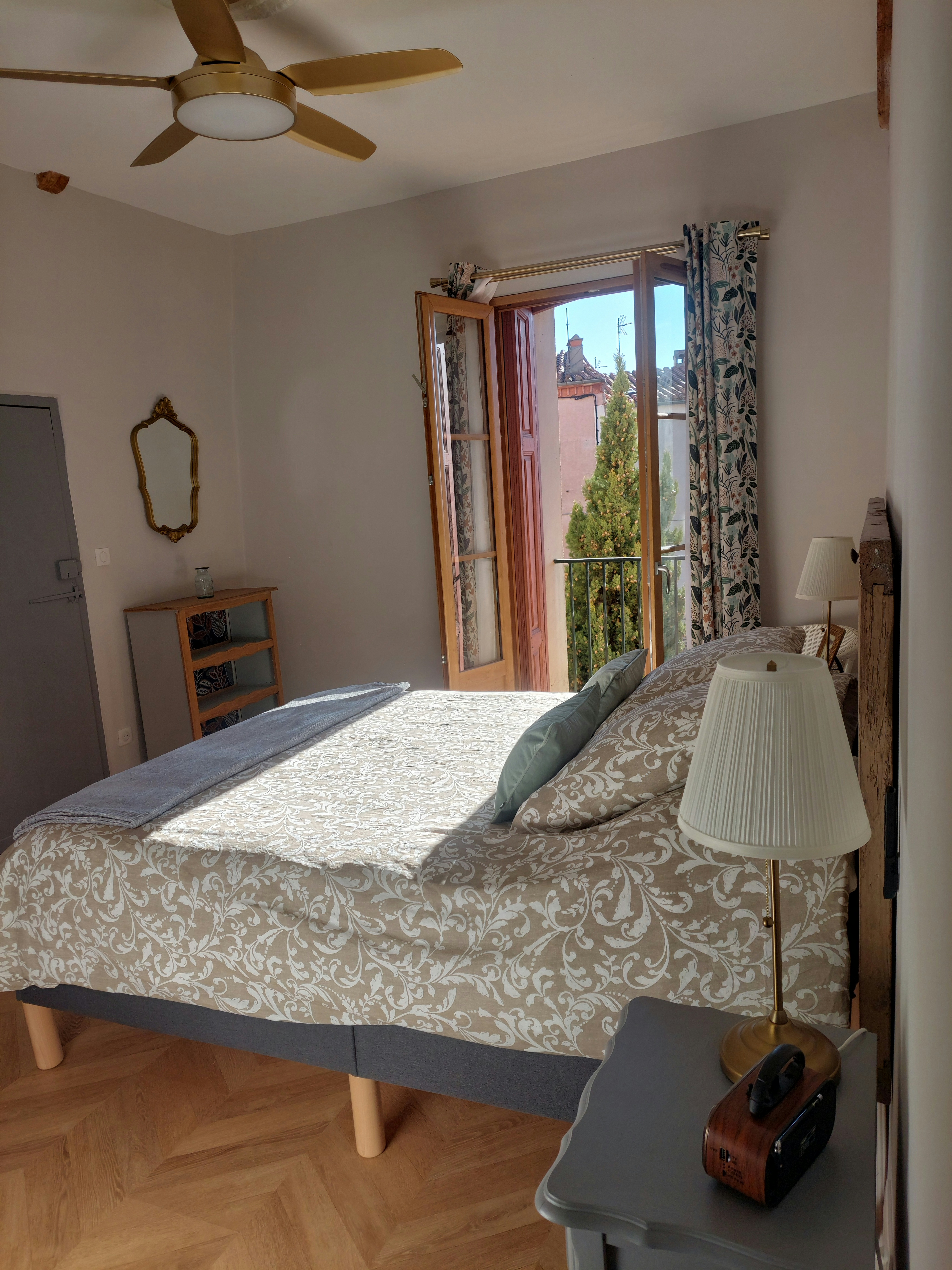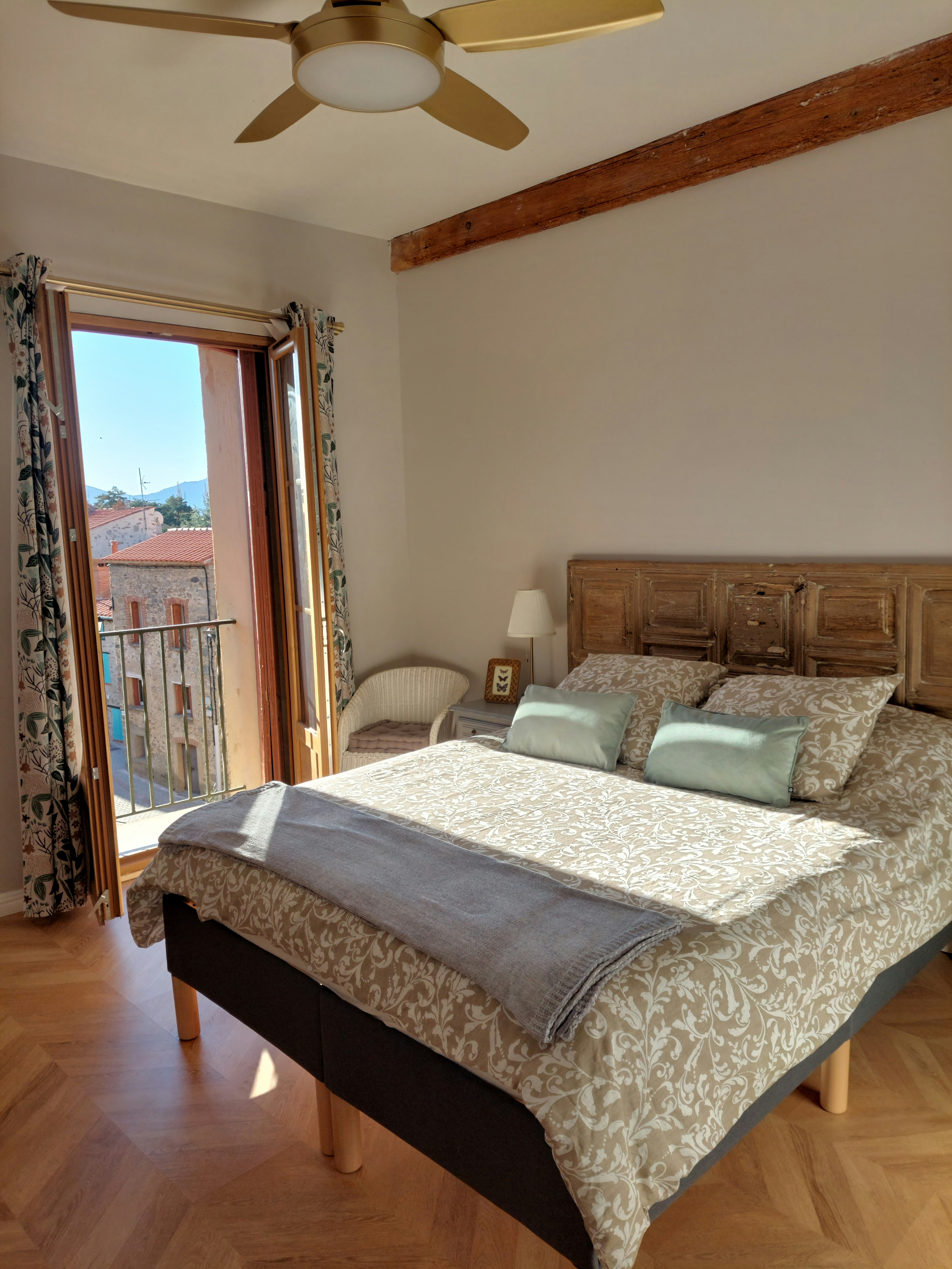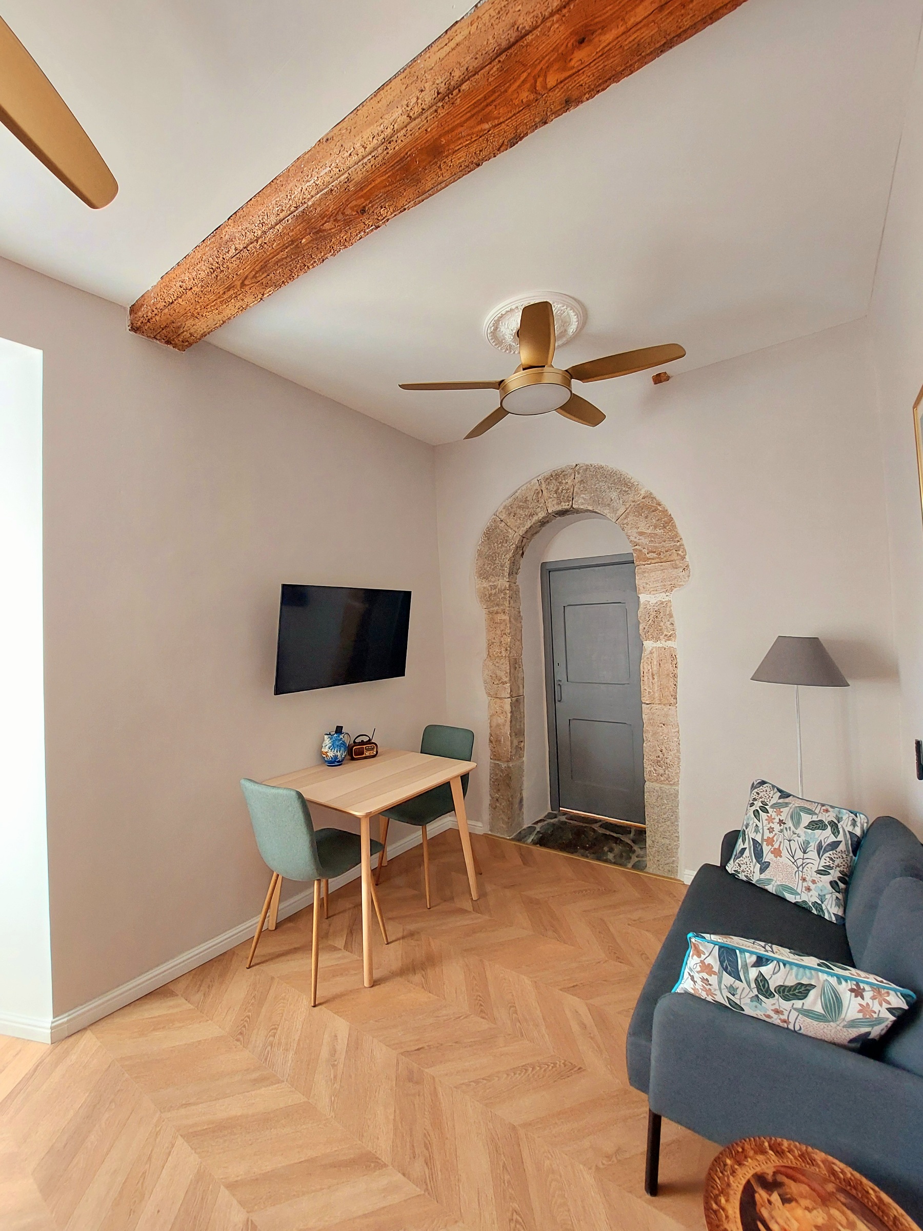 Appartement lumineux avec arche en granit & vue sur jardin d’oliviers Niché au 1er étage, cet appartement allie authenticité et confort moderne. Sa magnifique arche en granit, vestige des anciens couloirs du château, apporte un cachet unique et une atmosphère pleine de charme. Le logement comprend : Une cuisine équipée ouverte sur un coin salon cosy Une chambre séparée avec sa salle de bains privative Le couchage peut être aménagé en lit double ou deux lits simples, idéal pour un couple ou deux amis. Vous profiterez d’une belle exposition et d’une vue reposante sur les oliviers du jardin de l’Office de tourisme, juste en contrebas. Profitez de la salle de fitness mise à votre disposition. Les animaux de compagnie ne sont pas admis, afin de préserver la quiétude des lieux.