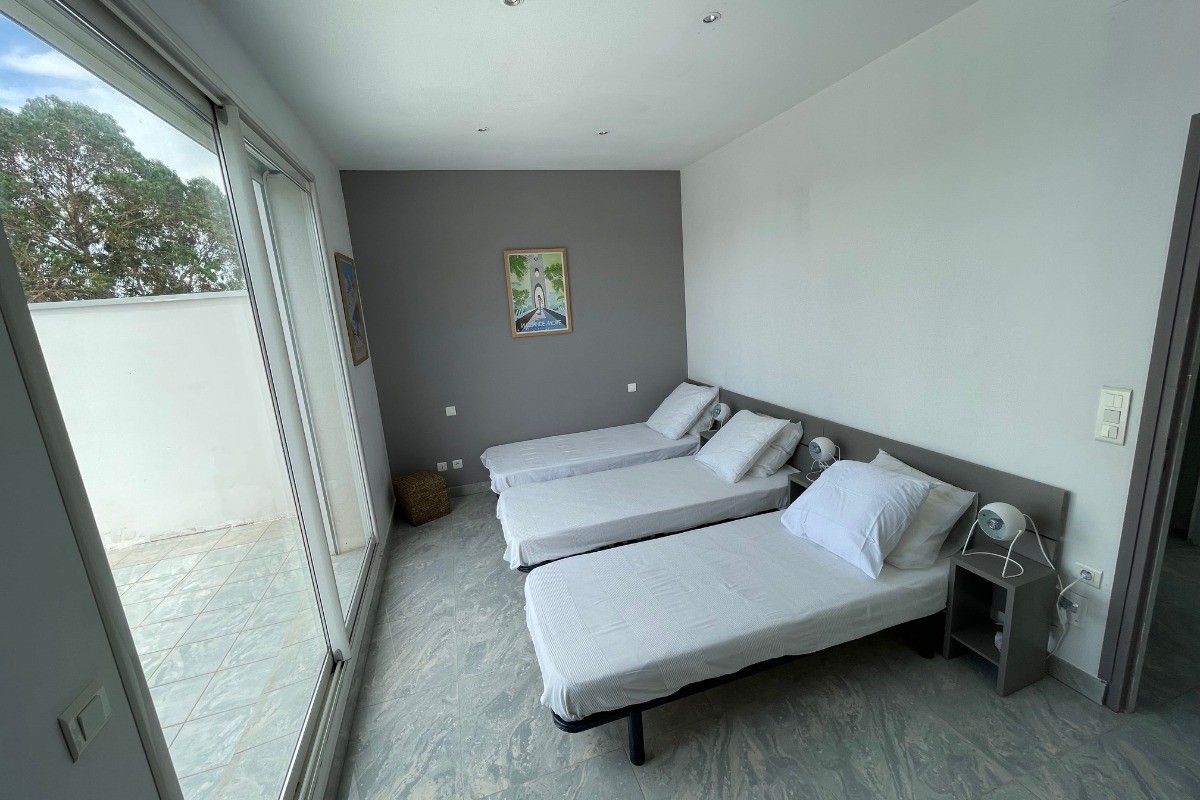 Villa de Luxe avec Piscine Chauffée à la Grande Motte – Idéale pour 7 Personnes Offrez-vous un séjour d’exception dans cette magnifique villa de 100 m² située à seulement 300 mètres de la plage de la Grande Motte. Alliant élégance et confort, cette maison de vacances propose des prestations haut de gamme dans un cadre privilégié. Profitez d’une piscine chauffée et couverte avec nage à contre-courant, d’un jardin privé aménagé et d’un barbecue pour des moments conviviaux en famille ou entre amis. L’intérieur de la villa a été pensé pour un confort absolu : climatisation intégrale, Wi-Fi haut débit, télévision avec câble et satellite. La cuisine entièrement équipée dispose de tout le nécessaire : lave-vaisselle, réfrigérateur-congélateur, four, micro-ondes, cafetière (expresso et filtre) et divers robots de cuisine. Côté nuit, la maison se compose de trois chambres situées à l’étage : Une chambre avec un lit double en 160 cm Une chambre avec un lit double en 140 cm Une chambre avec trois lits simples en 90 cm Deux des chambres bénéficient d’une terrasse privée avec vue dégagée. Une salle de bain avec double vasque et WC complète l’étage, tandis qu’une salle d’eau et des toilettes sont disponibles au rez-de-chaussée. Un garage permet de stationner vélos et équipements sportifs. Vous y trouverez également un lave-linge, un fer et une table à repasser ainsi que du matériel pour bébé (lit parapluie et chaise haute). Informations pratiques – Animaux acceptés – Option ménage : 100 € – Villa classée en meublé de tourisme (taxe de séjour réduite) – Accès nécessitant de monter plusieurs marches, pouvant être inadapté aux personnes à mobilité réduite Idéalement située à 4 km du centre-ville et du port, la villa vous permet de profiter pleinement des commerces, restaurants et nombreuses activités nautiques de la station balnéaire. Réservez dès maintenant votre villa de rêve à la Grande Motte et vivez des vacances inoubliables !
