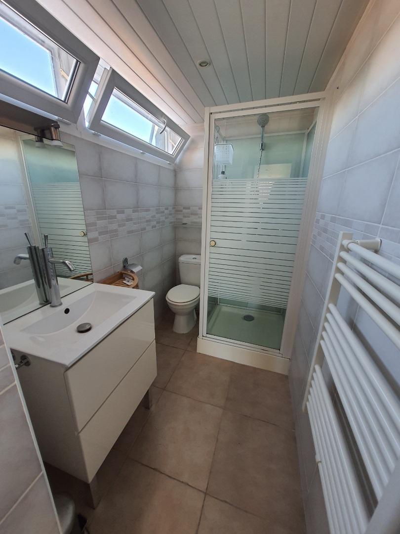 Ce duplex de 50 m2 est situé au 4ème et dernier étage. Il comprend une entrée, une cuisine ouverte sur le séjour, une salle d’eau, et à l’étage une chambre avec une rochelle. Sa terrasse de 16 m2 offre une vue culminante sur les toits et sur la collégiale St Jean.