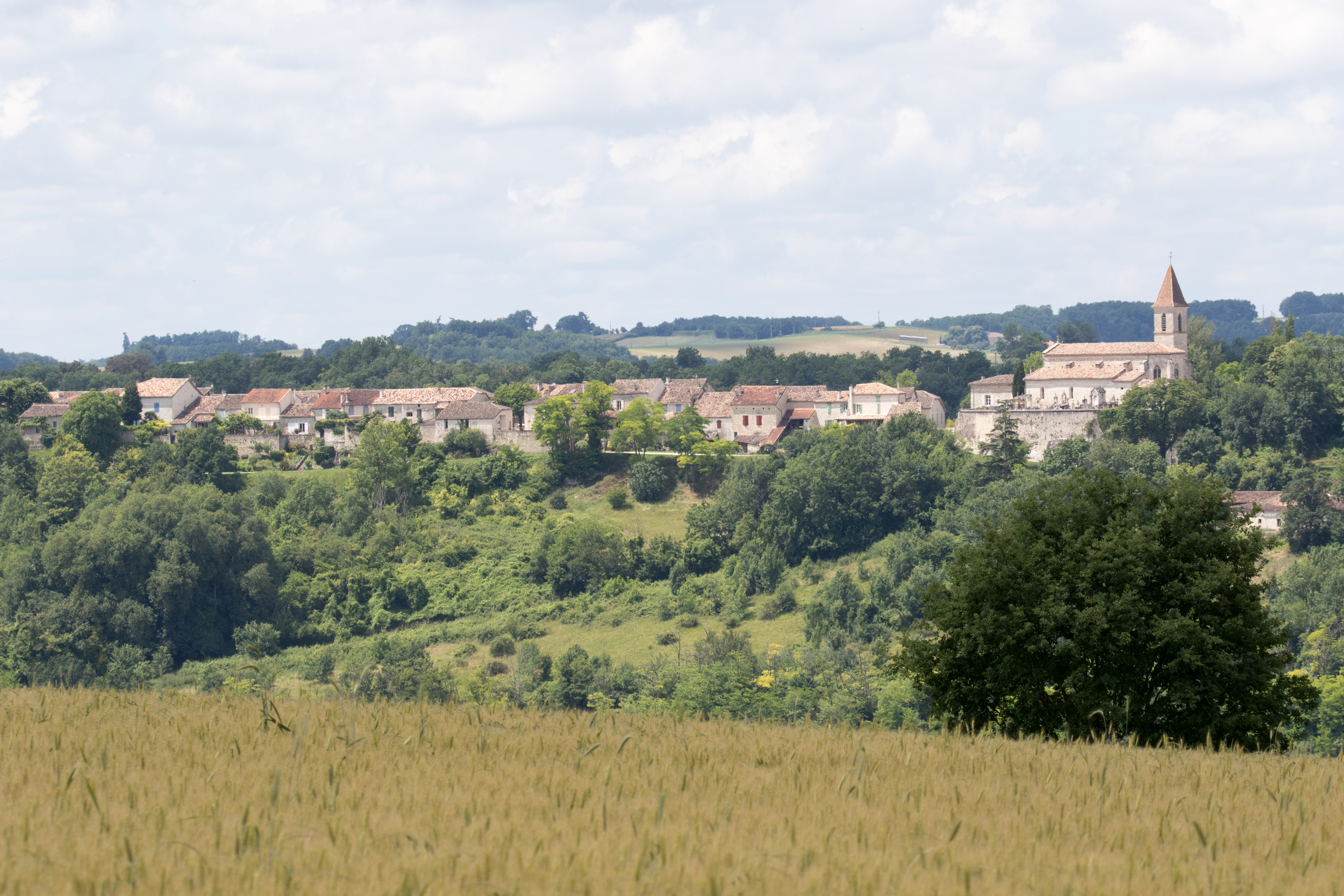 Aire de camping-car située dans une acienne bastide de pierres blanches et perchée sur un promontoire.