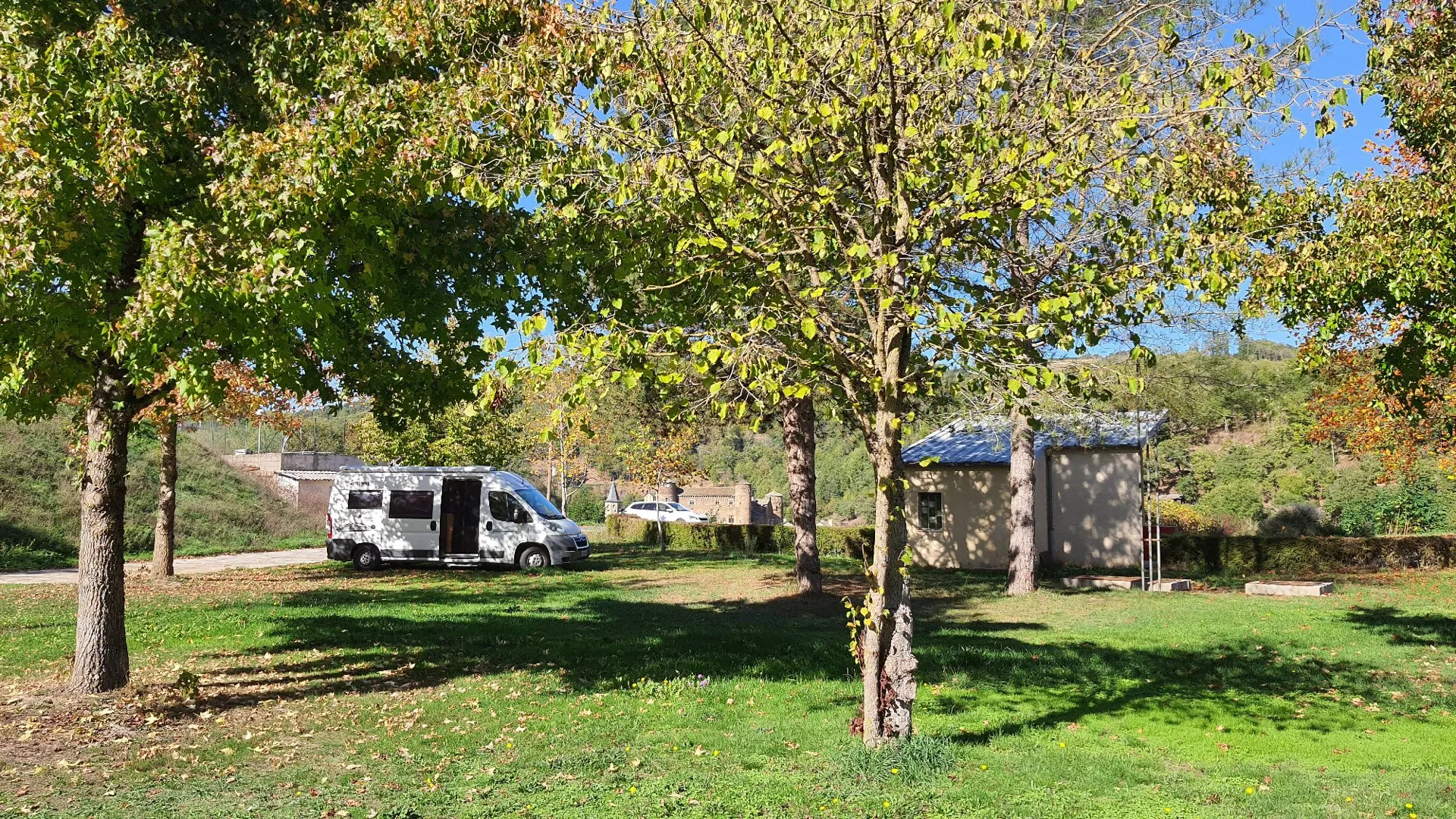Aire de camping-cars municipale gratuite avec vue imprenable sur le château de Coupiac et très proche du bourg.