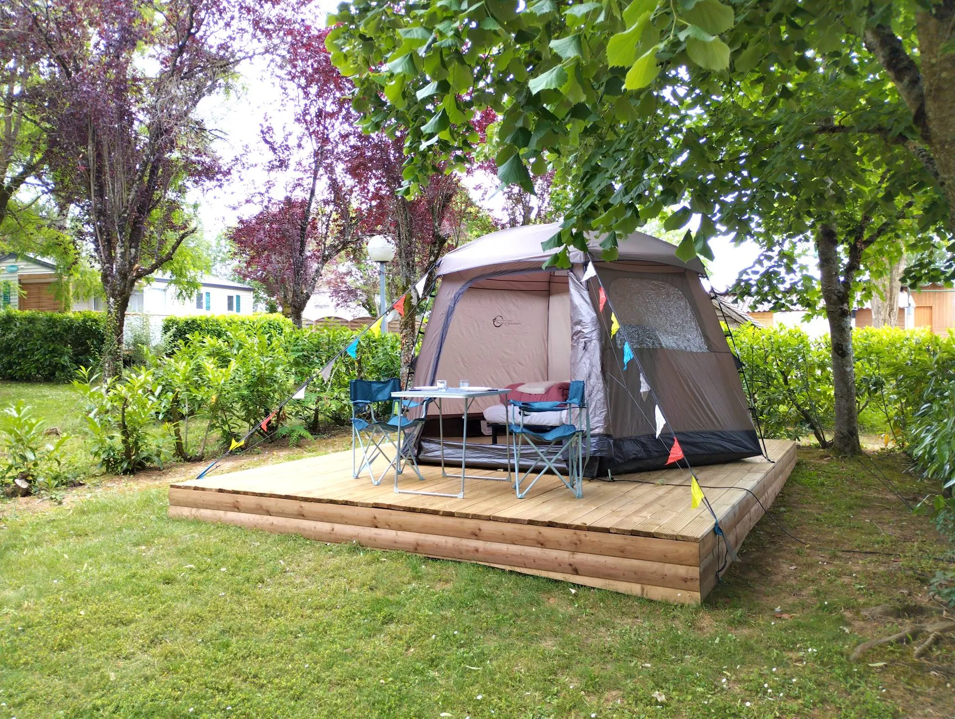 Profitez d’un emplacement très bien ombragé de 100 m² où votre tente vous attend déjà. Cette grande tente est entièrement équipée pour que vous puissiez y préparer votre repas et surtout passer une bonne nuit dans un vrai lit. A pied, à vélo, en moto, pas besoin de vous encombrer. Oreillers, couettes et linge de lit vous y attendent ainsi qu’un kit d’accueil. Cette tente peut accueillir 2 personnes. Vous pourrez attacher votre vélo à l’abri à côté de votre emplacement (voir pdf pour plus de détails).