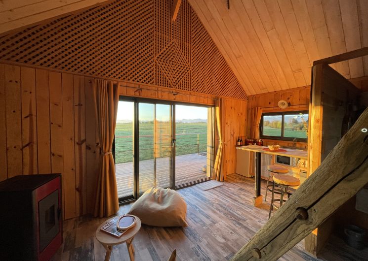 La mezzanine vous accueille avec son grand lit de 180 cm transformable en 2×90 si besoin. Vous pourrez admirer la canopée des frênes qui vous entourent ainsi que les chevaux ou les vaches qui s’ébattent dans les prés. En bas, 2 lits supplémentaires superposés de 90×200 vous permettront de profiter de votre séjour en famille ou entre amis. La salle de bain décorée avec goût est spacieuse. Les WC sont séparés. L’ensemble cuisine salon vous ouvre l’espace vers la vaste terrasse ombragée et son bain nordique privatif. Laissez-vous alors bercer par le son du ruissellement du Lizon.
